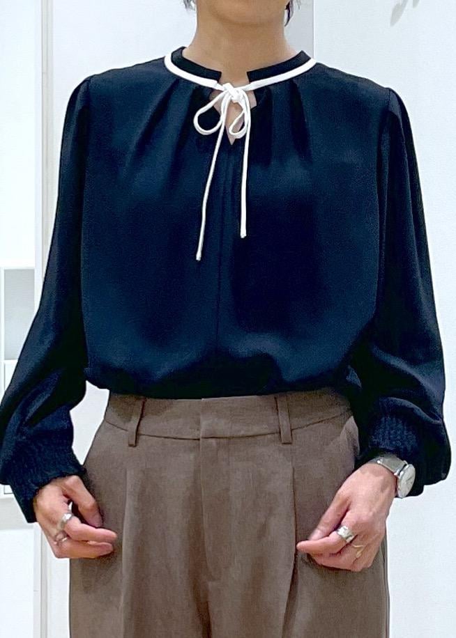 ROPÉ PICNIC【前後2WAY】【WEB限定カラー】配色リボンブラウス/通勤対応ネイビー系 / M¥3,993レビュー程よいゆとりがあるサイズ感で、体のラインを拾いにくいです。袖口ゴム仕様なので袖を上げても腕に溜まりやすい為、袖丈のアレンジができます◎