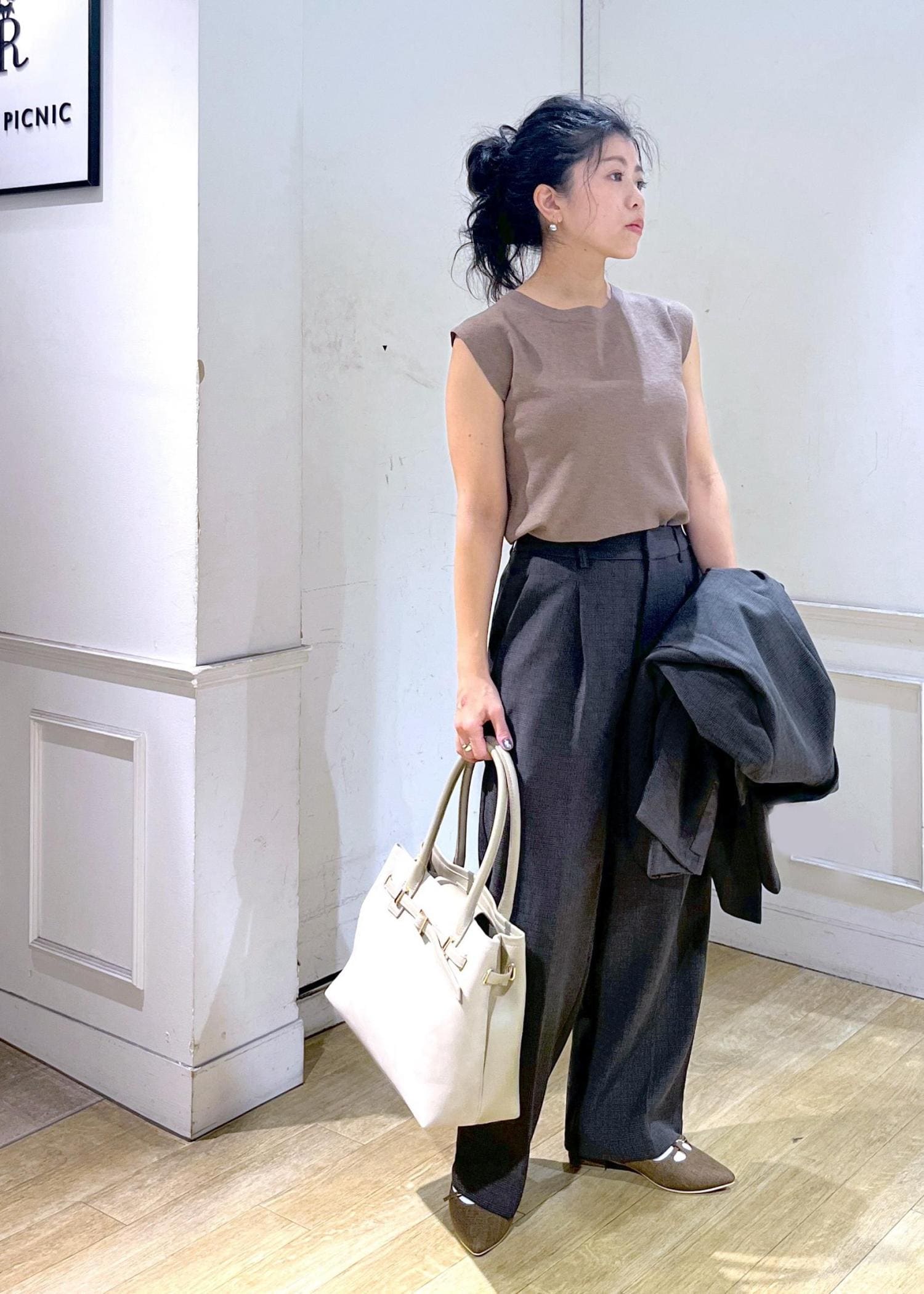 ブラウン差し色でぐっと秋の先取りですが、すぐに着るならまだインナーはノースリーブがお勧めですー