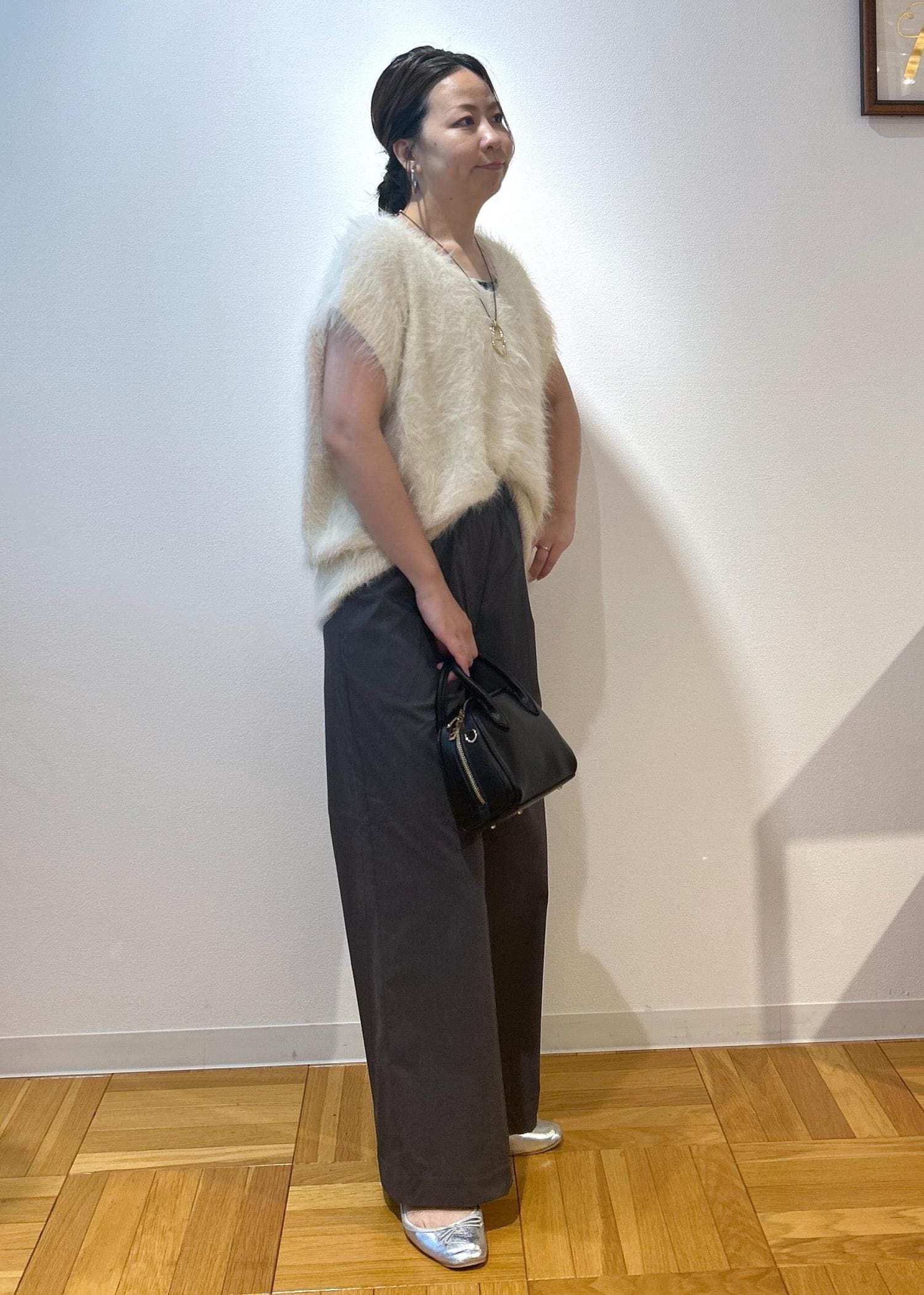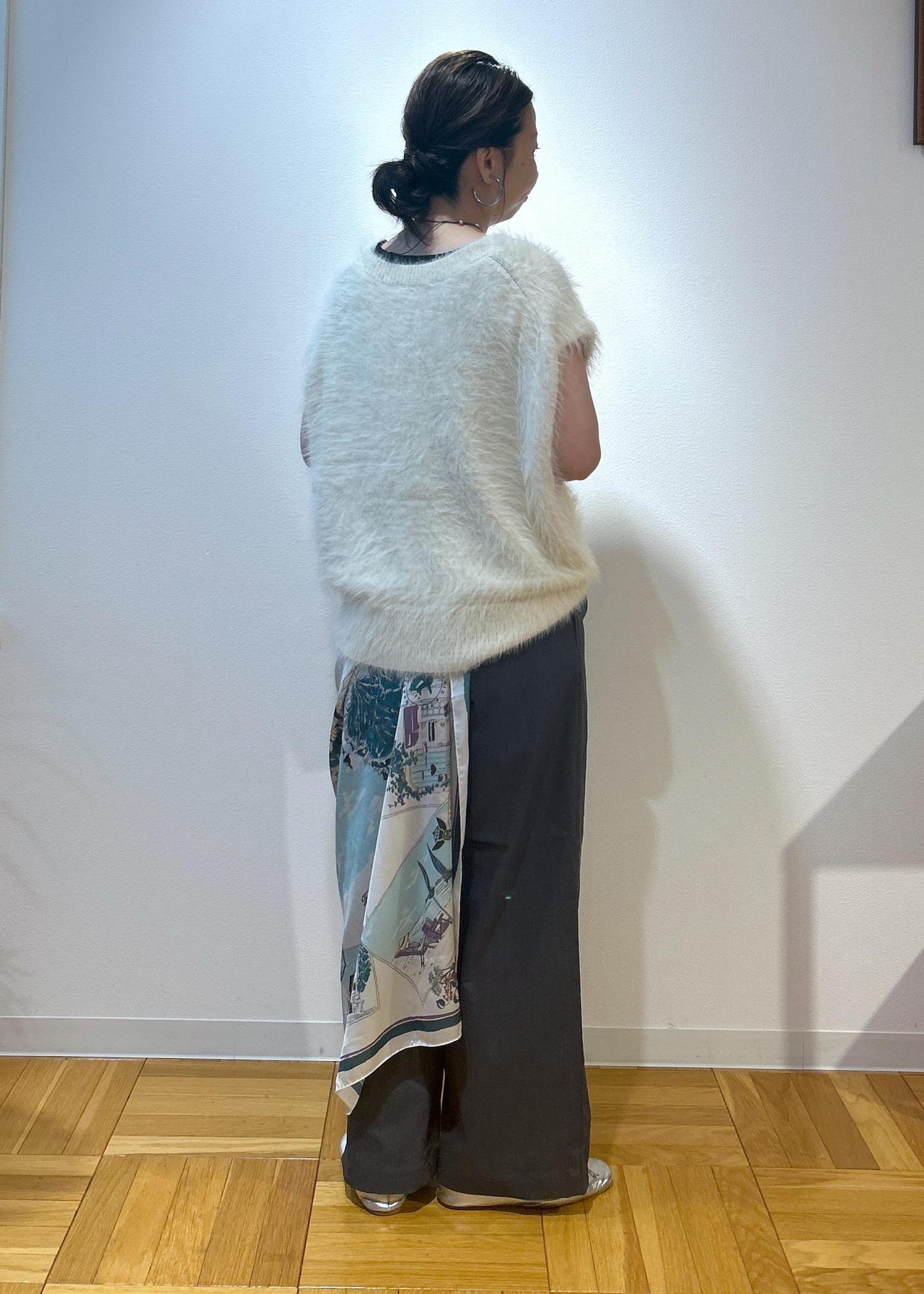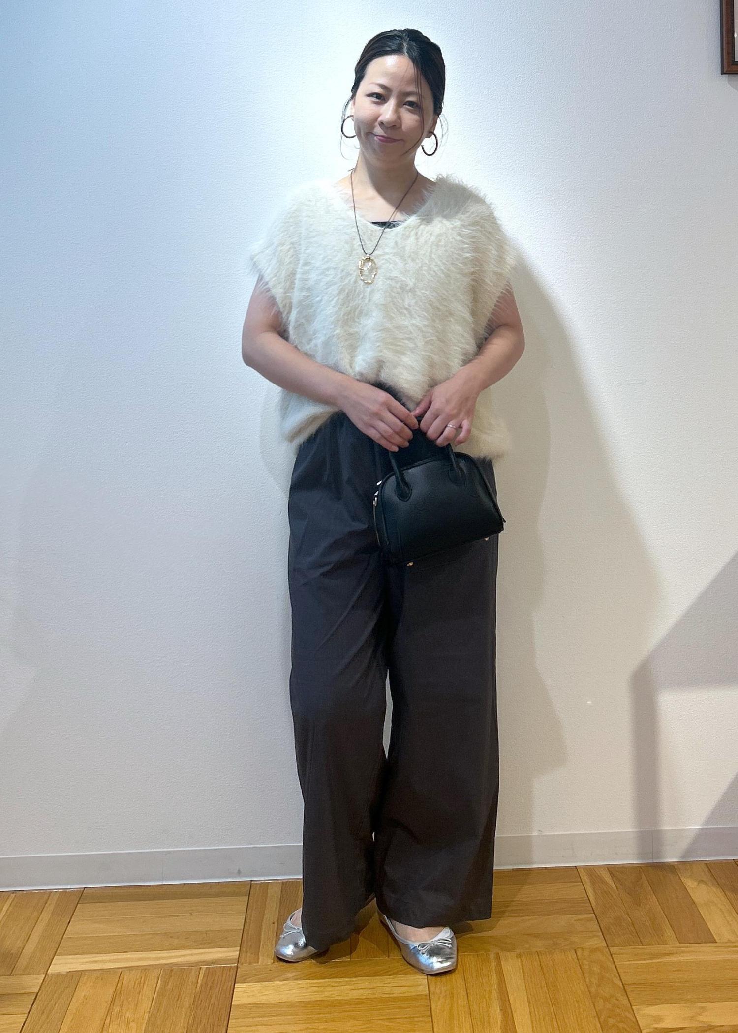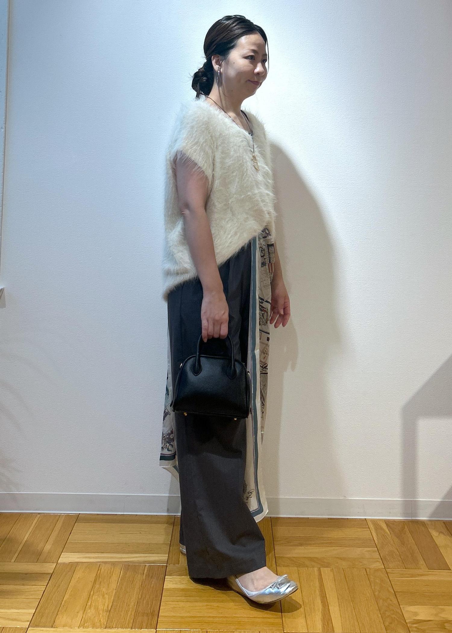シャギーは見ててもふわふわ感じるけど、着るとより素材感が着心地よく1枚でサマになるアイテムです。白✖️パンツで甘辛ミックススタイルにしてみました。スカーフ合わせるとより華やかになります。