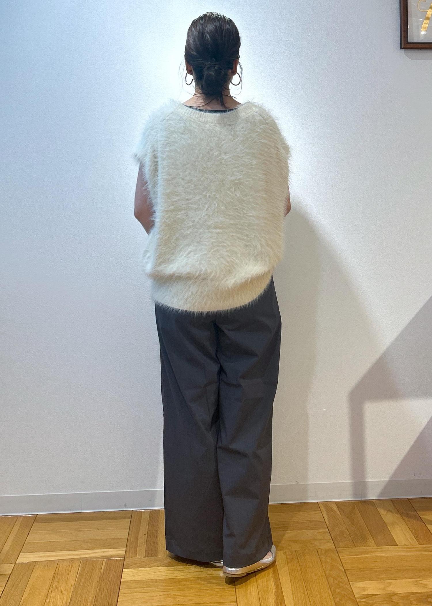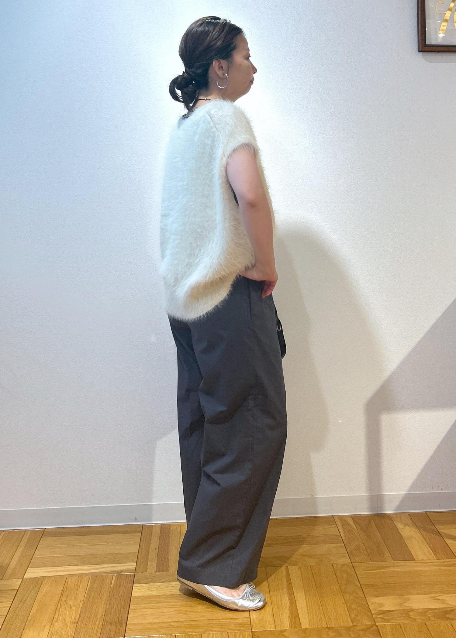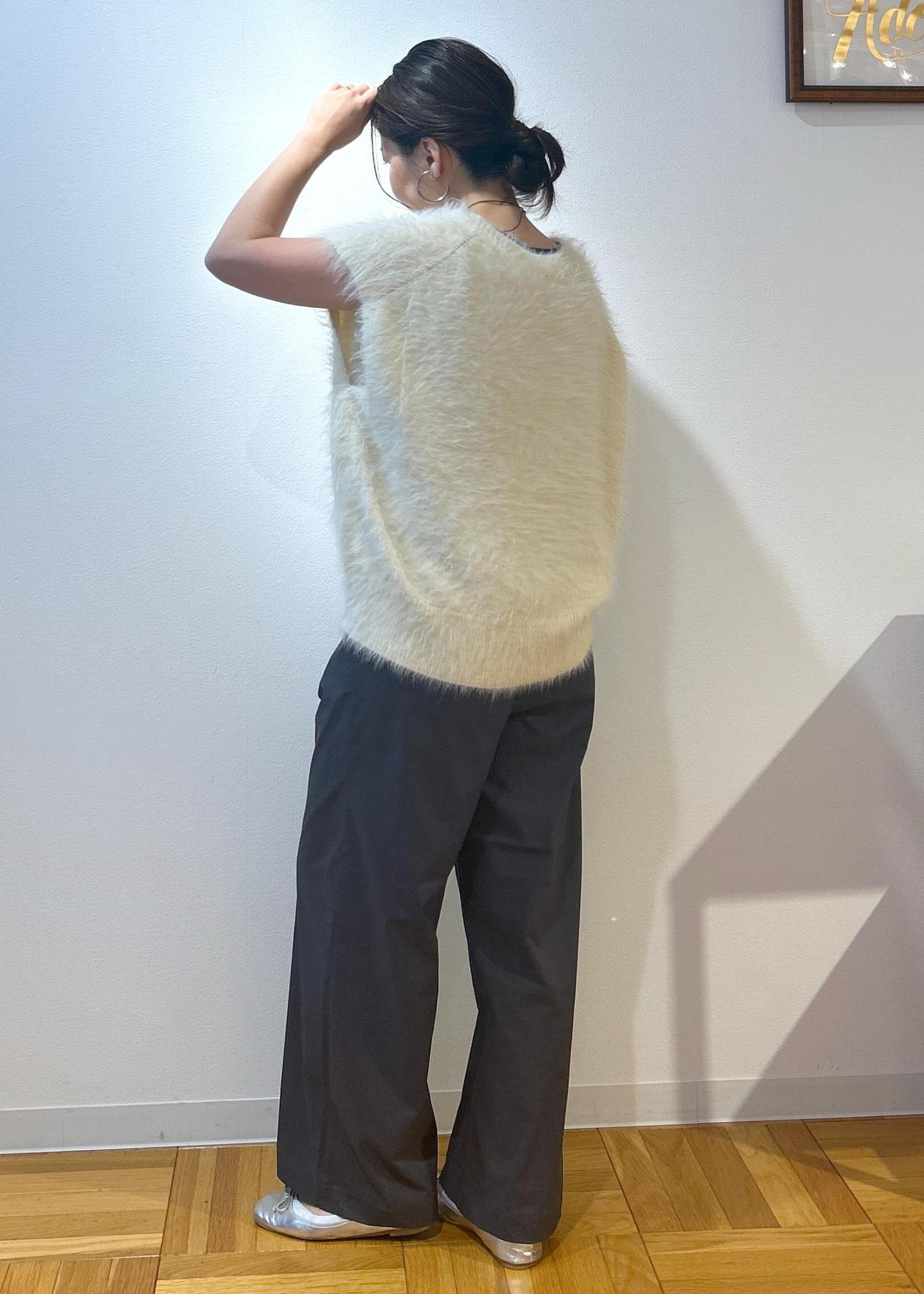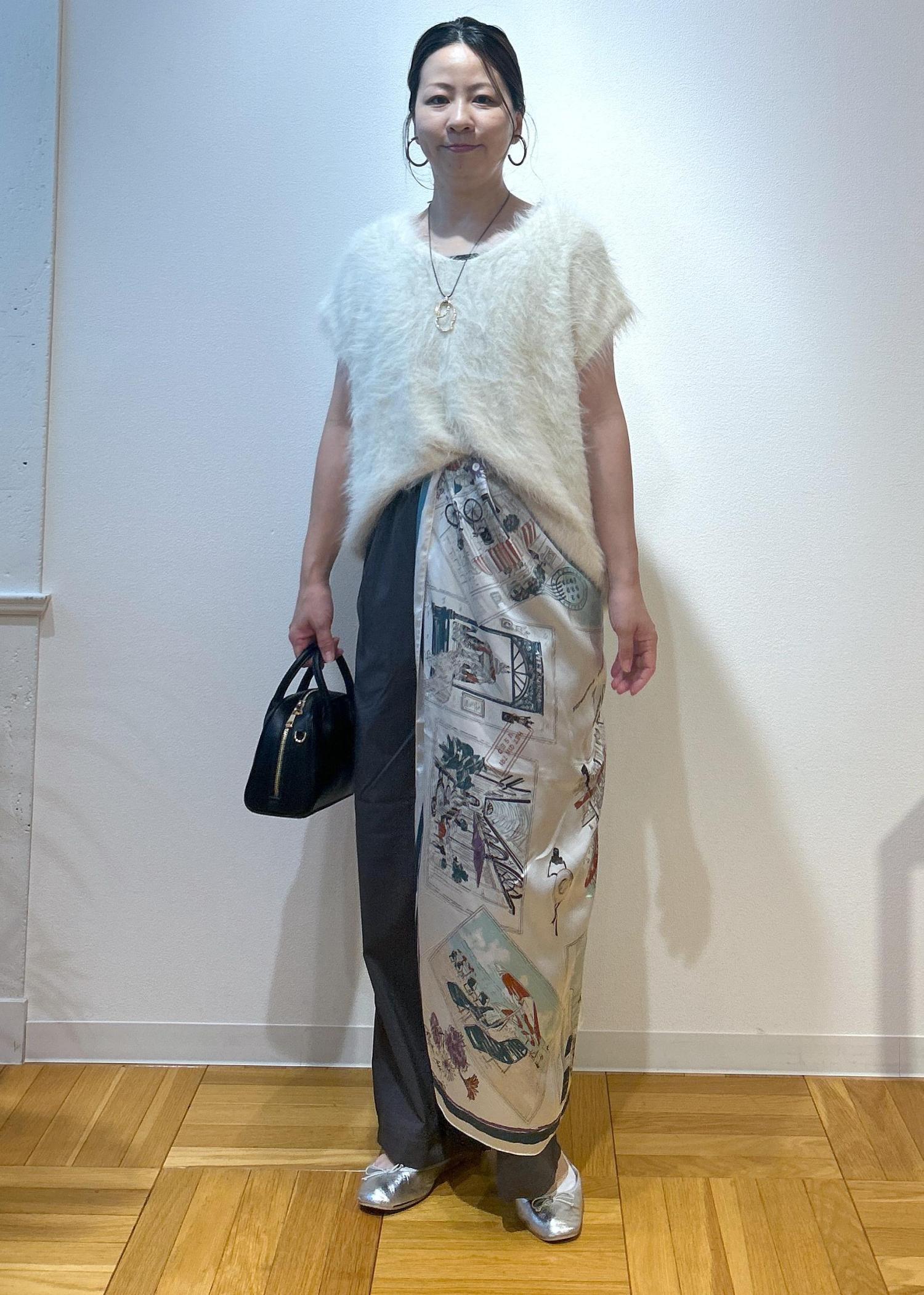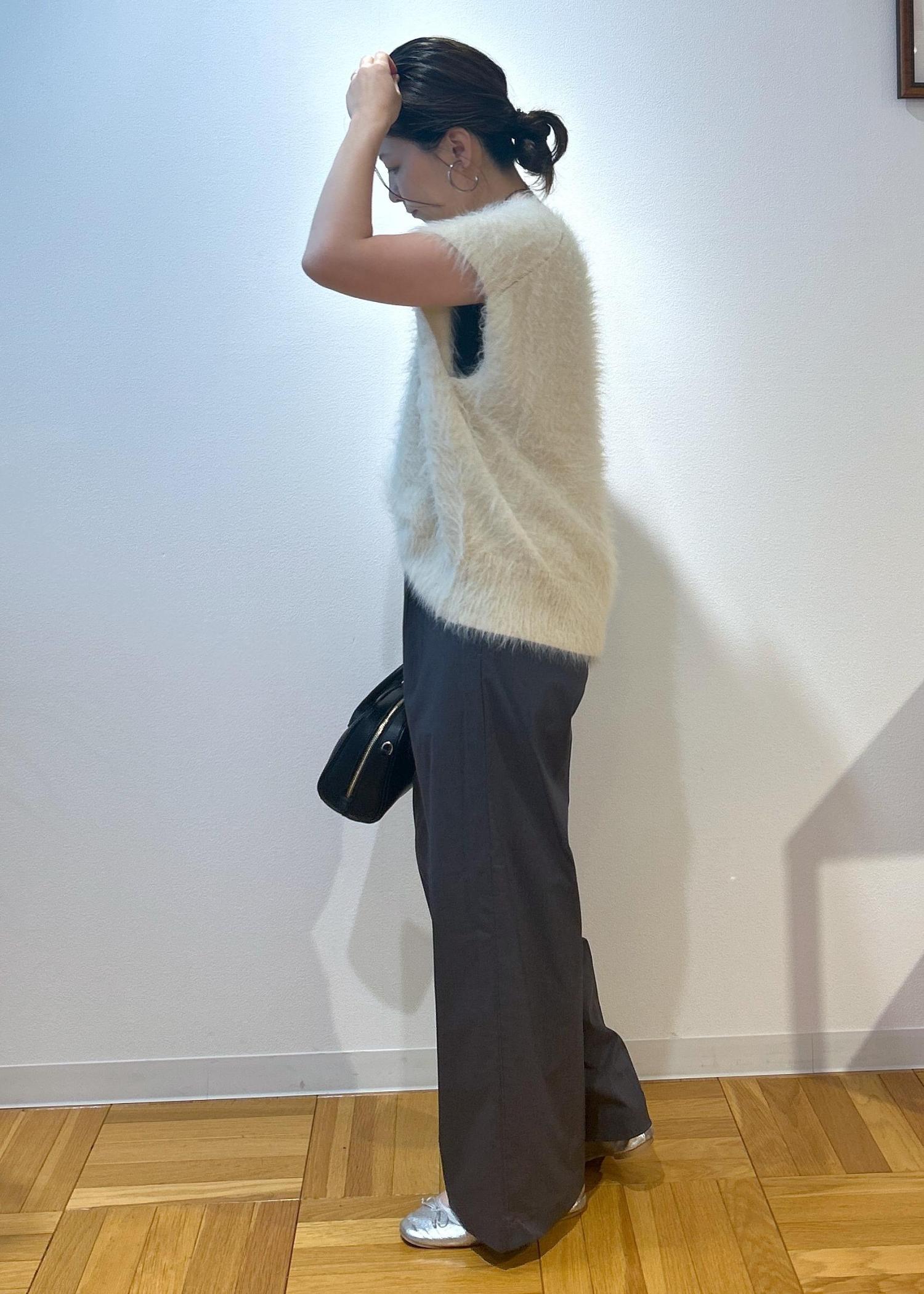 シャギーは見ててもふわふわ感じるけど、着るとより素材感が着心地よく1枚でサマになるアイテムです。白✖️パンツで甘辛ミックススタイルにしてみました。スカーフ合わせるとより華やかになります。