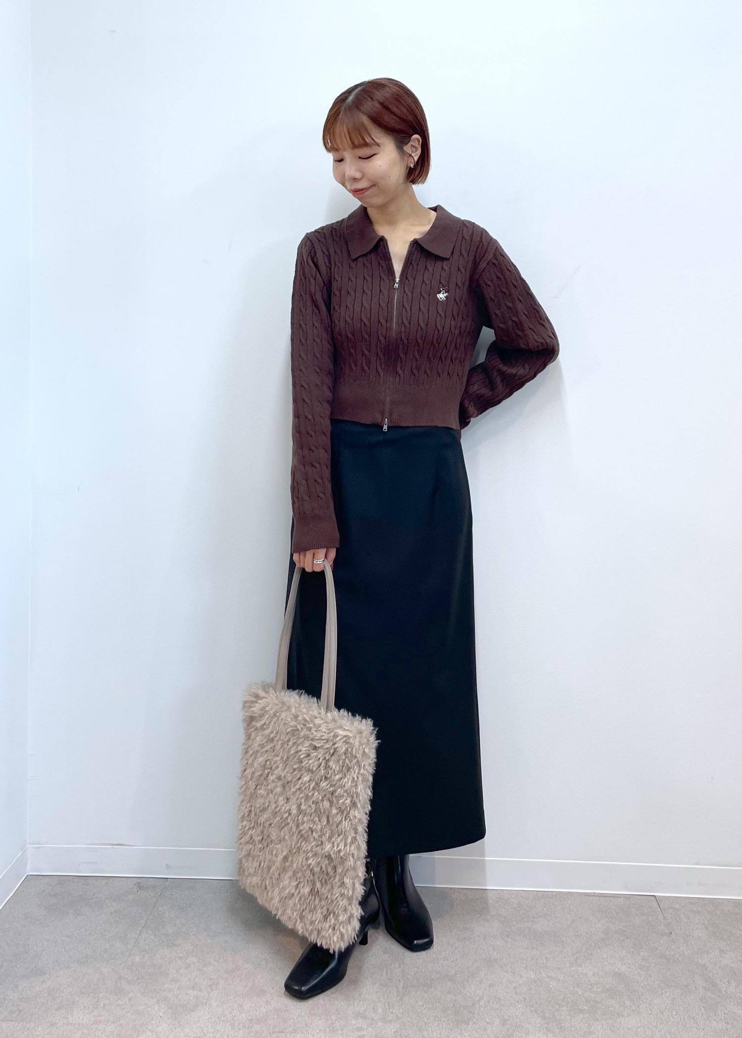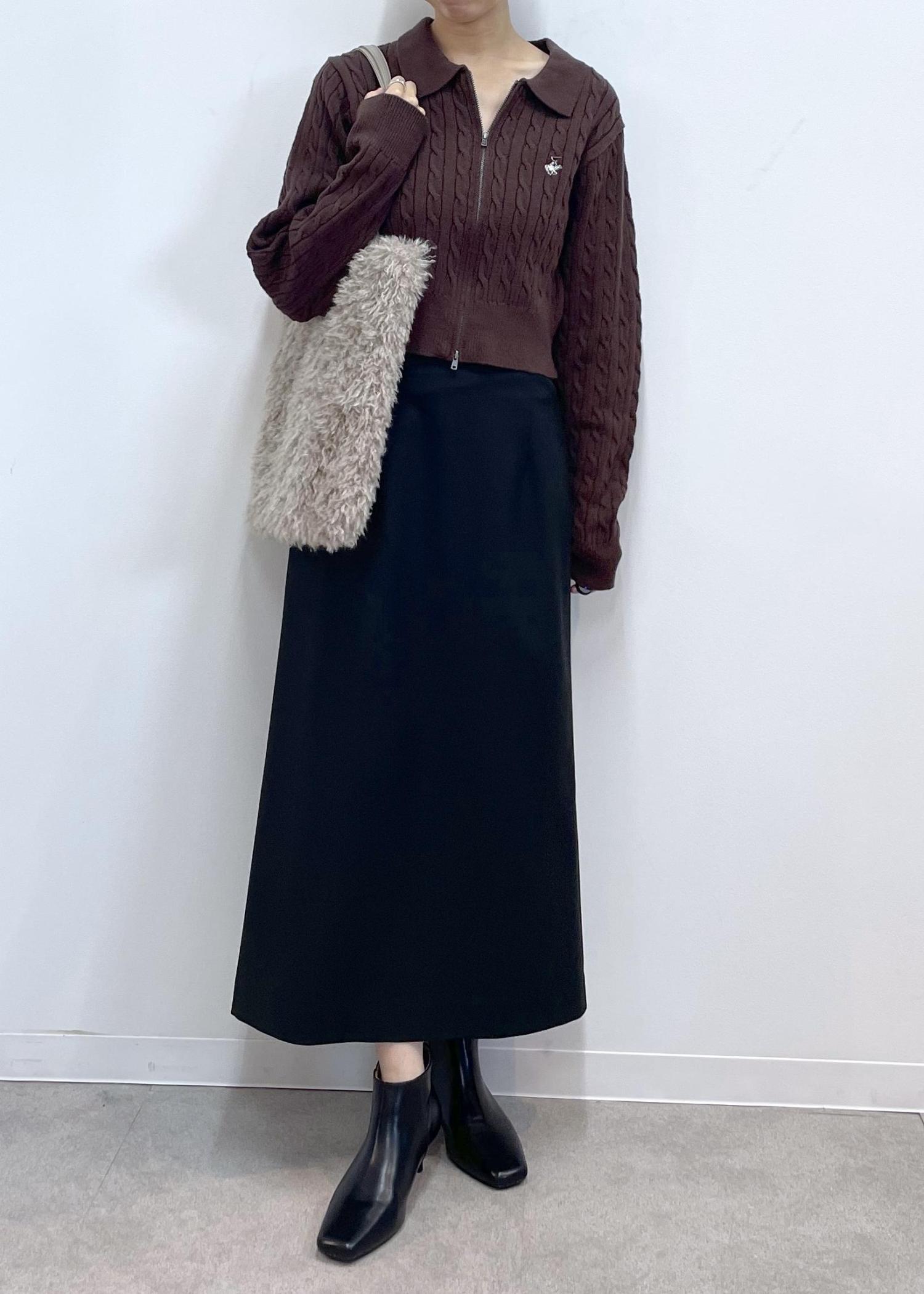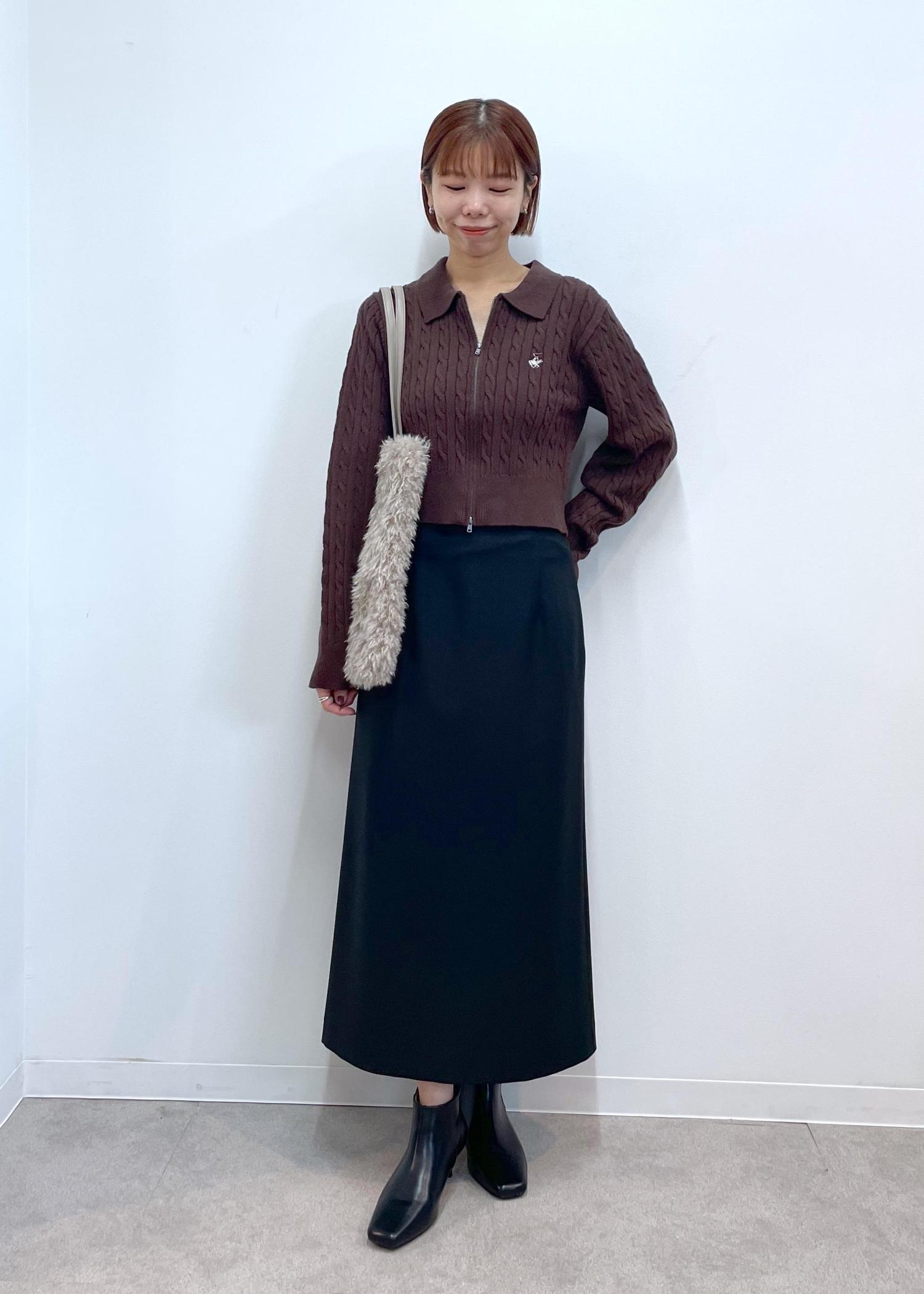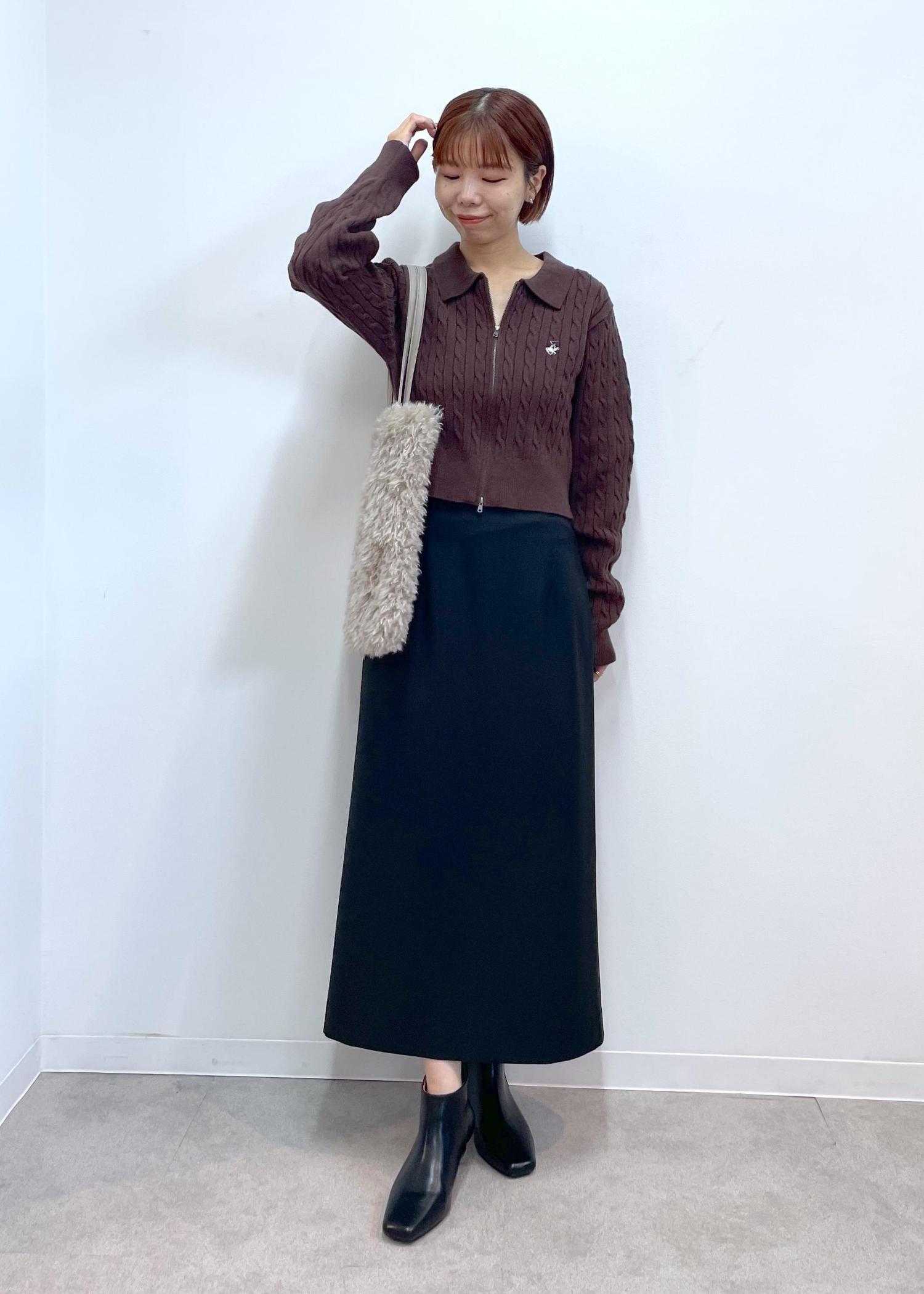 すっきりとした着丈のクロップドカーディガンに、ナロースカートを合わせた秋のトレンドコーデ