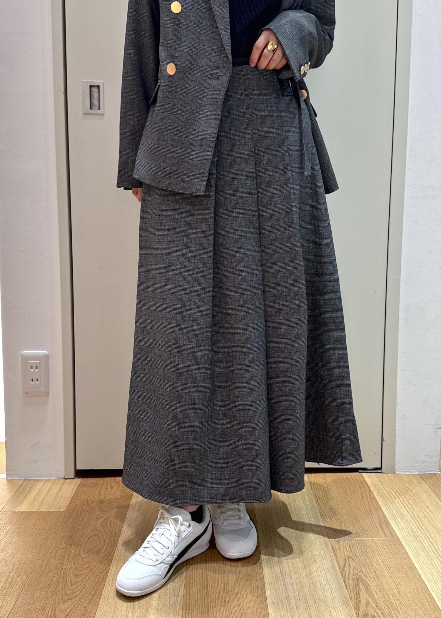 カチッとしたジャケットに、プリーツスカートを合わせたきれいめカジュアルコーデです。