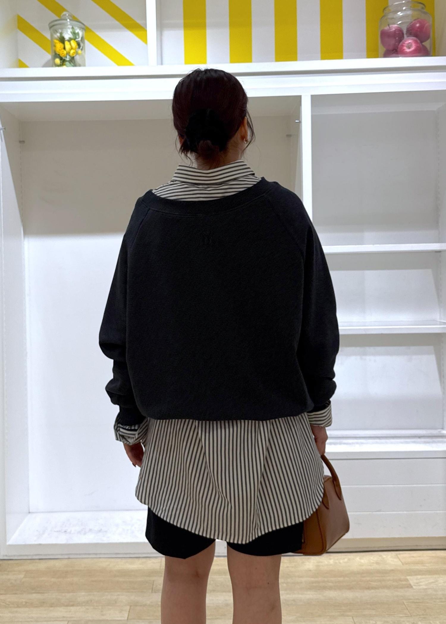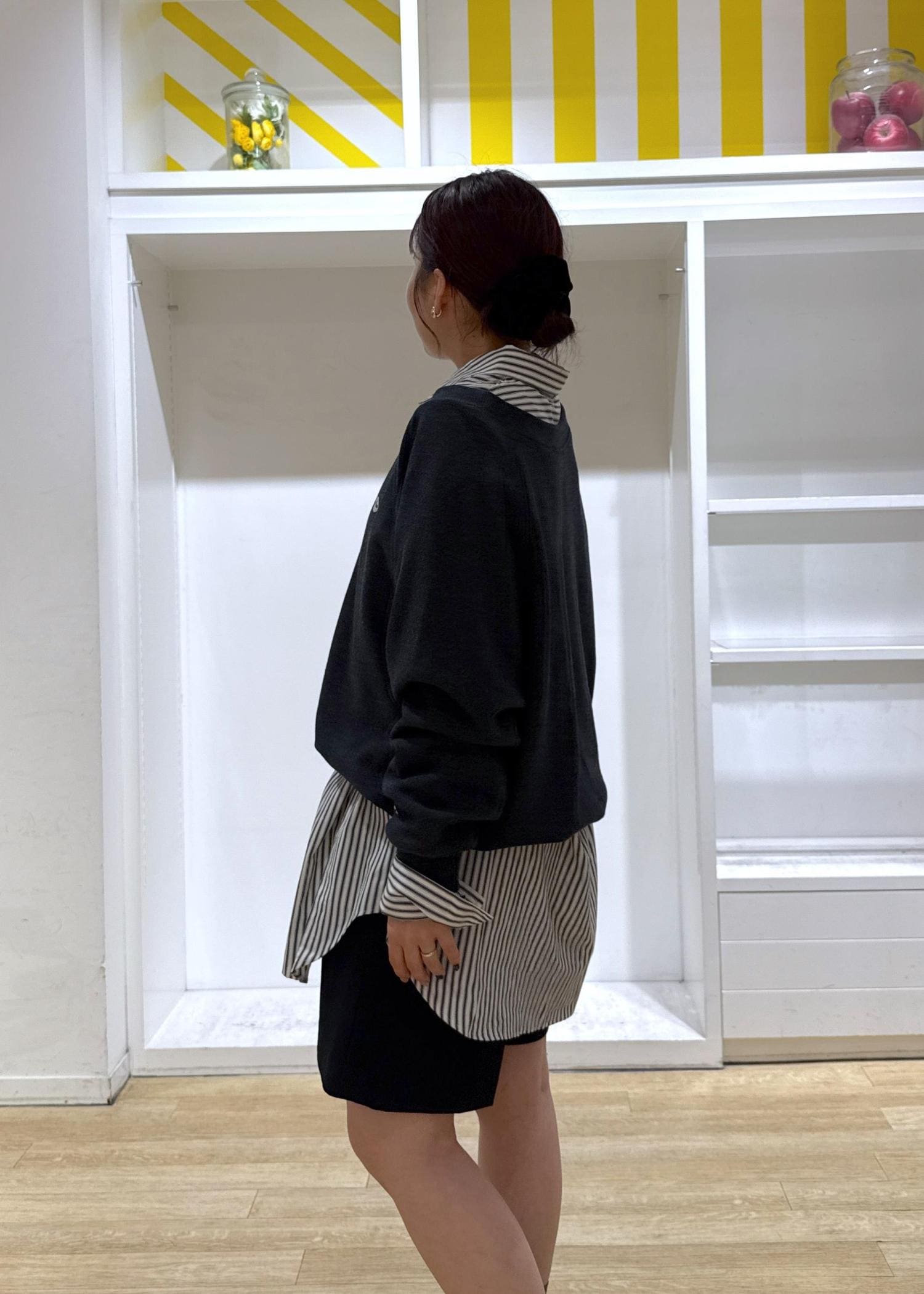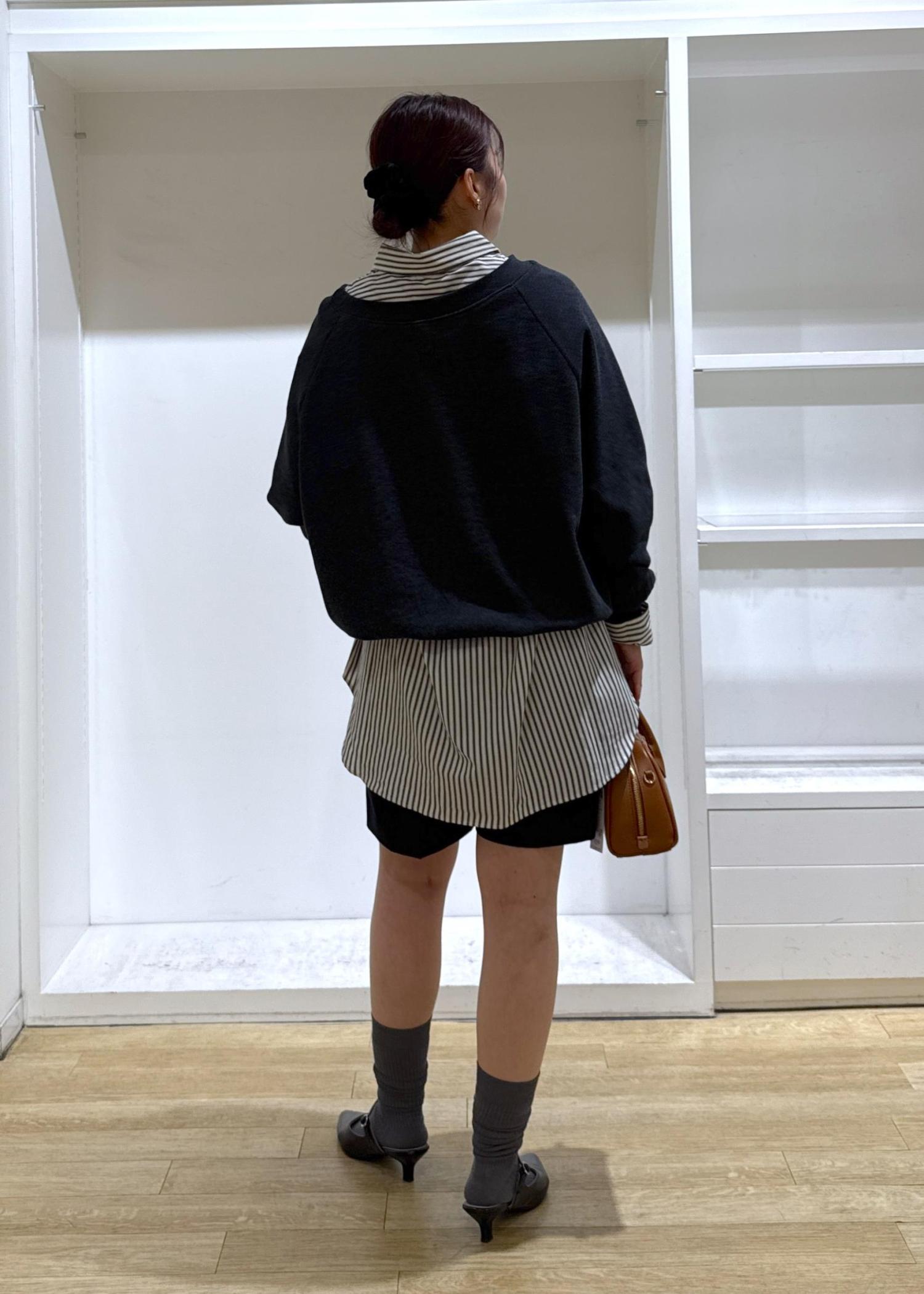 ワンショルダーとボートネックと2wayで使えるネックで、女性らしさもあるデザインです。程よいオーバーサイズなのでレイヤード使いもしやすそうでした。ボートネックで着用して、キャミソールの紐がギリギリ見えないぐらいのあきです。
