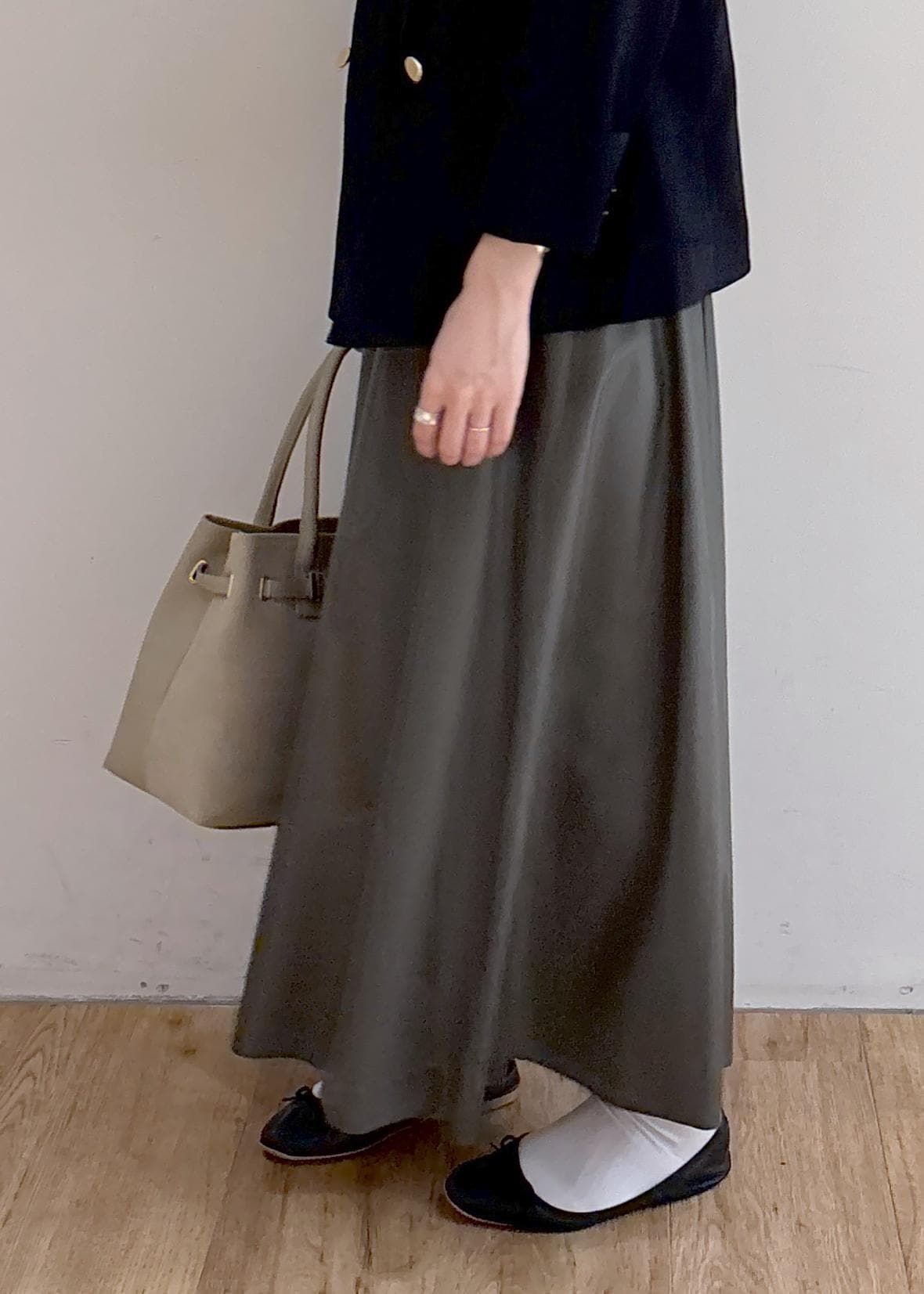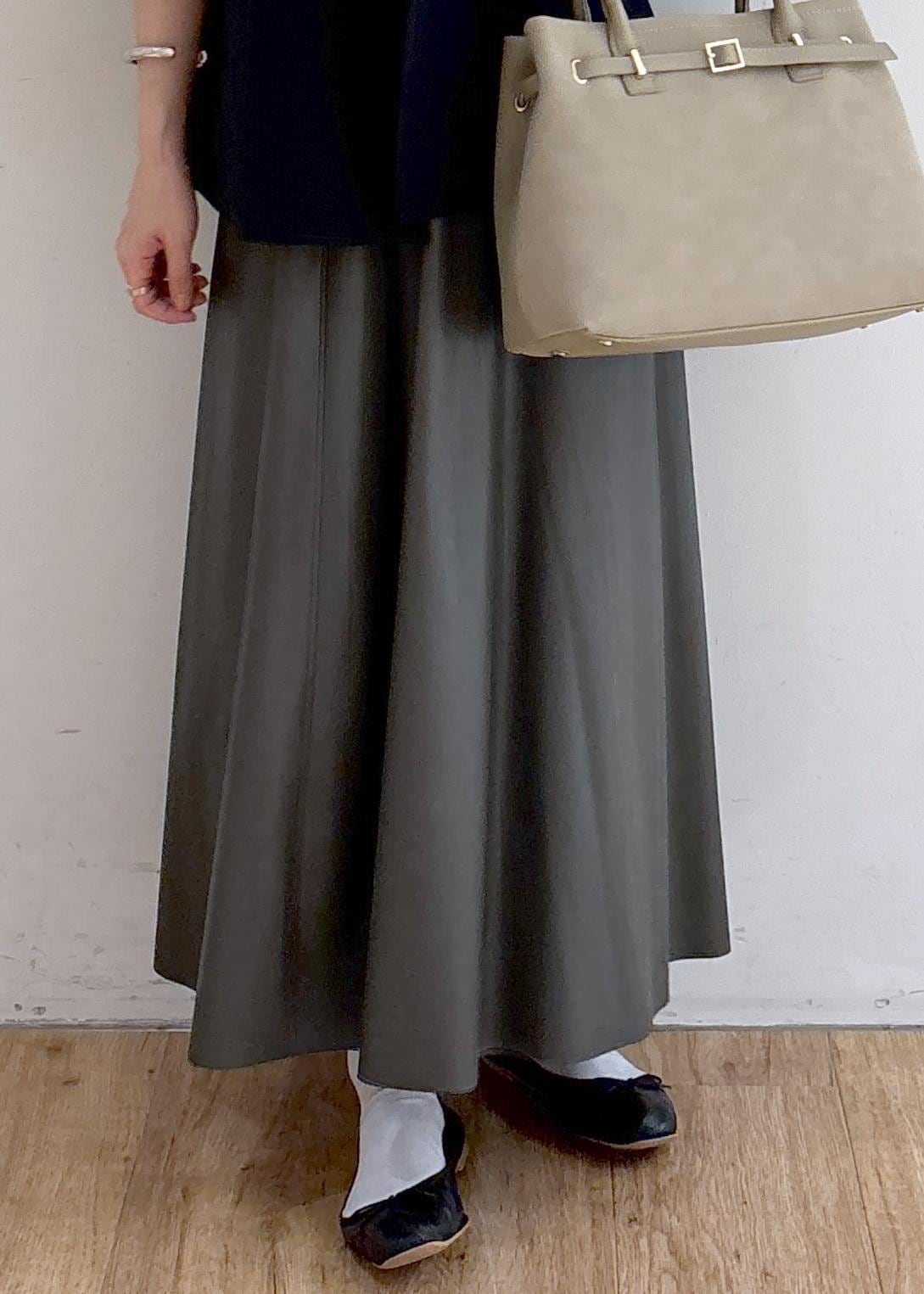 ROPÉ PICNICシンセティックレザーフレアロングスカートカーキ / S¥4,994レビュー記事が見た目以上に軽く薄めです。155cmSサイズ着用でジャストウエストだと足首が見える丈です。ウエストが緩めなので少しウエスト位置から落ちると、もう少し長いです。