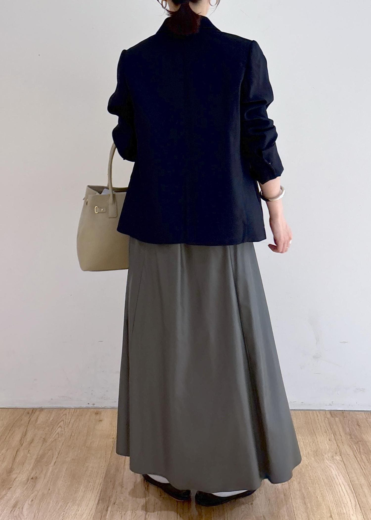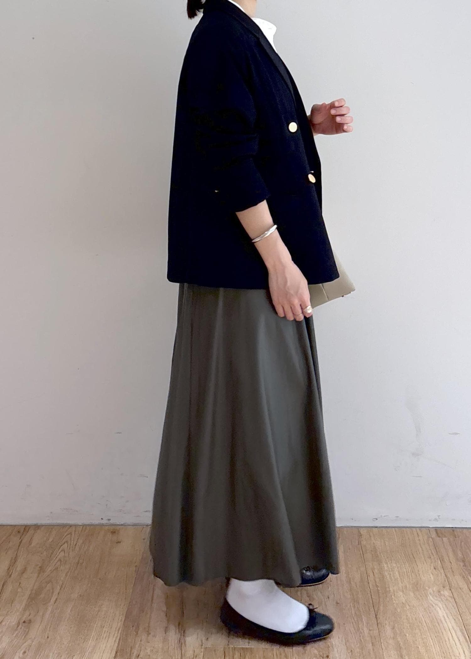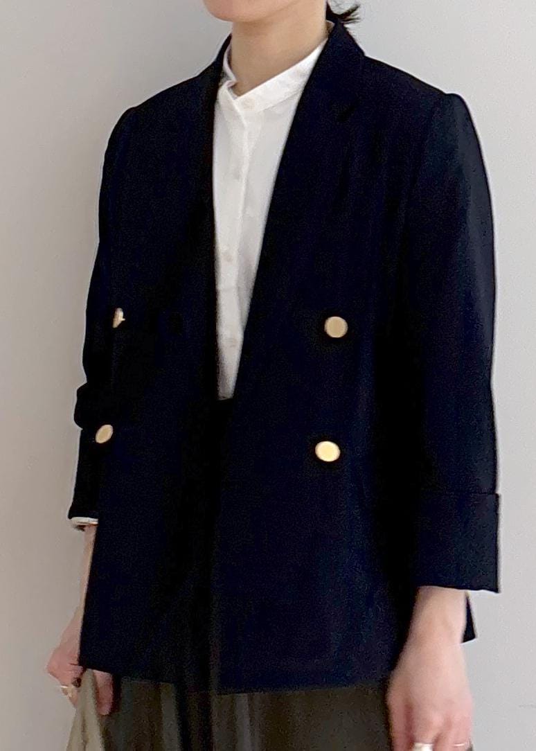 金ボタンジャケットを使ったお仕事スタイルです。白のブラウスを着用し、全体的に重くならないようにしました◎