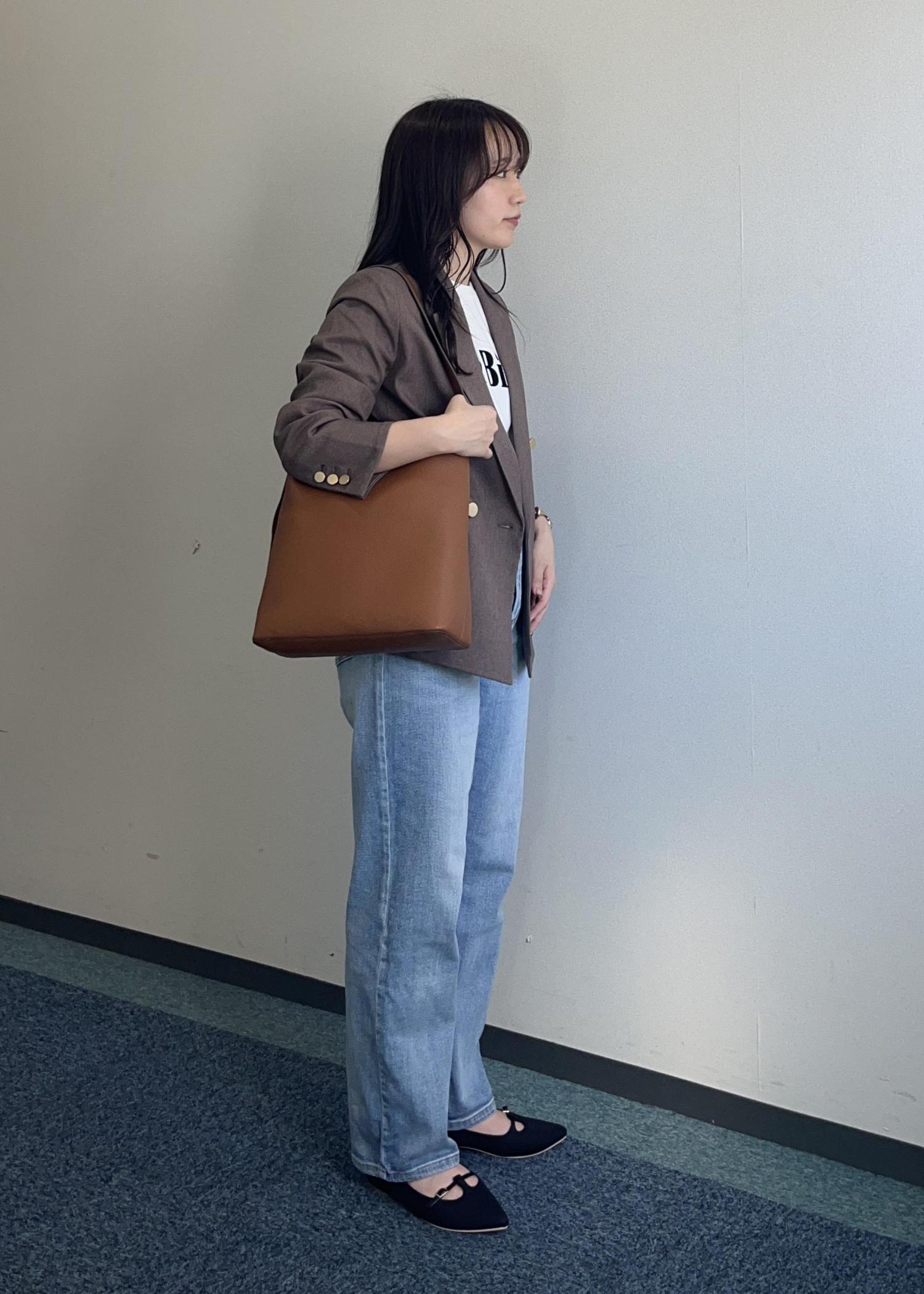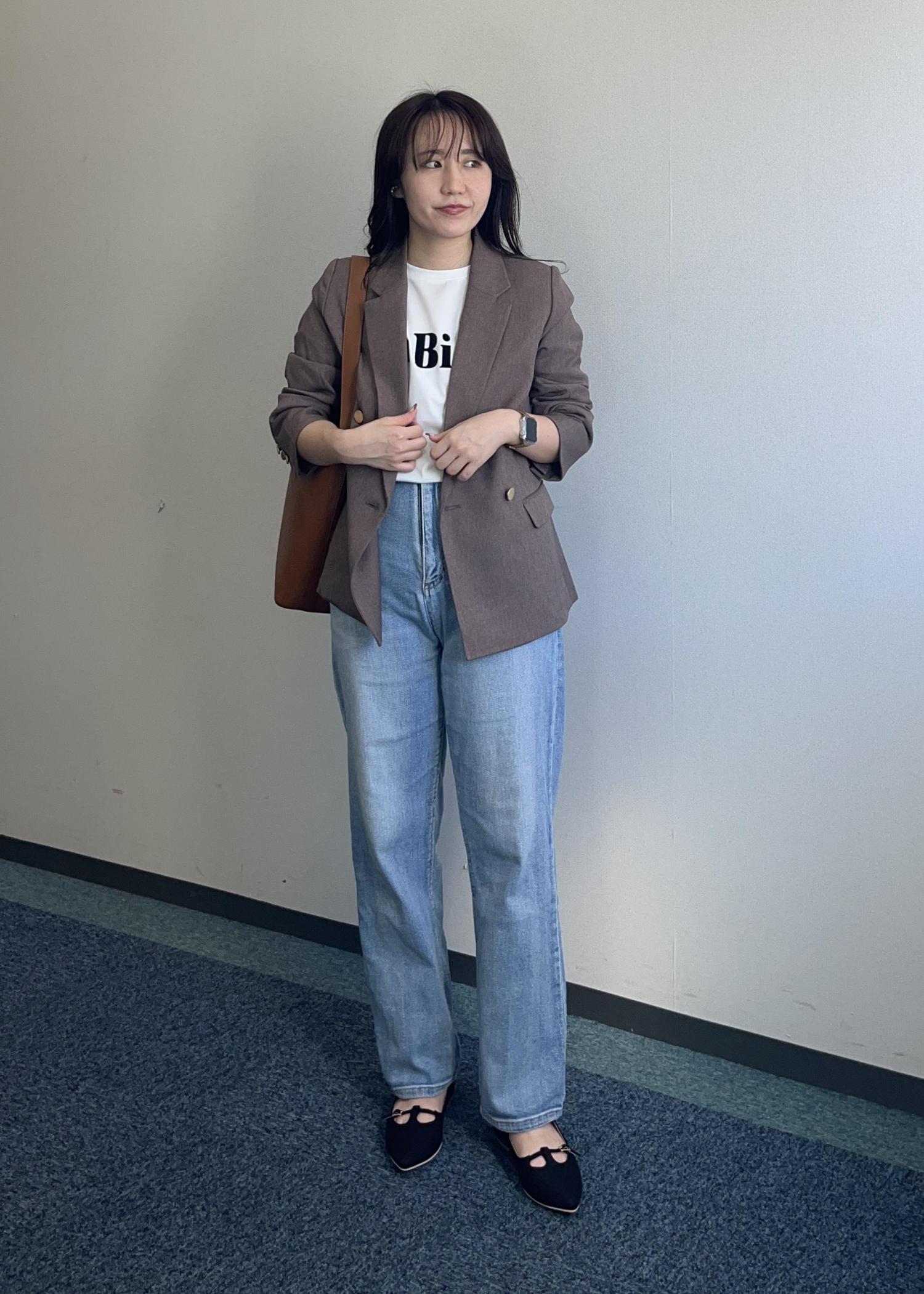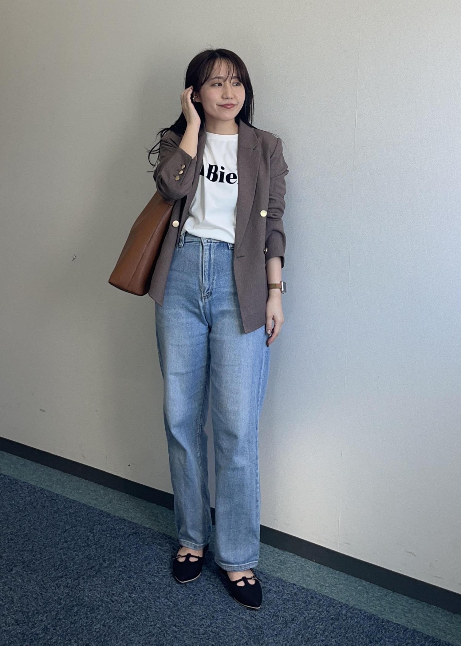 中はロゴTシャツでカジュアルダウンしました。小物で差し色を入れるとアクセントにもなります!