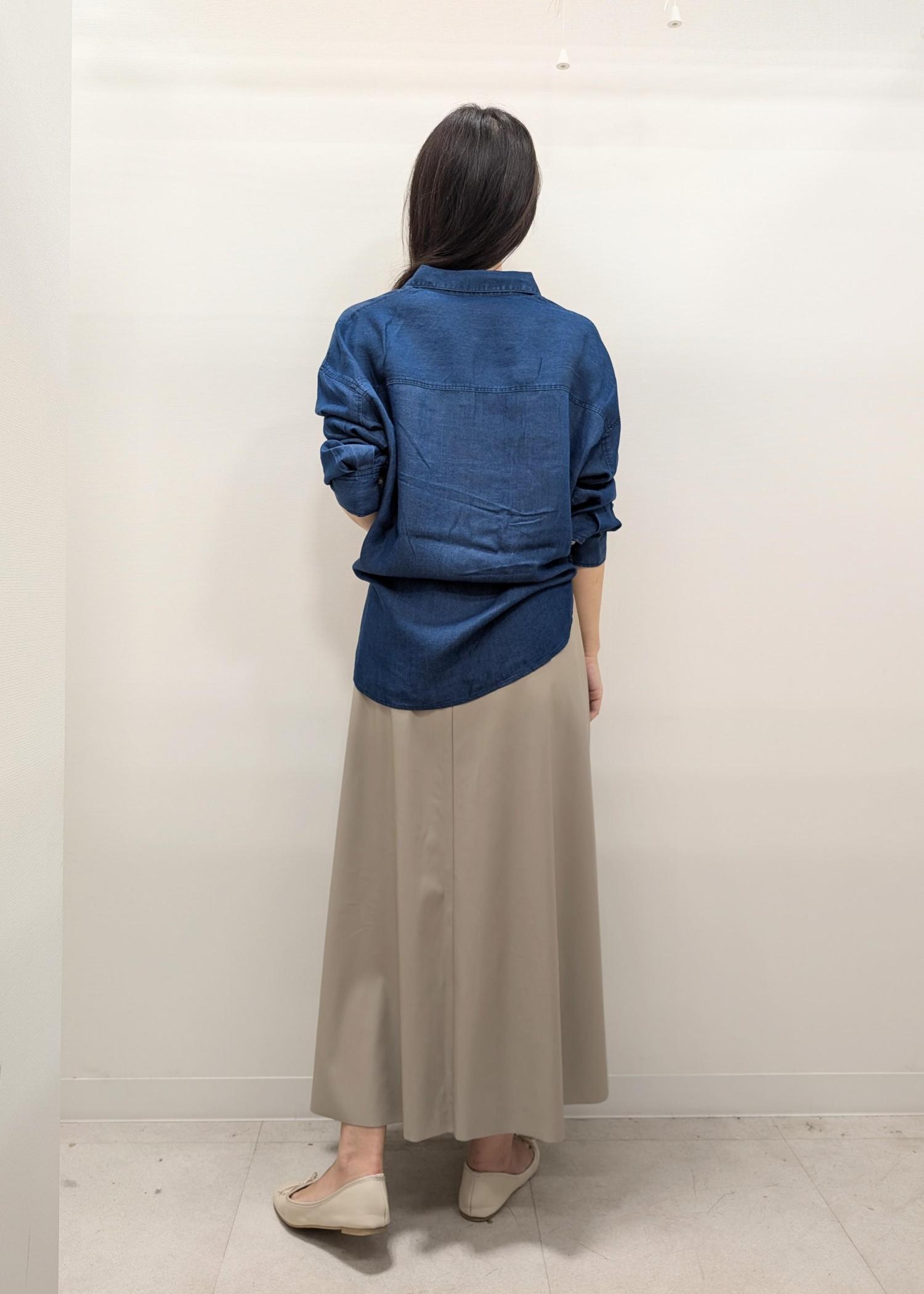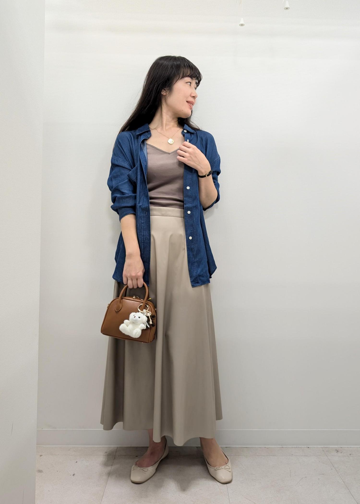 シャツ✕スカートのシンプルコーデですが、ボトムをレザースカートにしたことでお洒落感もあるコーディネートにまとめました(^.^)