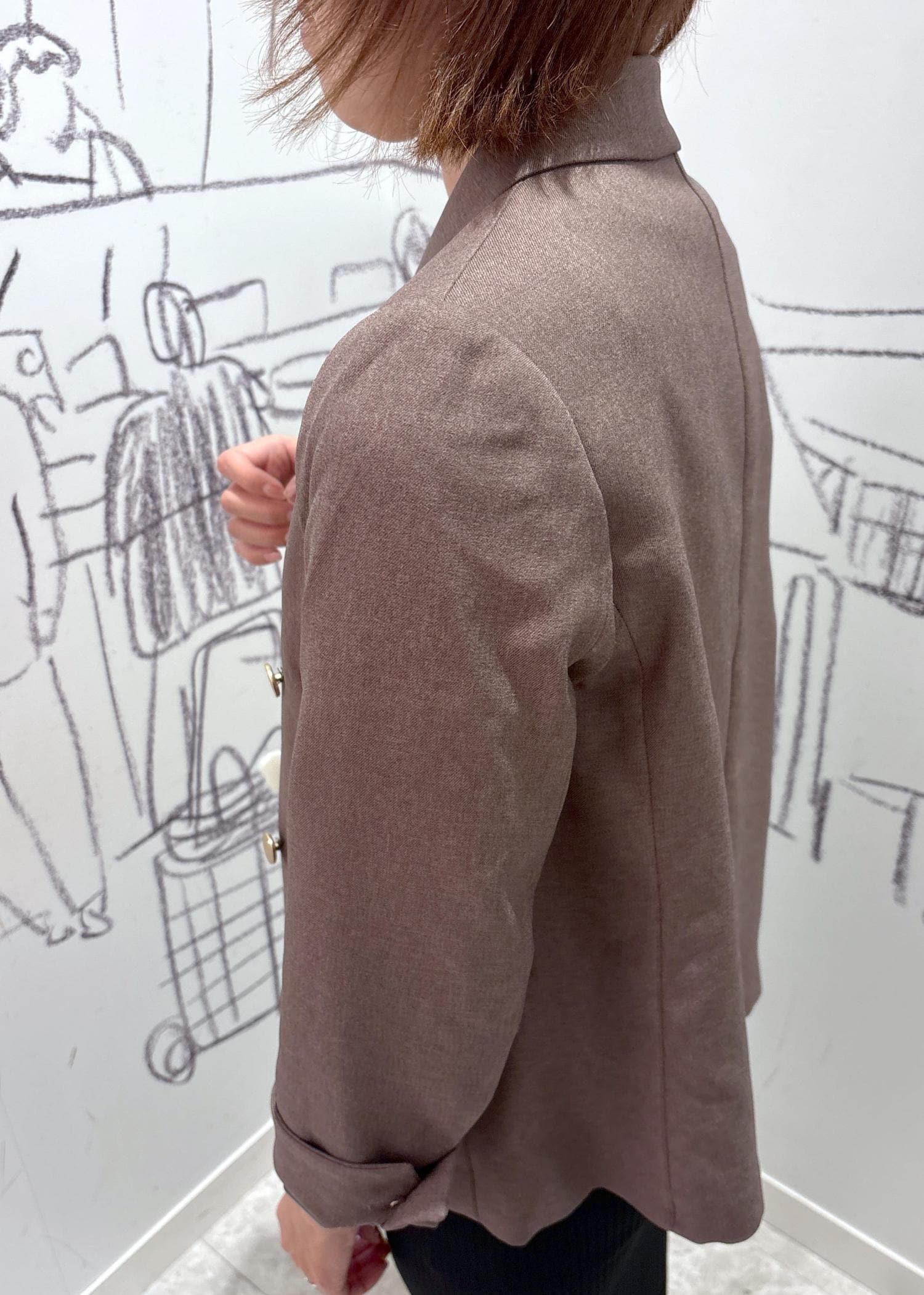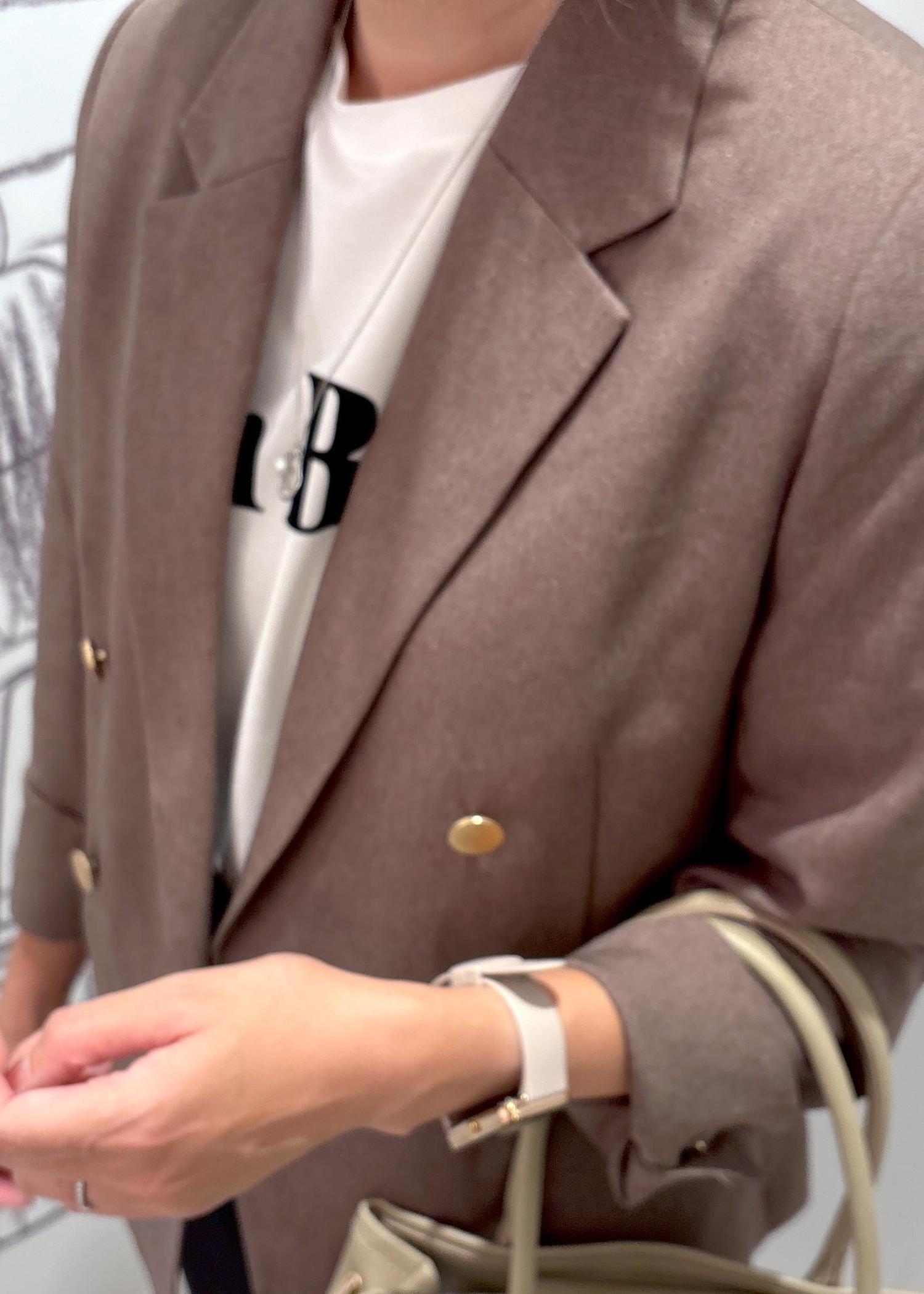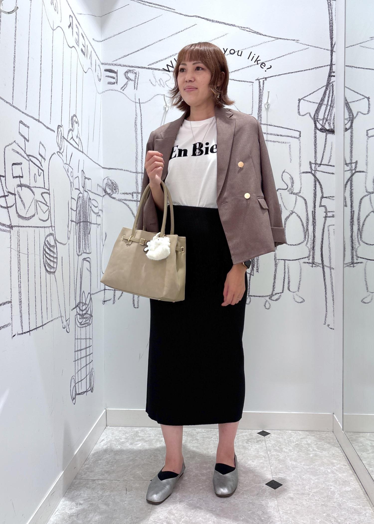 柔らかなブラウンカラーが今年らしく、中はロゴTシャツでカジュアルダウンしました。