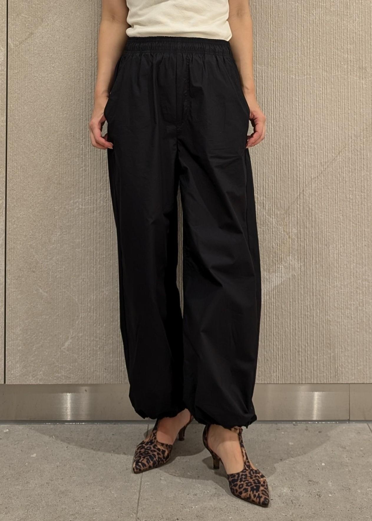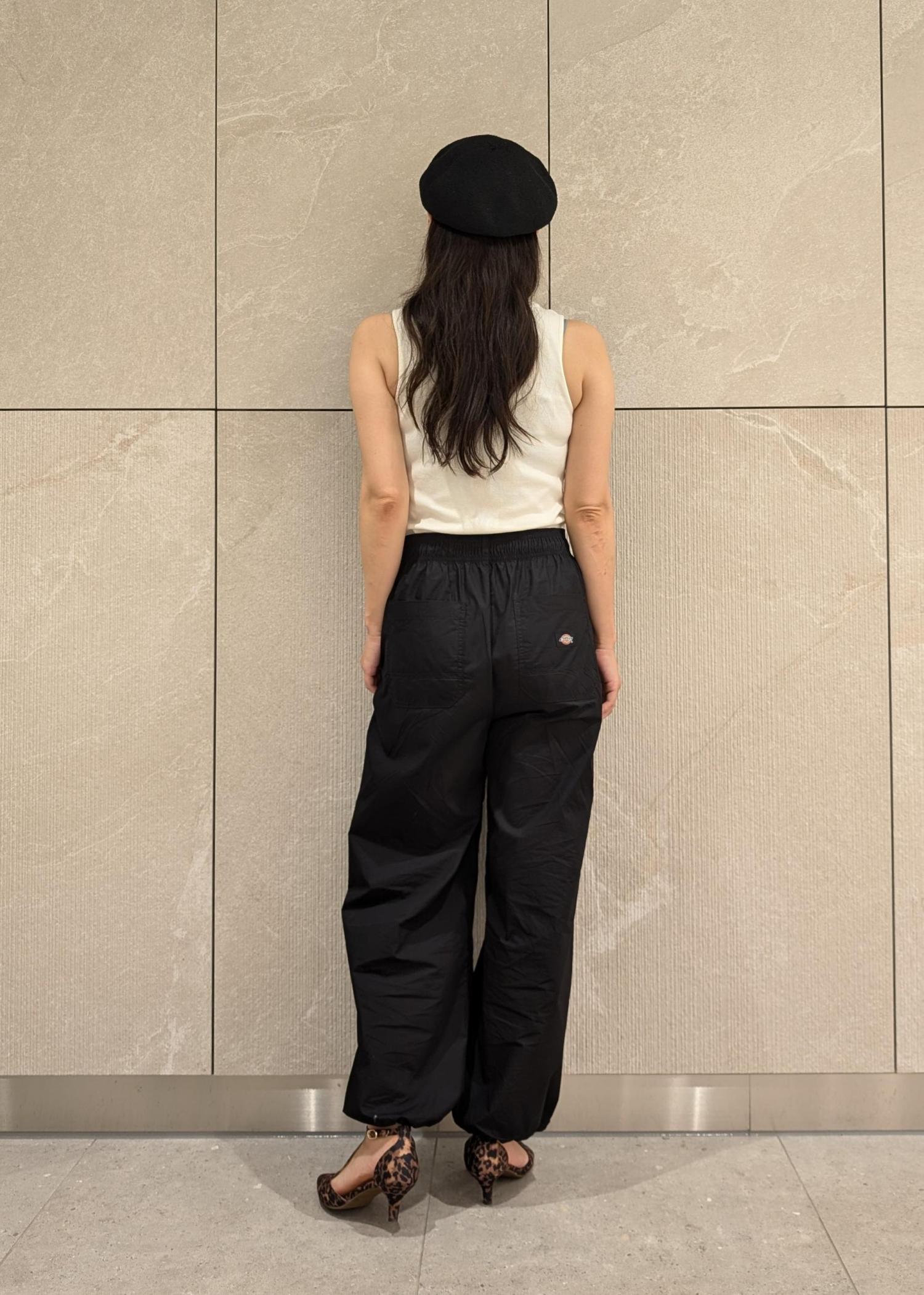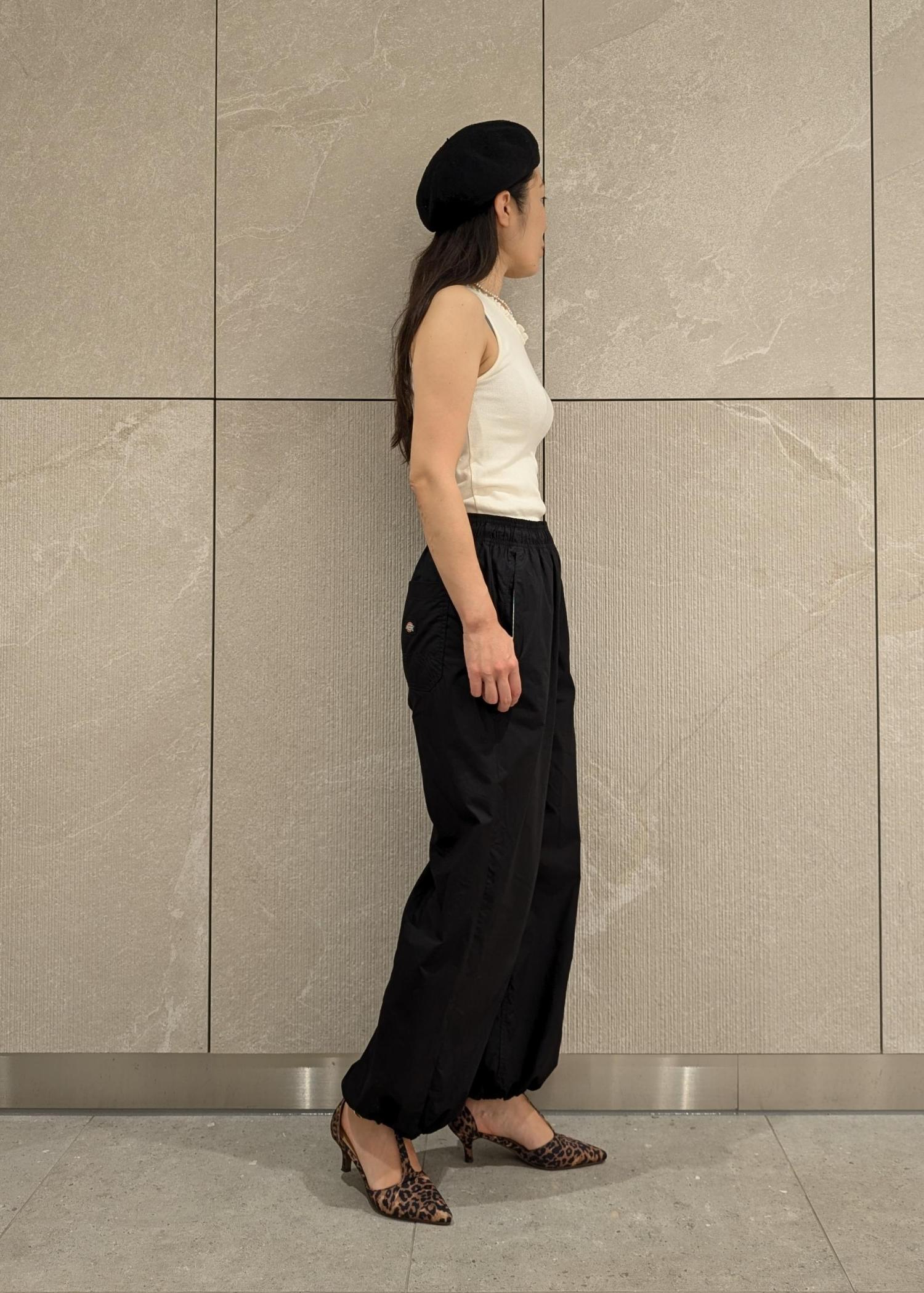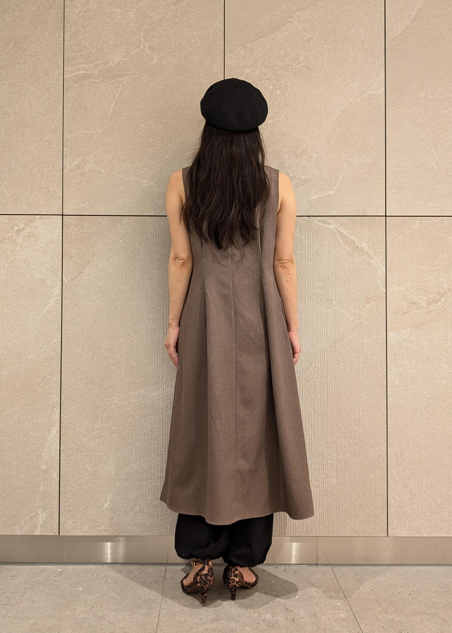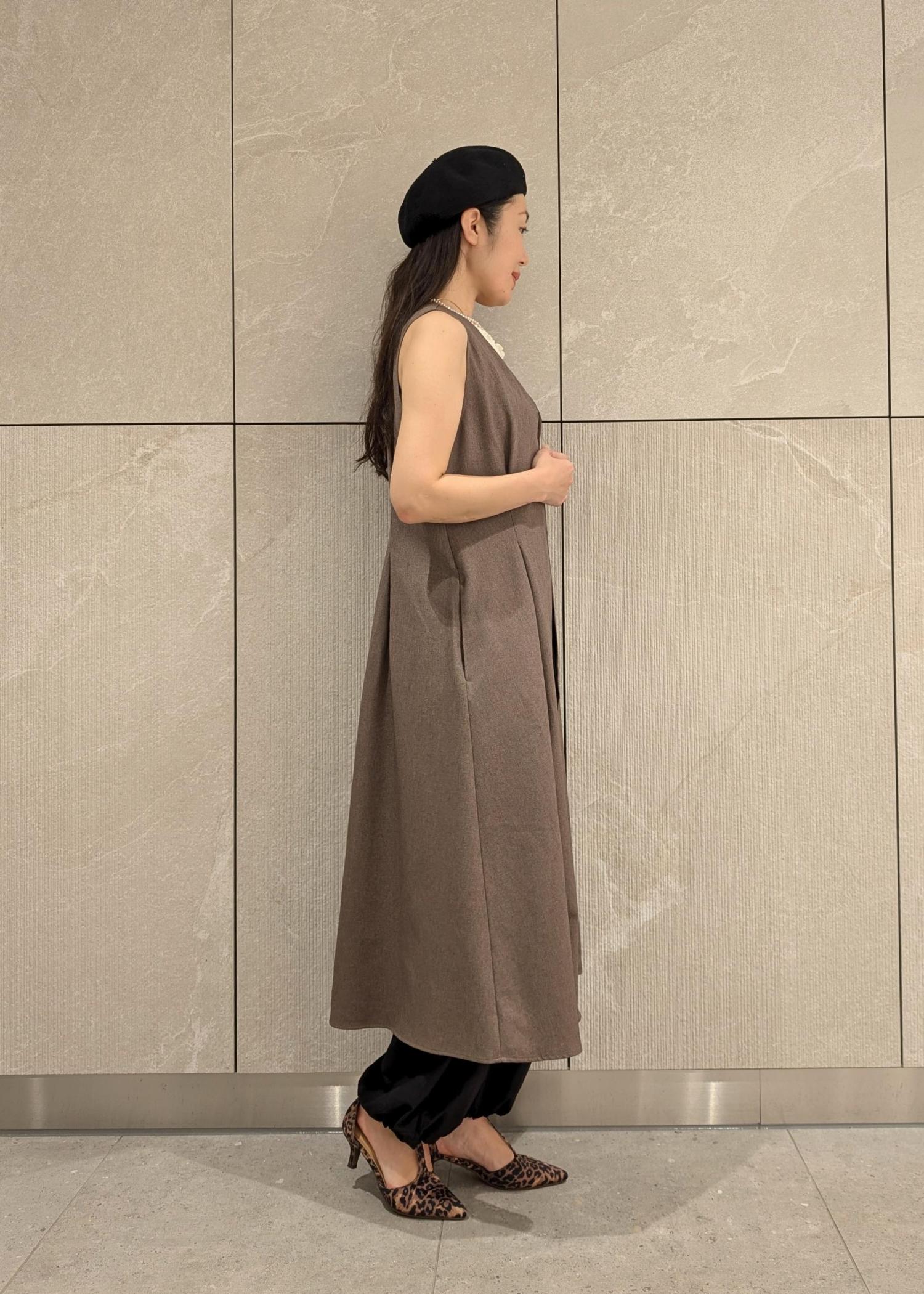 ジャンパースカートのフレアシルエット、パンツのボリュームがモード感ある組み合わせです。