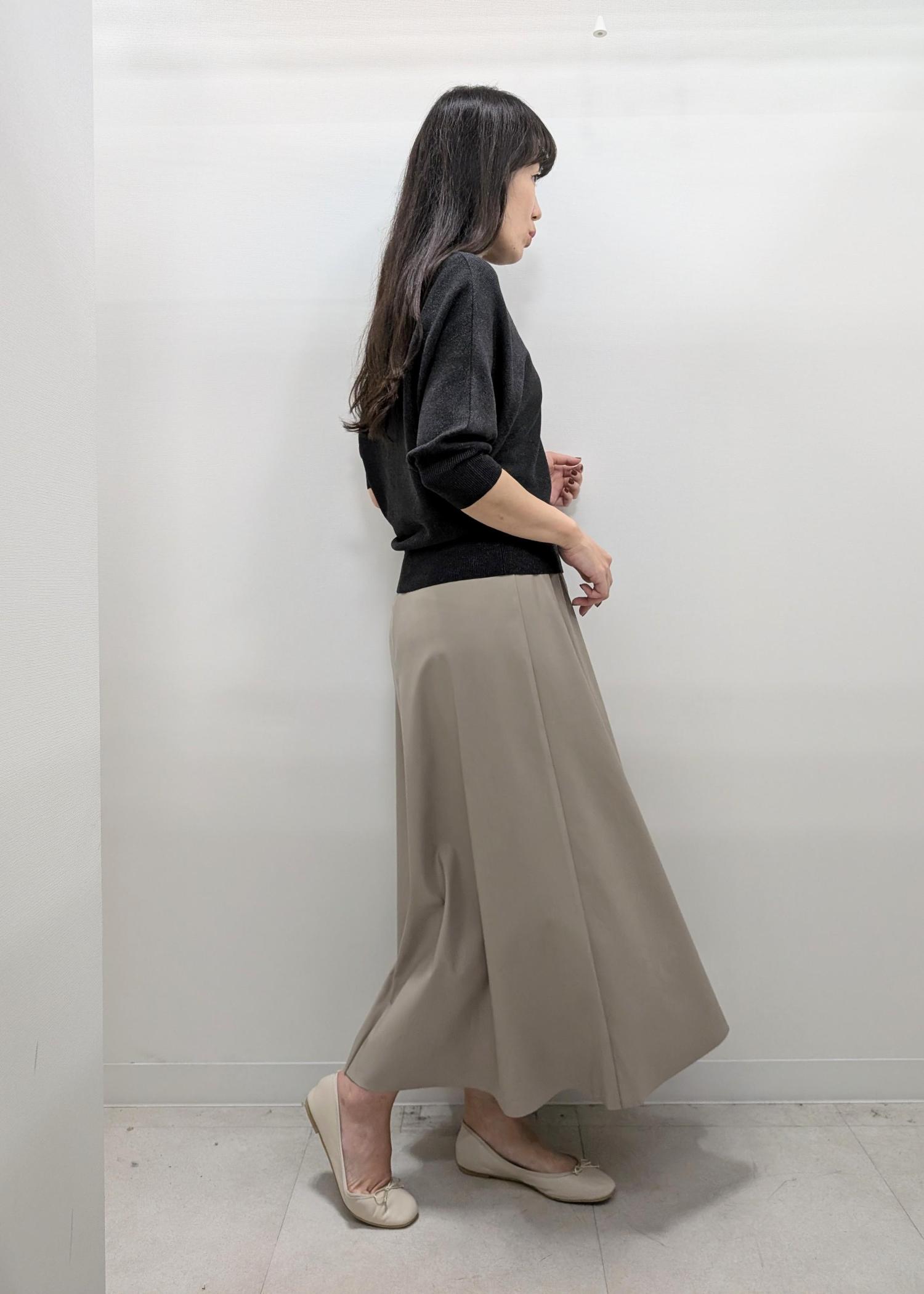 ウエストは後ろゴムなので見た目よりも履きやすいです。フレアスカートなので、ヒップから太ももにかけてのシルエットも出ない点も◎ -