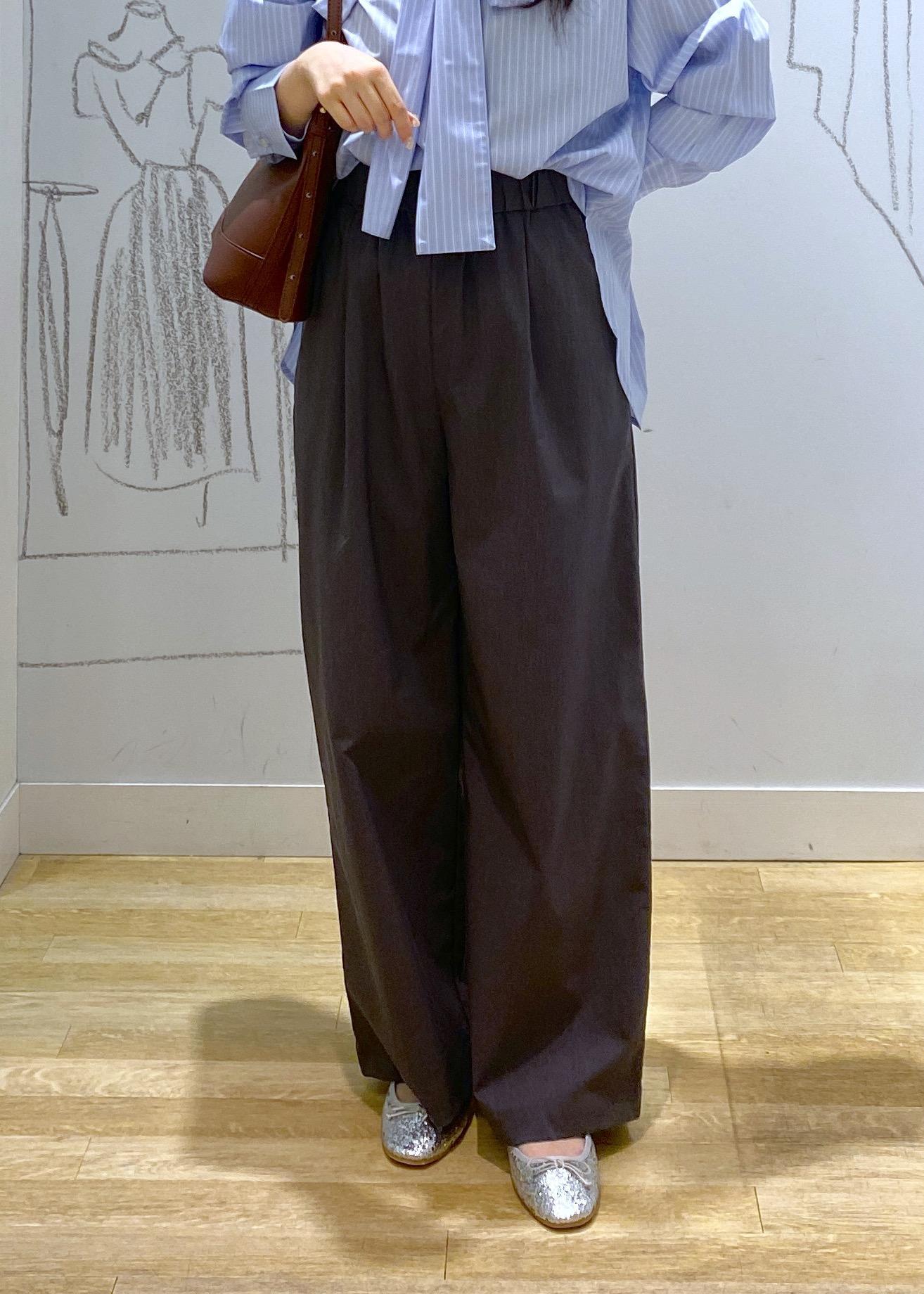 ボトムスにシンプルなチャコールのパンツを合わせることでリボンの甘さを抑え大人コーデに仕上がります。