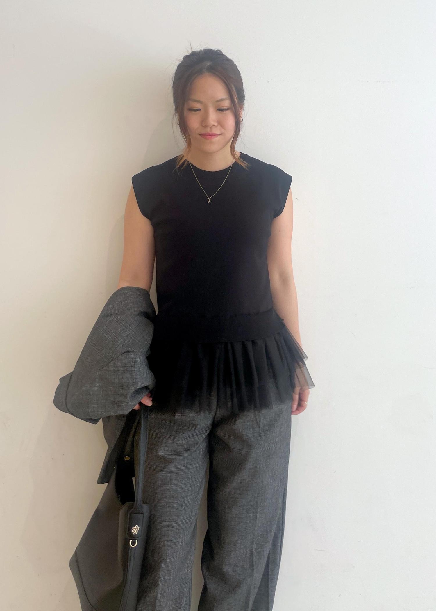 メンズライクなコーディネートですが、チュールのトップスを入れて少し女性らしい印象をプラスしました!