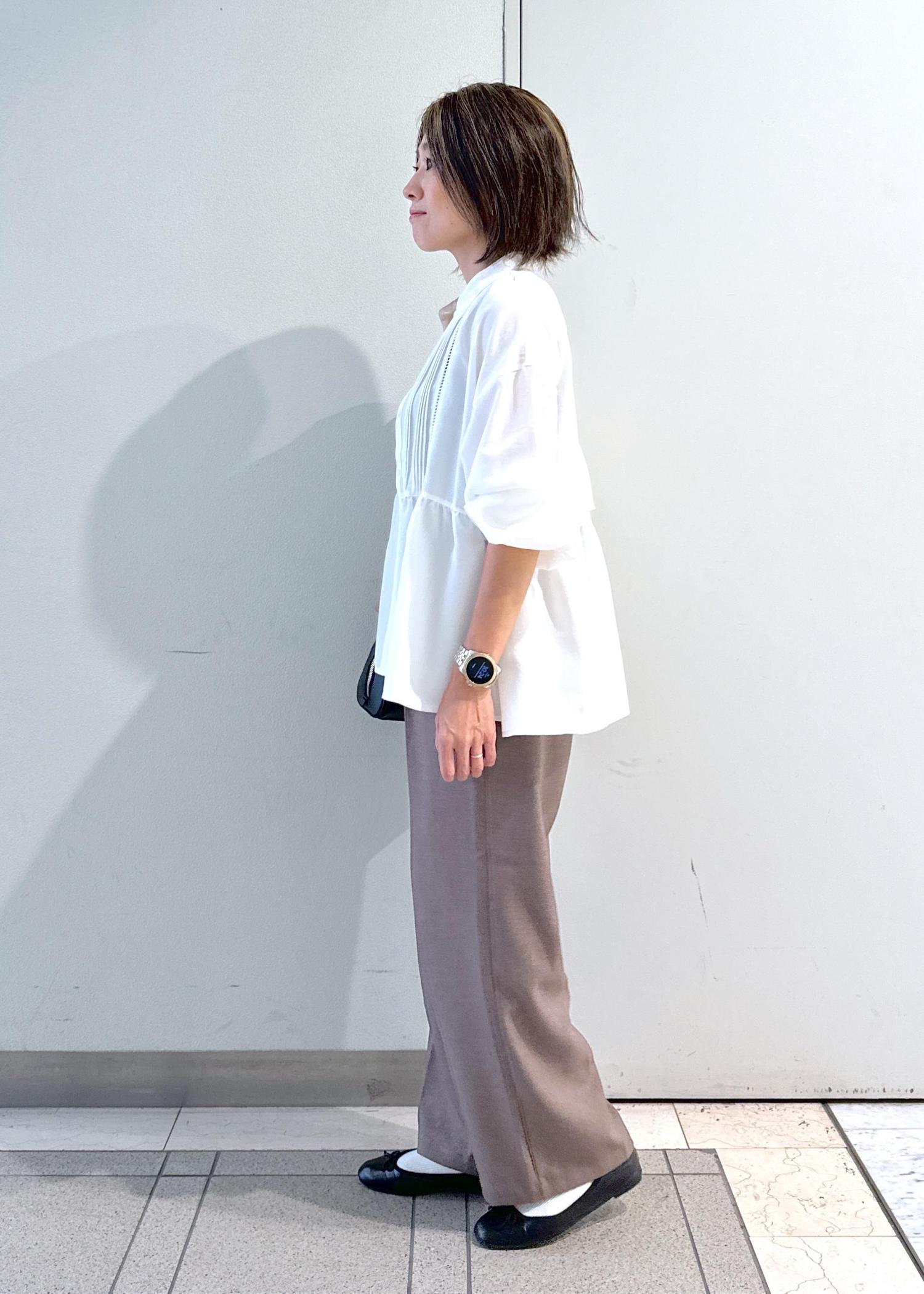 ゆとりのあるサイズ感でやや大きく感じました。ワイドシルエットで脚のラインを拾いにくいです。着丈は足首がしっかり隠れる長さですがフラットシューズでも合わせて頂けます。