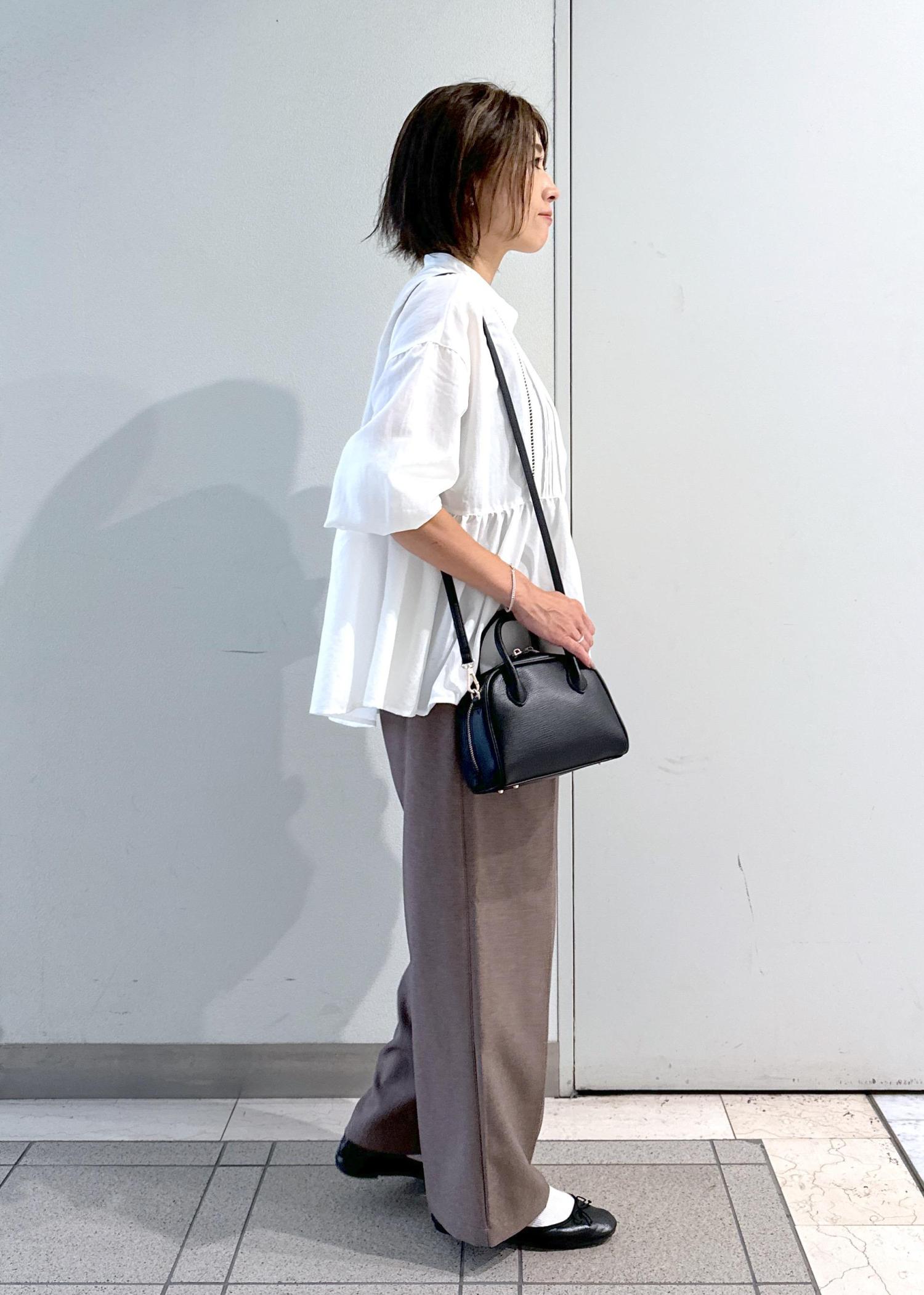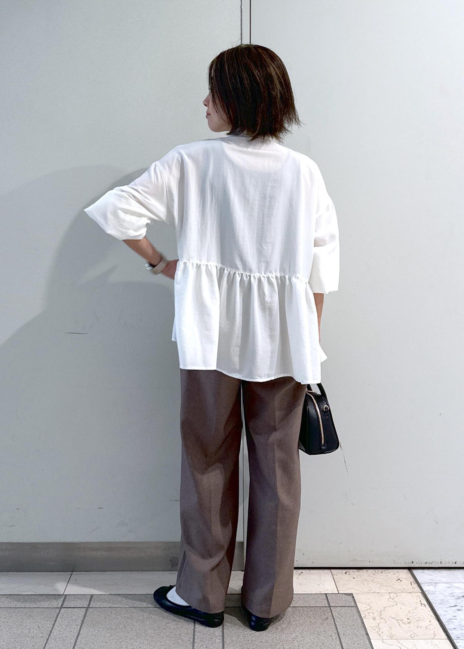 ふんわりと広がるペプラムシルエットで体のラインを拾いにくいです。袖周りもゆとりのあるサイズ感です。