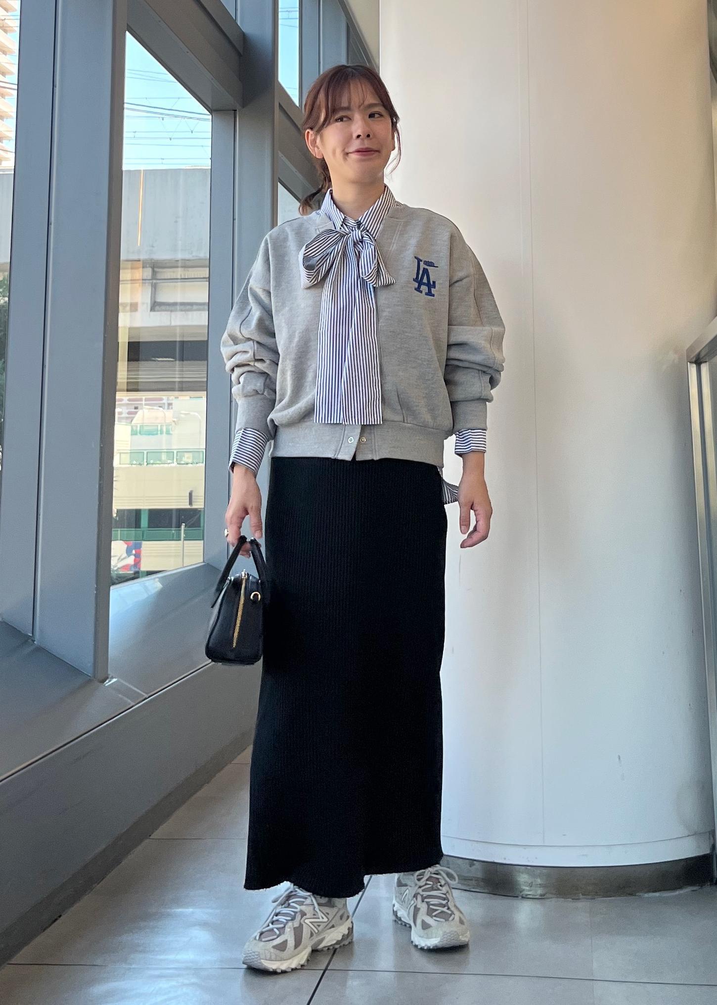 深めのVネックで大人っぽく着れるスエットカーディガンにリボンブラウスを重ね着しました。