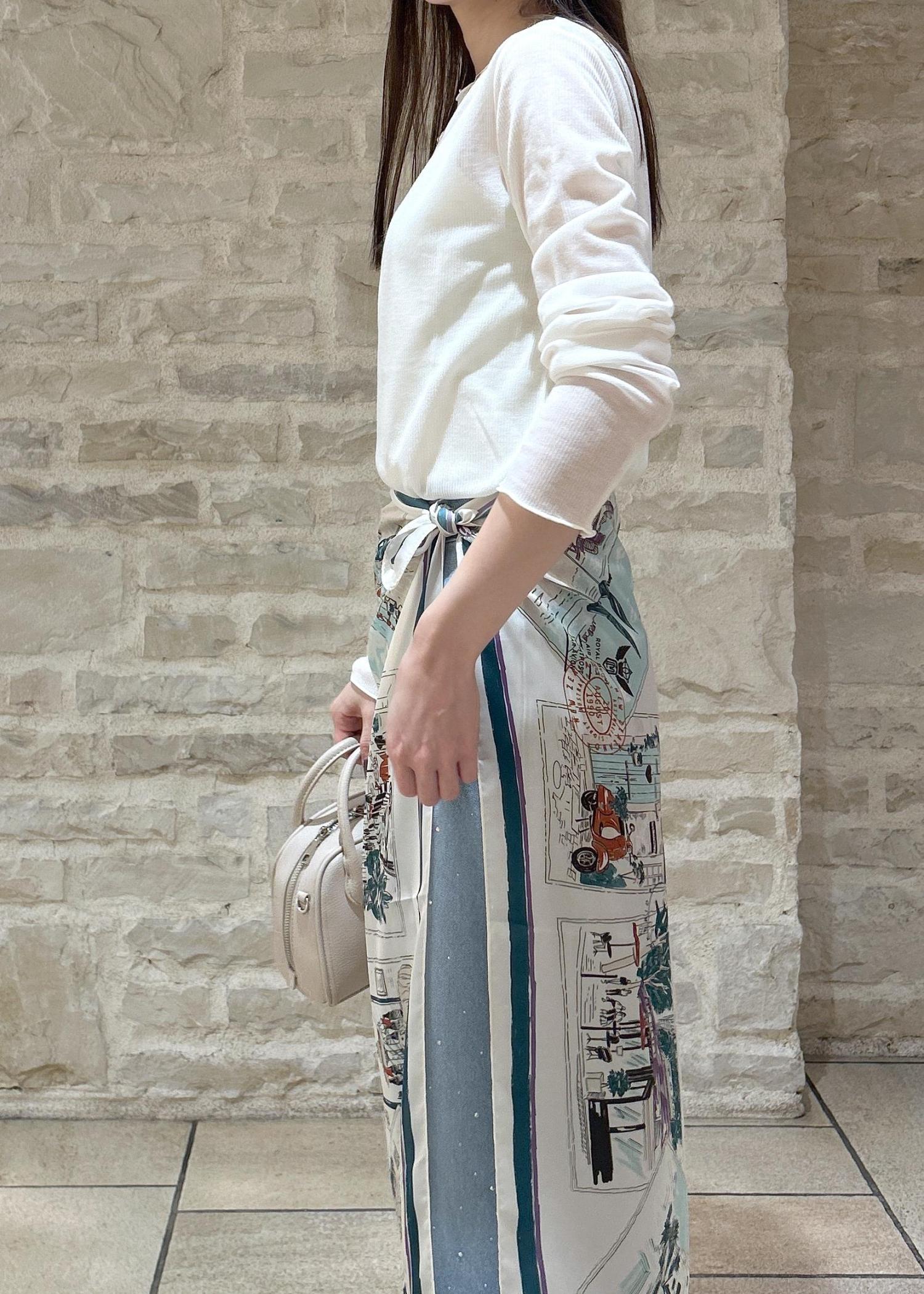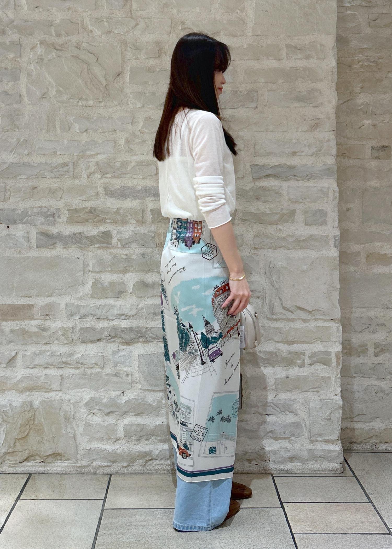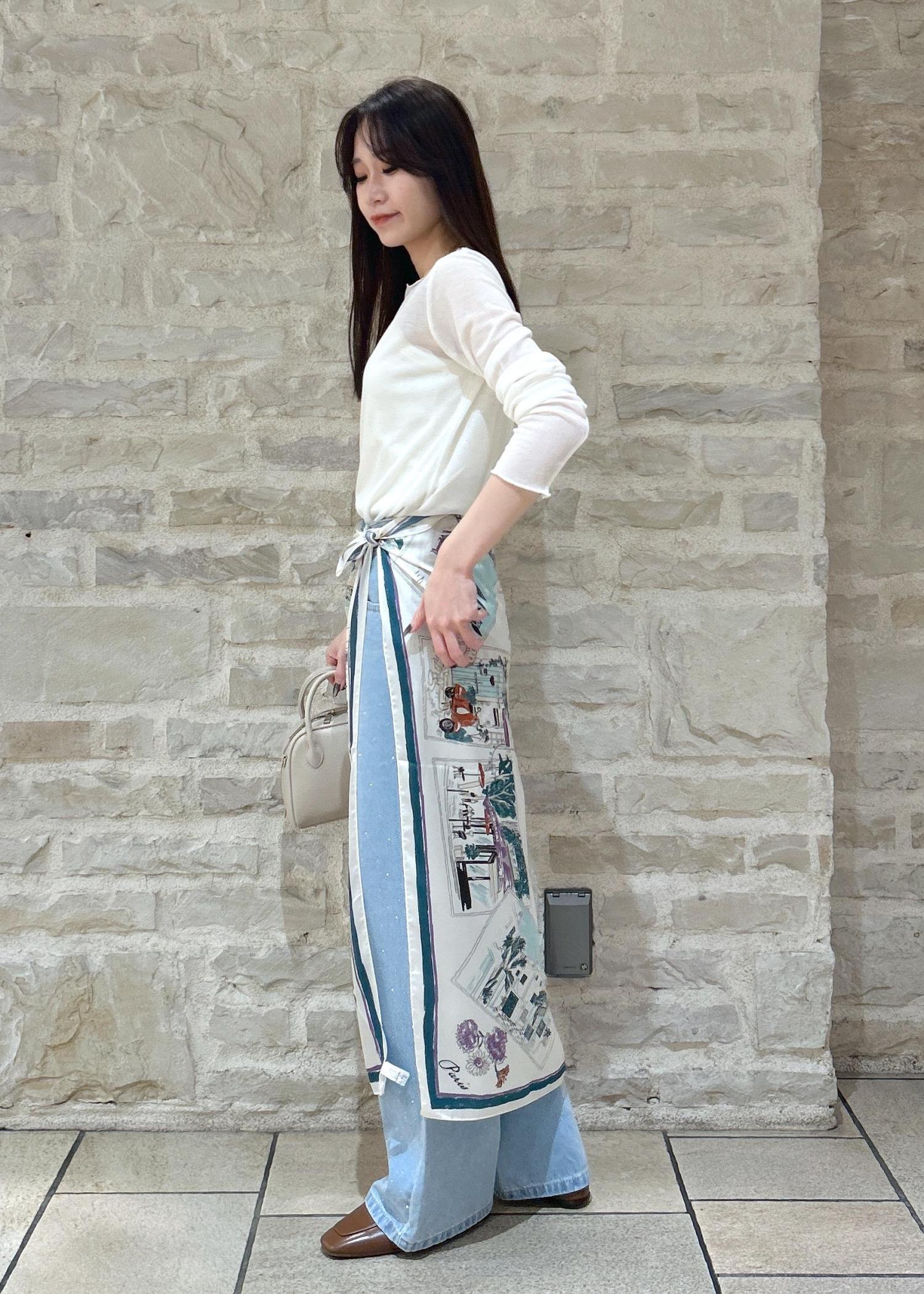 大判スカーフで腰に巻くのも今年らしいトレンドスタイルです。