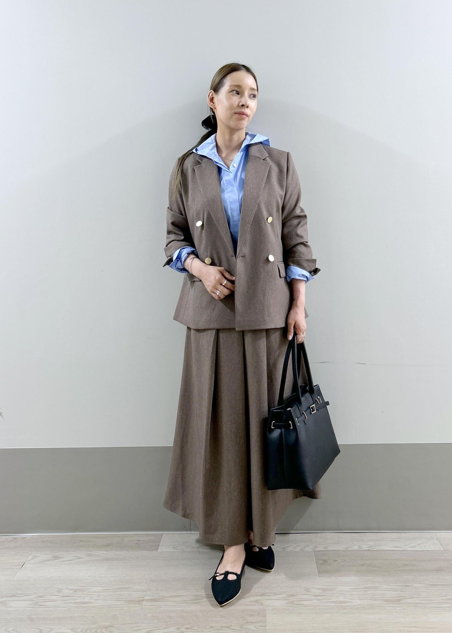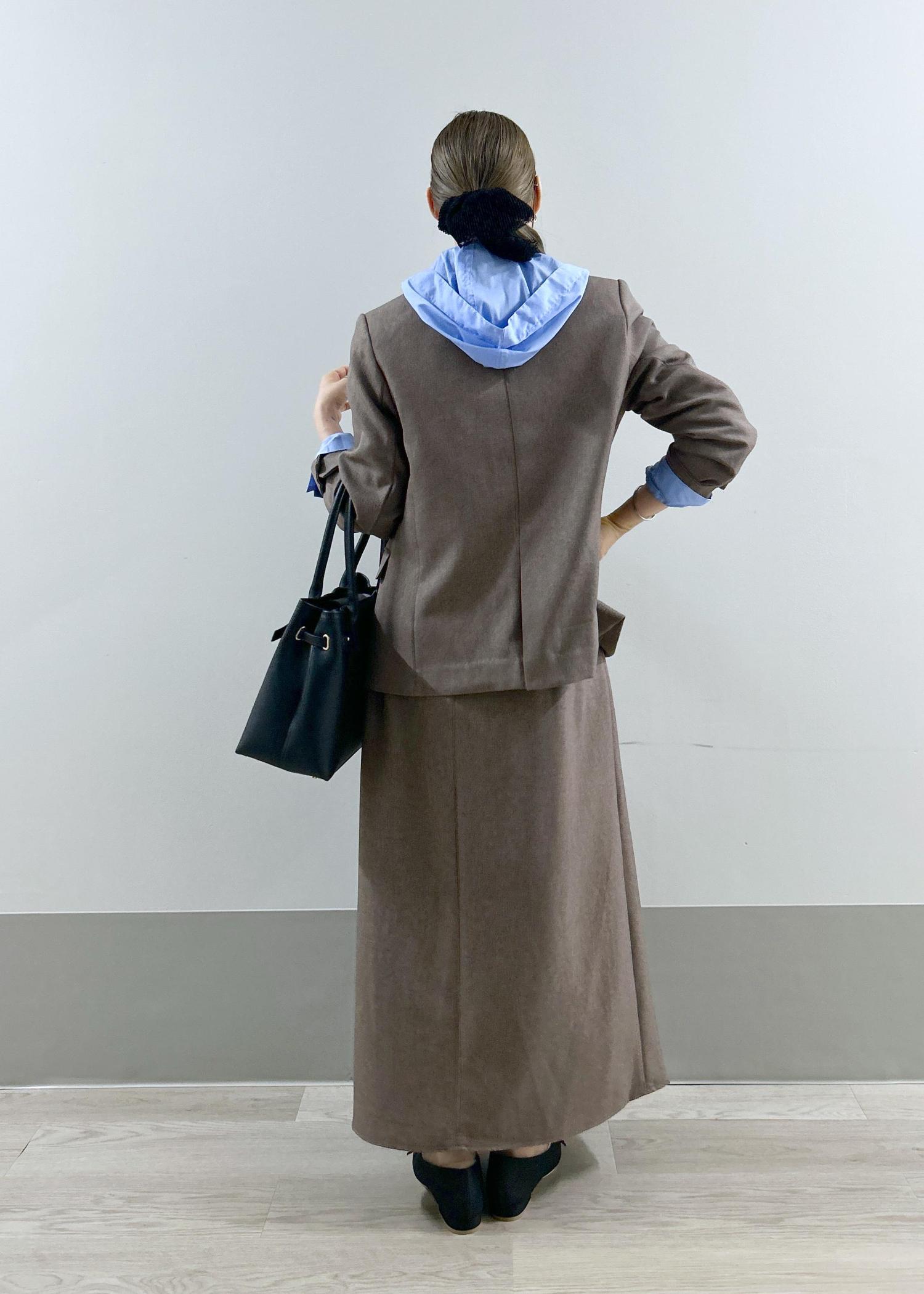 着丈は腰が隠れるくらい、袖丈は手首が隠れるくらいでスッキリしているのでお仕事にも着用いただけます。