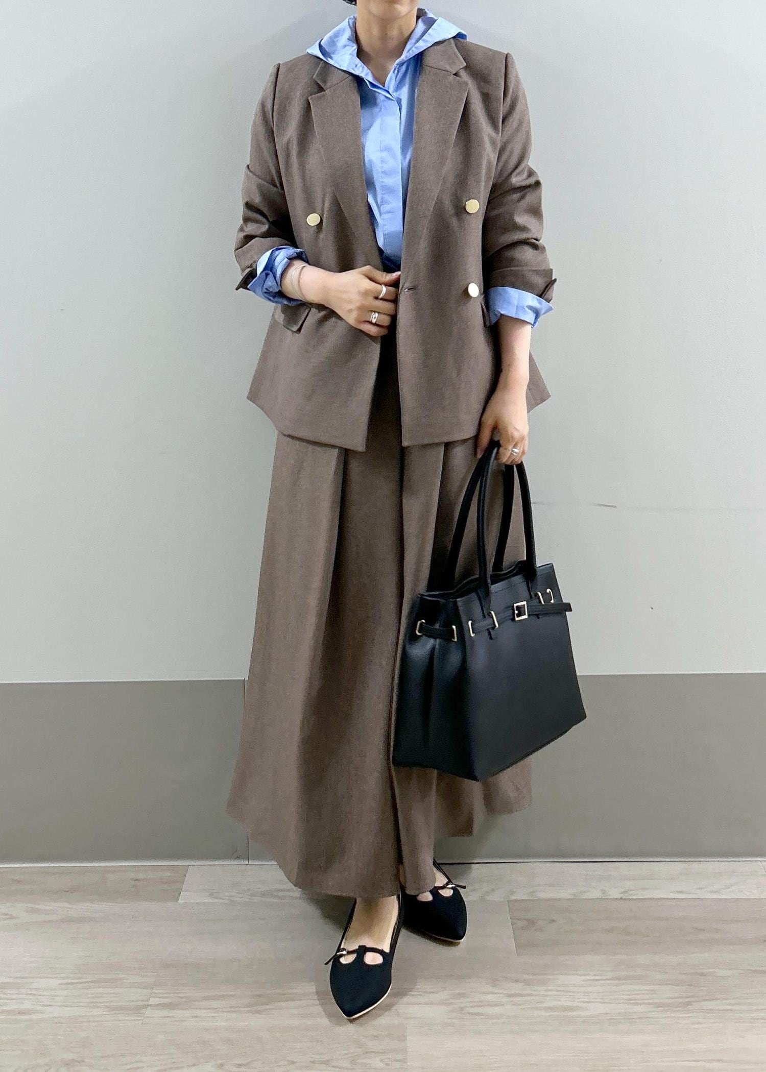 固くなりがちなセットアップですがブルーのシャツで少し抜け感を出したコーディネートです。