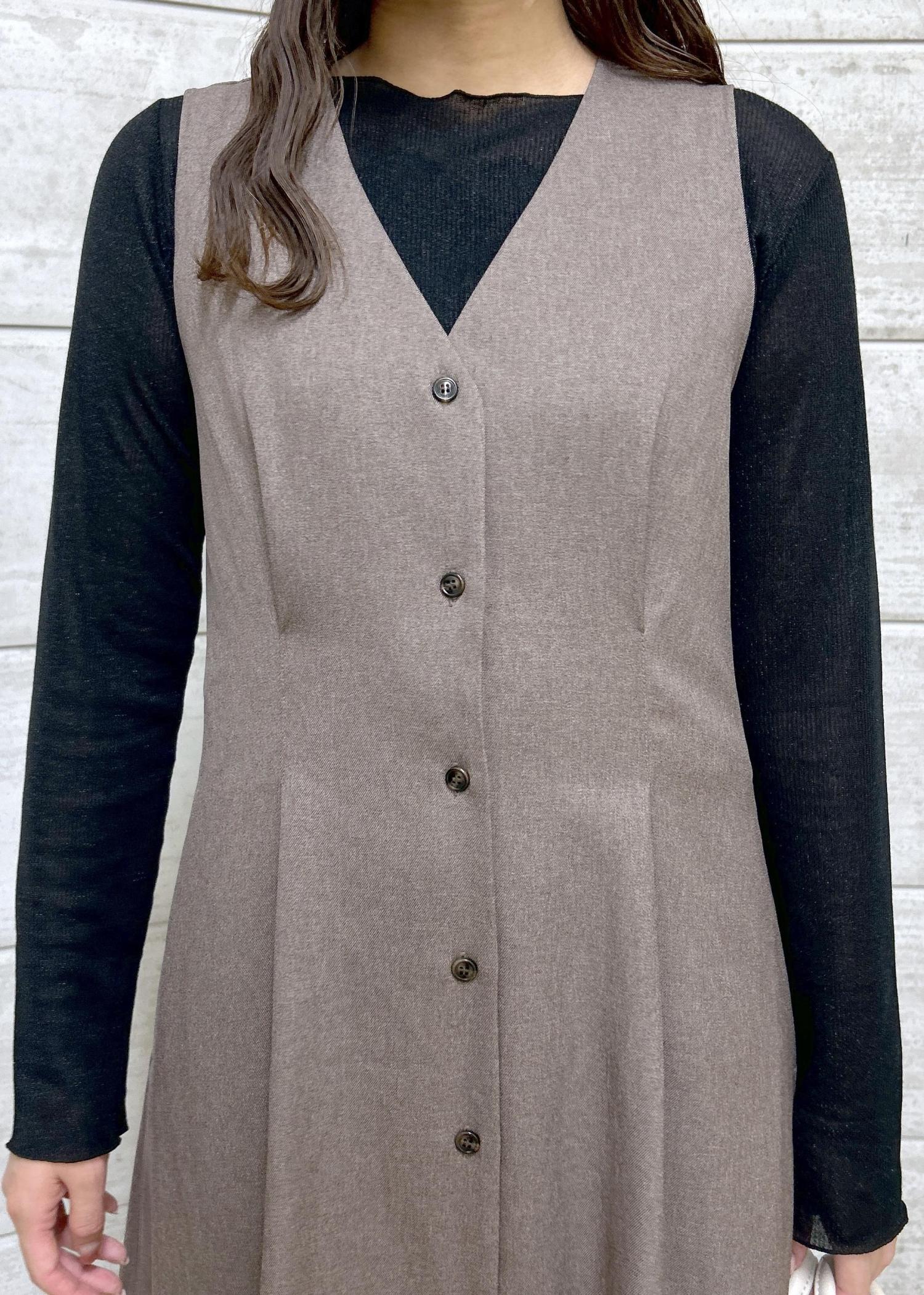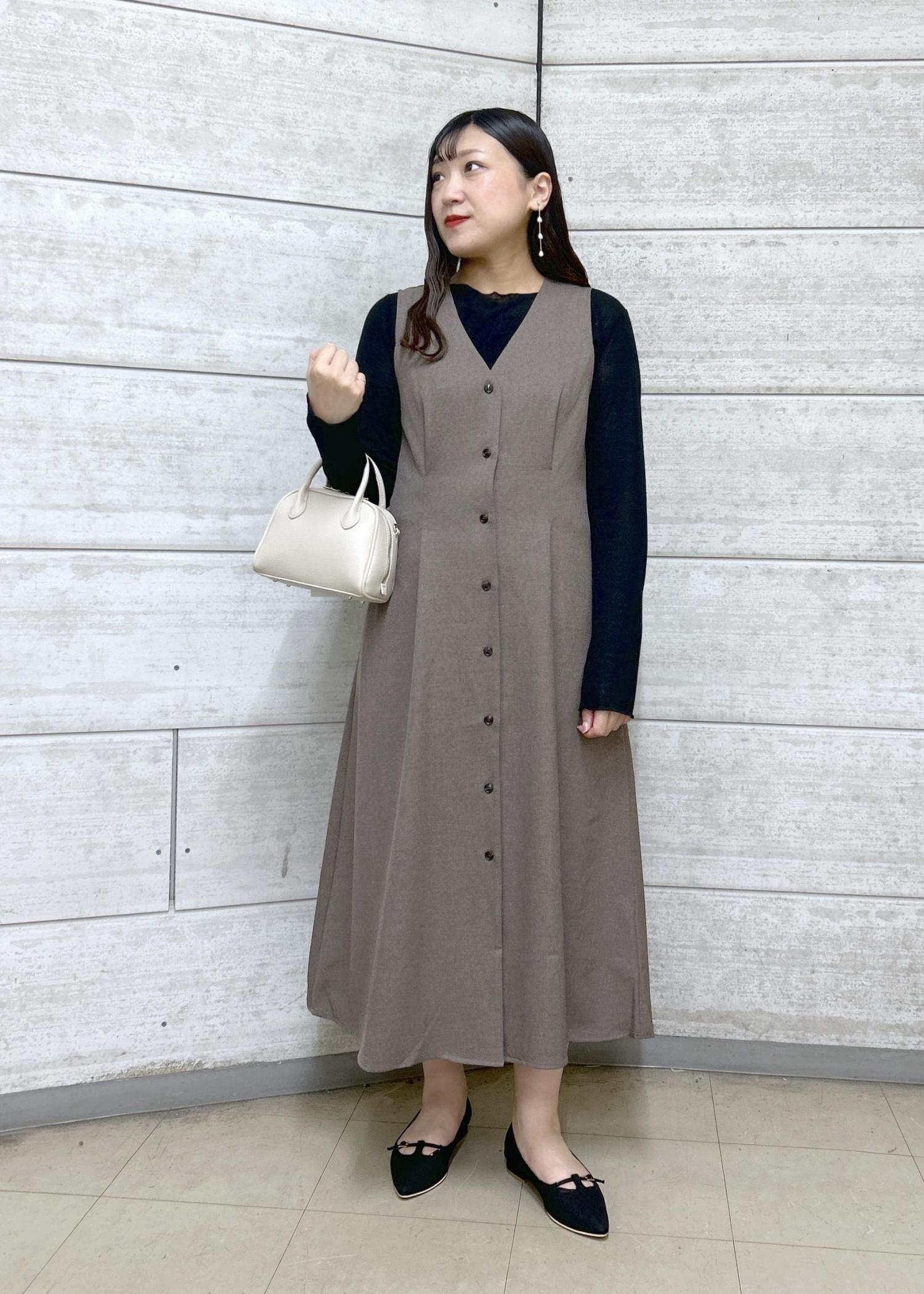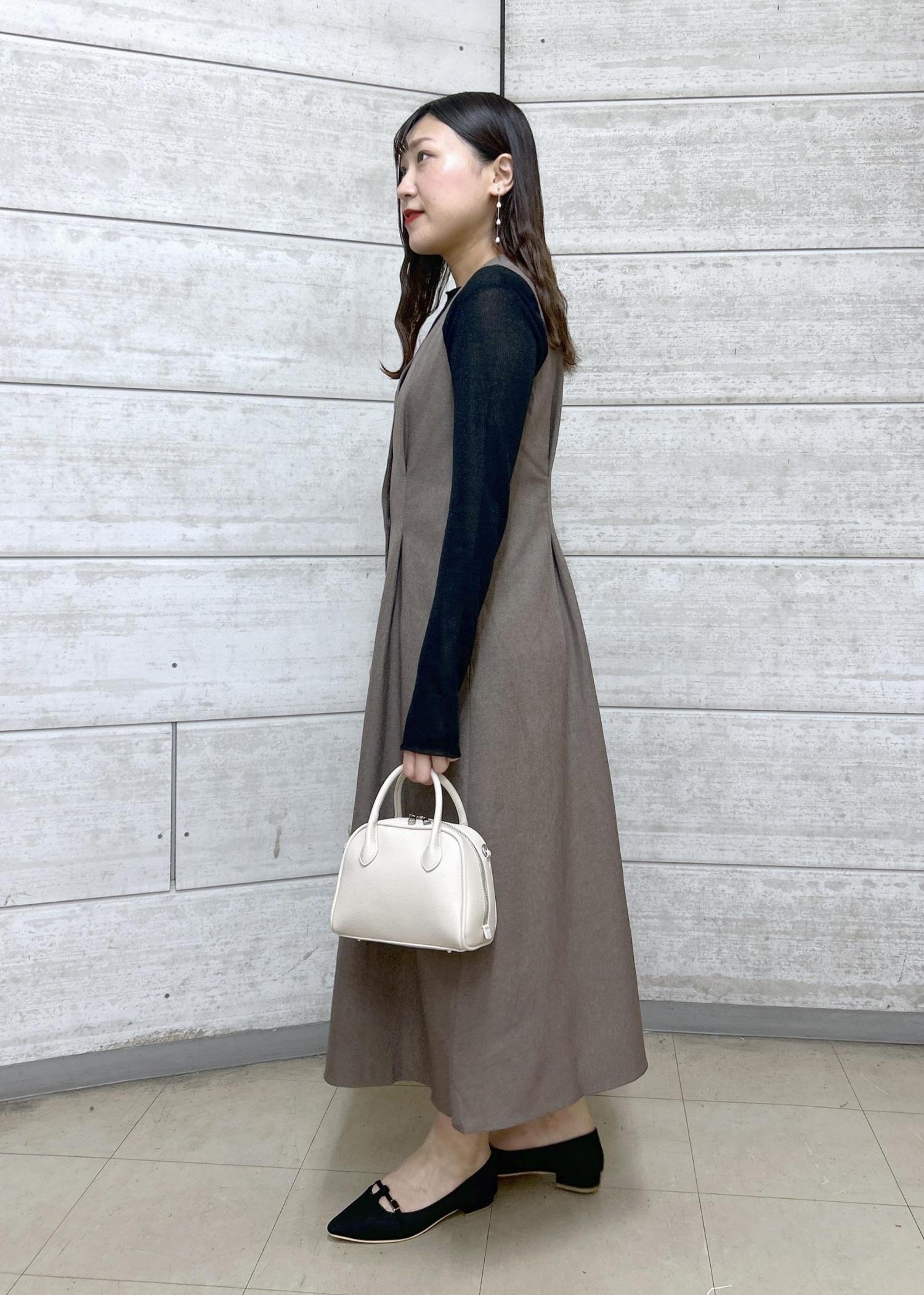 ブラウンのワンピースにまだ時期が早いのでシアーインナーを合わせた秋らしいスタイリングです。