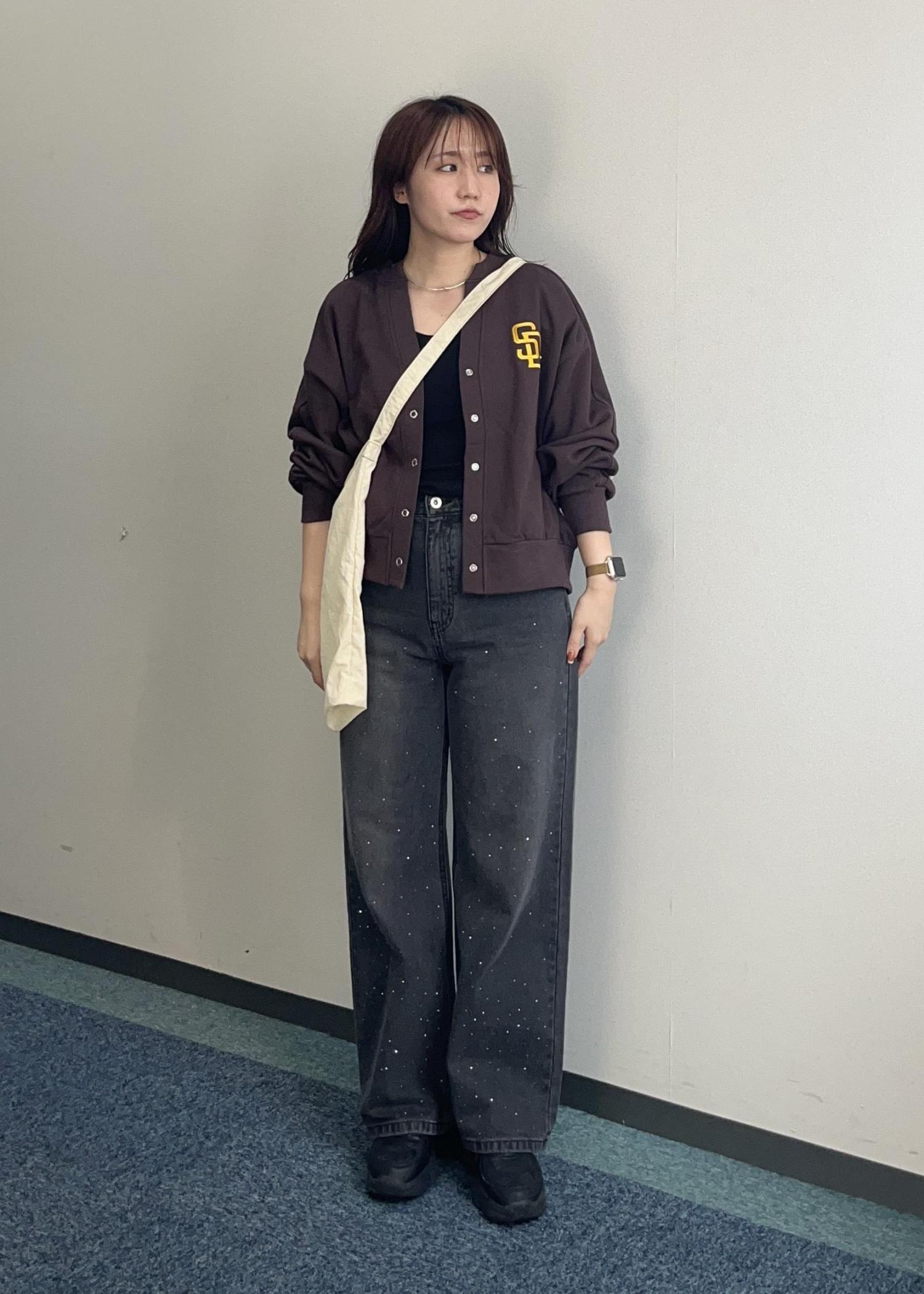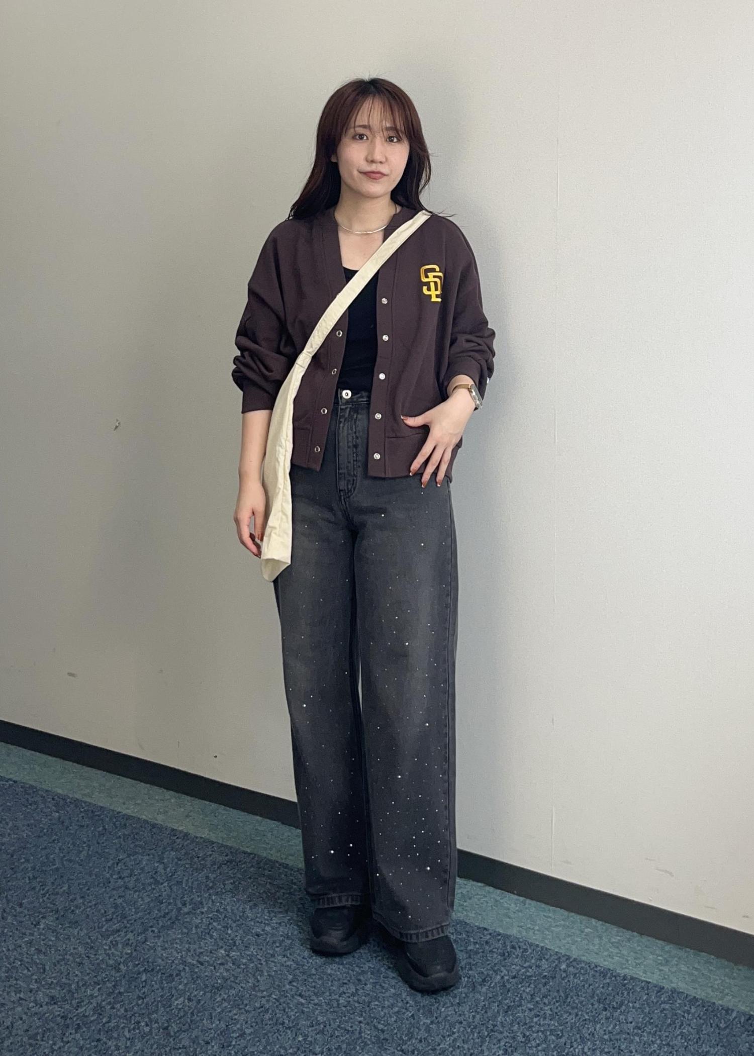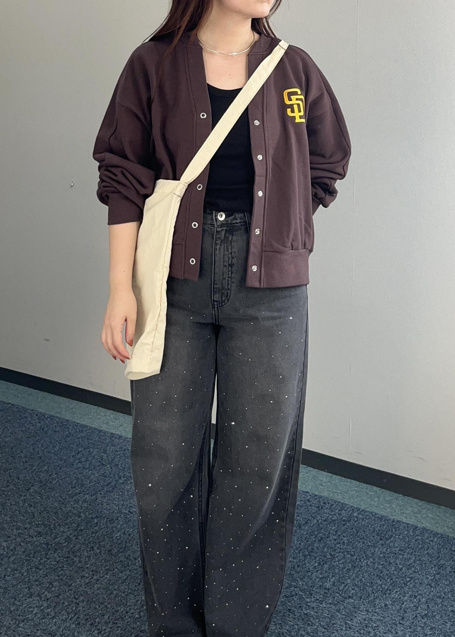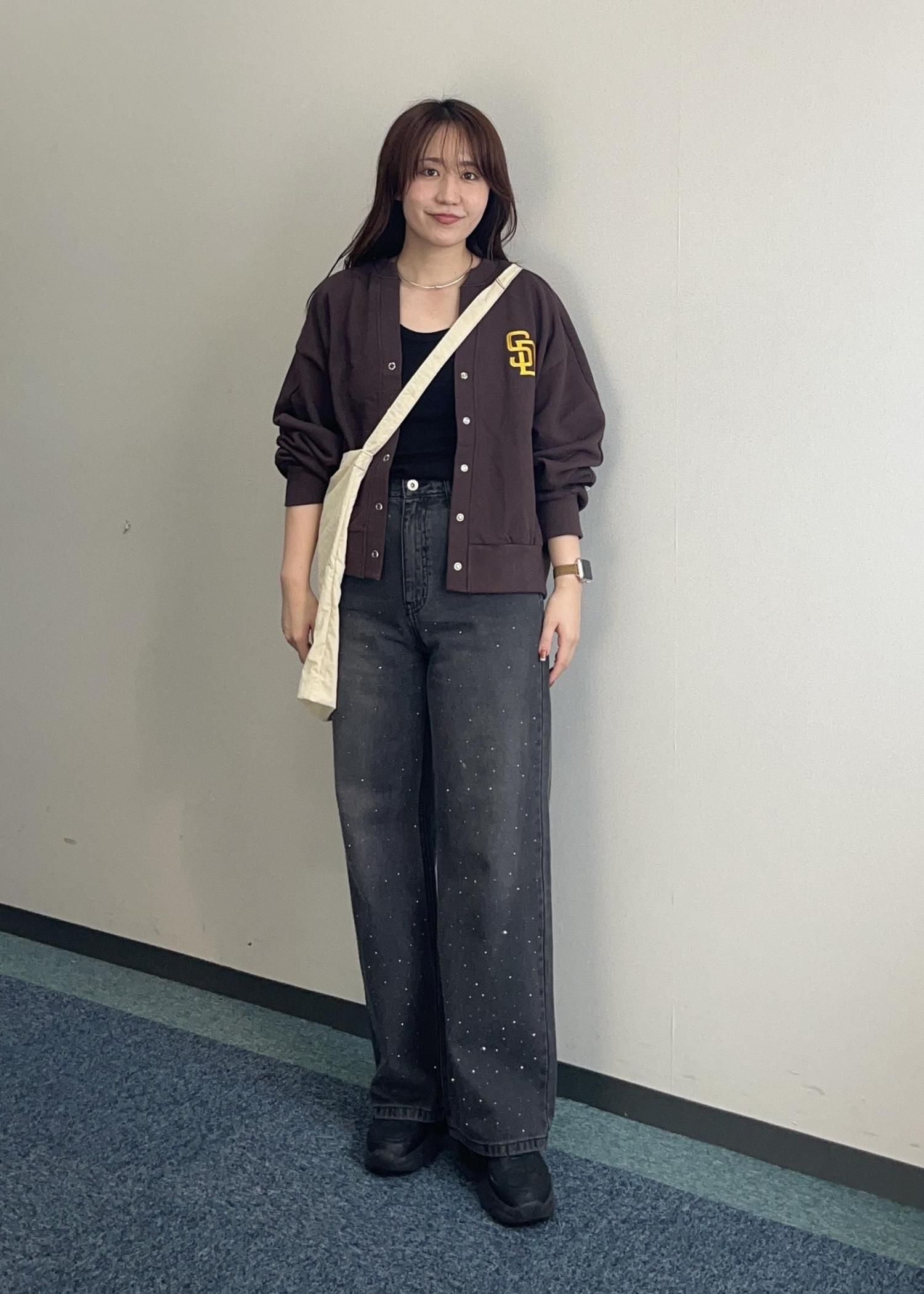 スウェット素材のカーディガンを使ったカジュアルコーディネート。閉めたままでも可愛いですが、開けてすっきりとしたスタイリングにするとスタイルアップ!♫