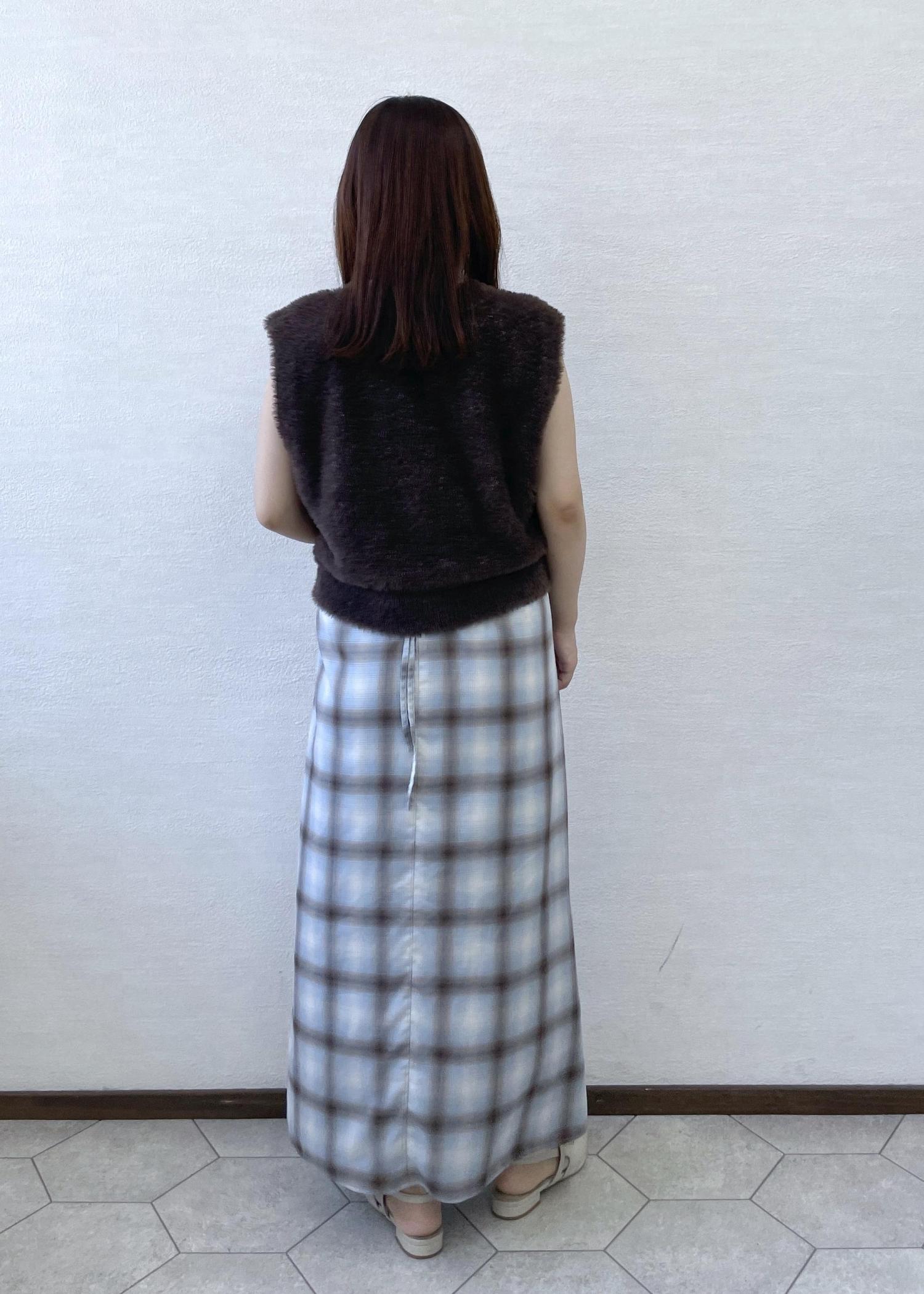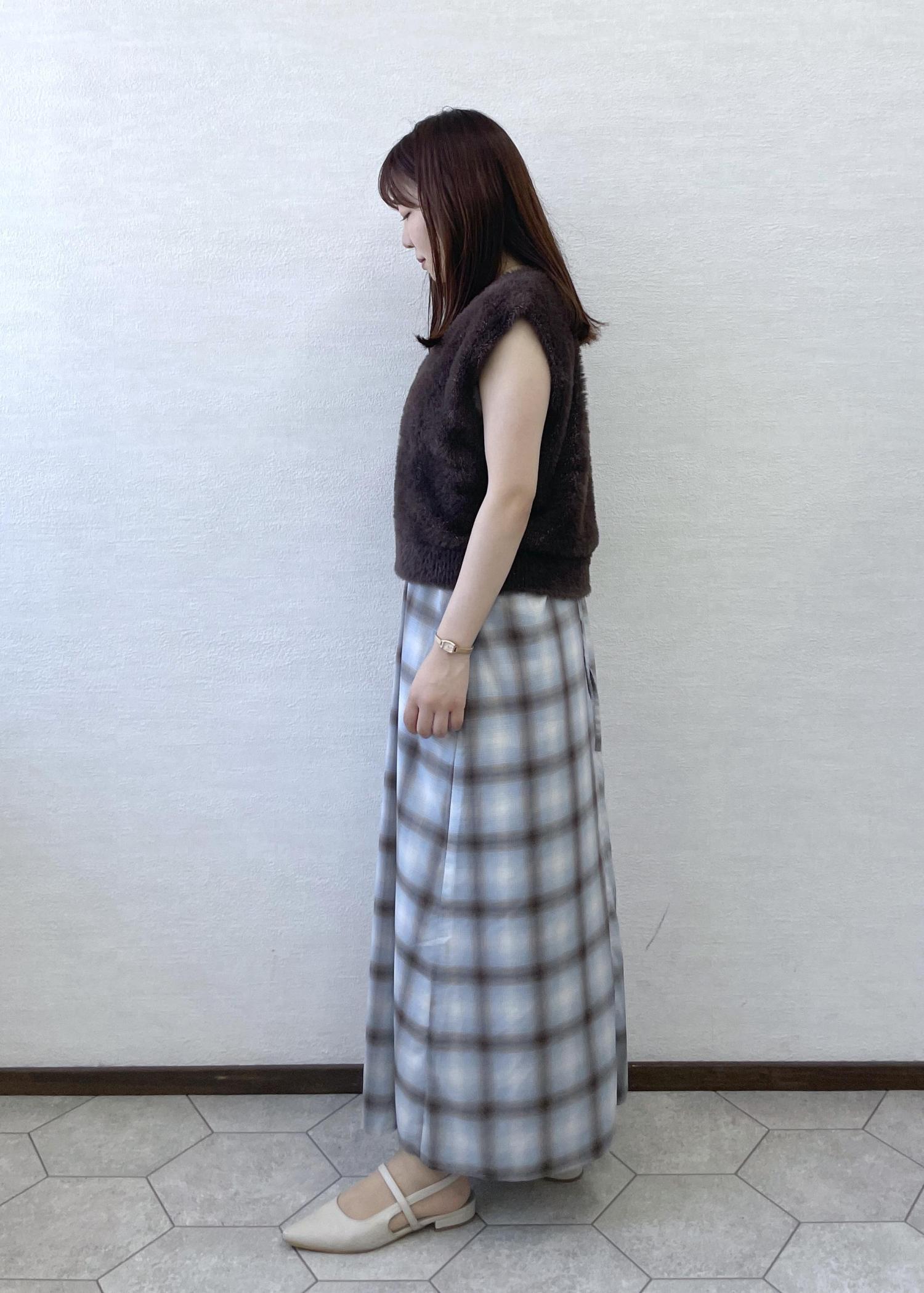 チェックのキャミワンピースに大人気のフェザーニットを重ねてみました!ブラウンやチェック柄で秋のトレンド感を出しつつ、ブルーで夏らしさも残したコーデにしました♪
