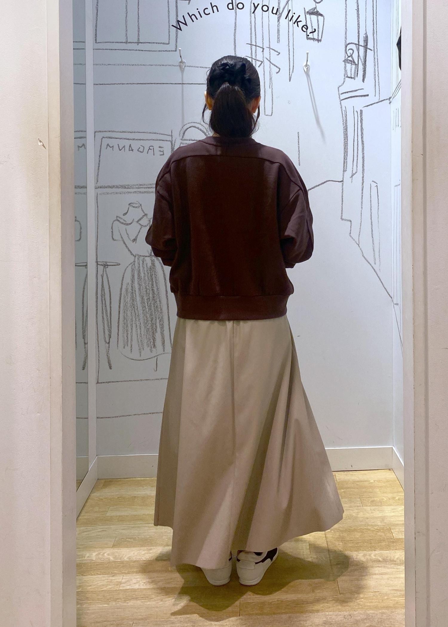 トップスがカジュアルなカーディガンなので、ボトムスをレザーのスカートにすることで大人っぽさも出しました。