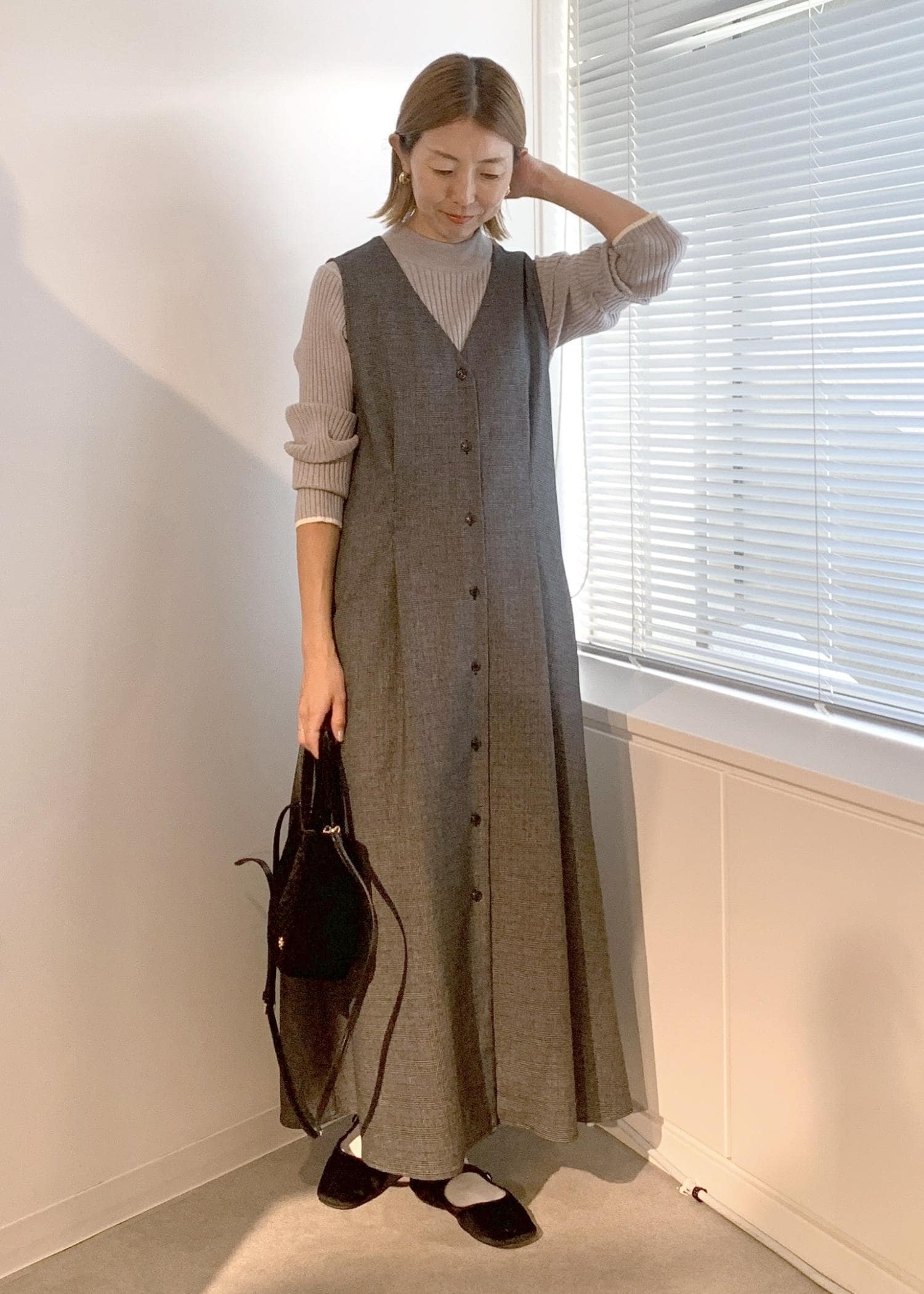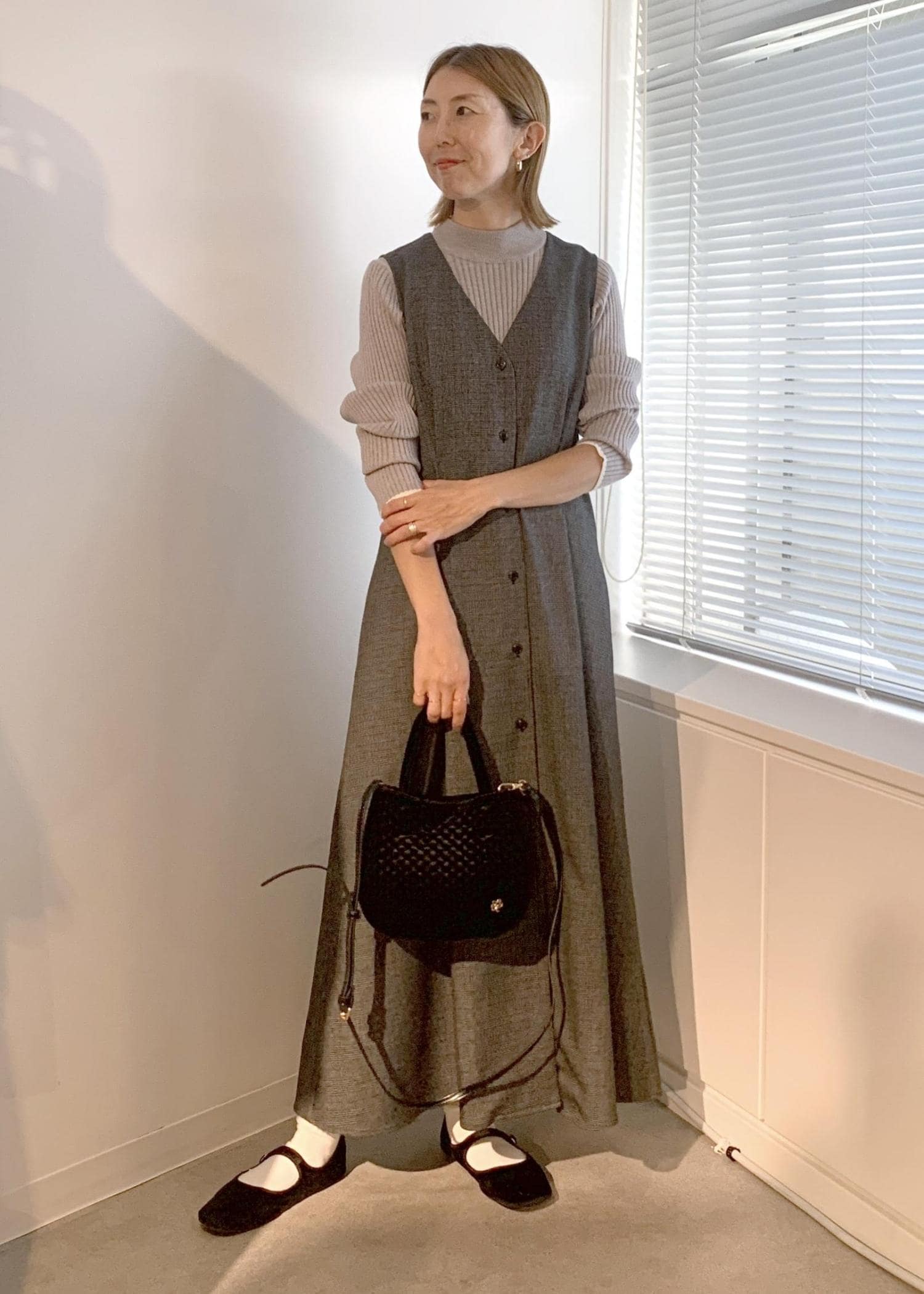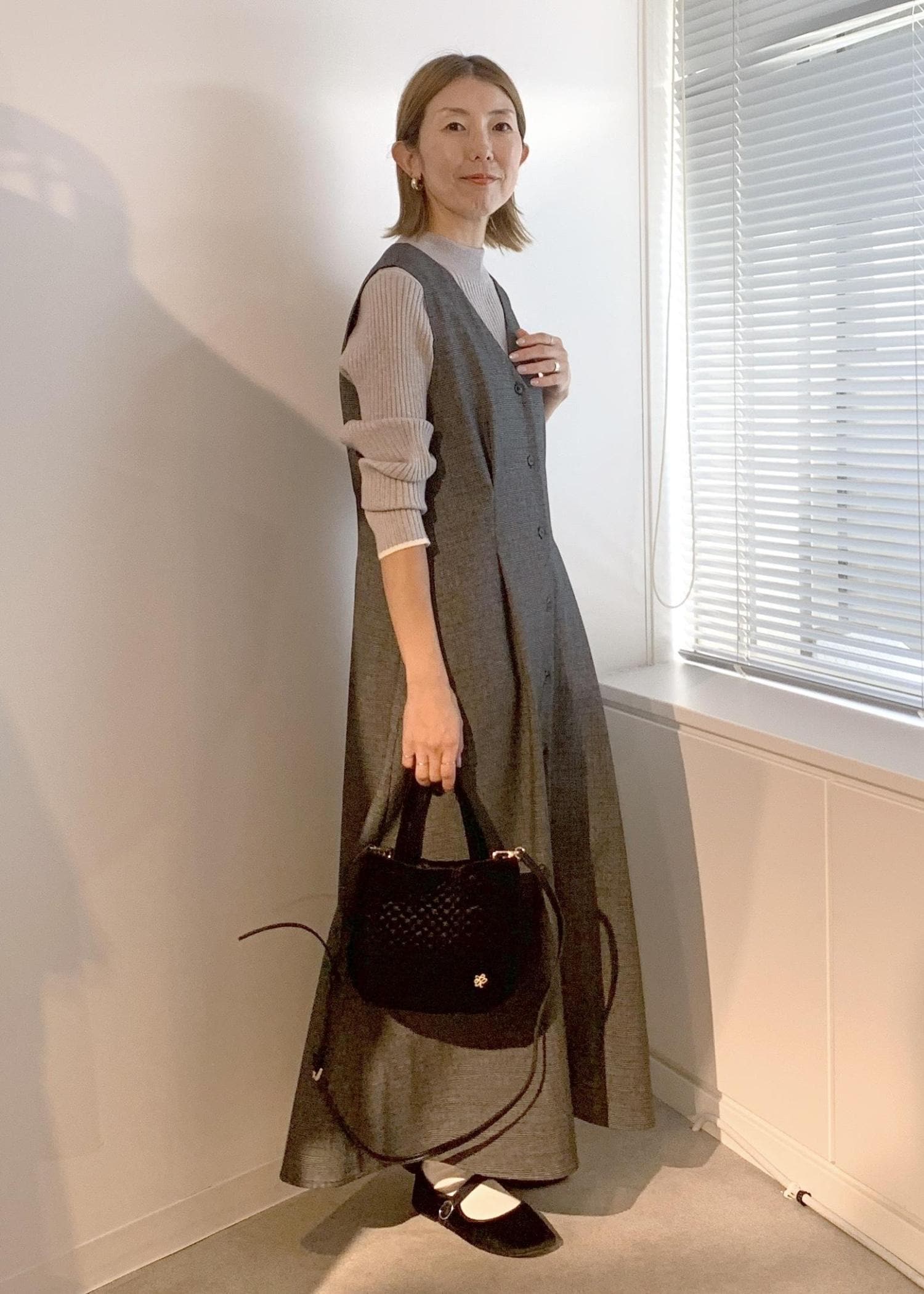 リブニットをインナーに合わせたシンプルなスタイリング。