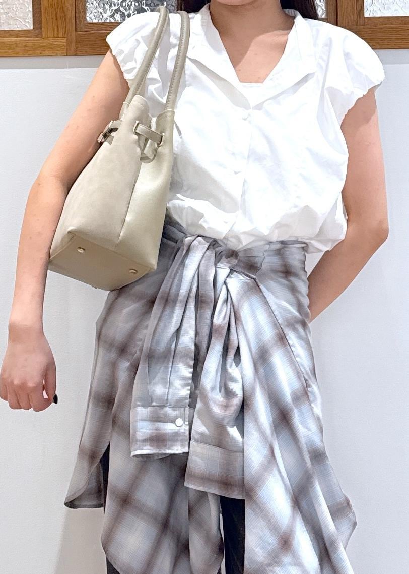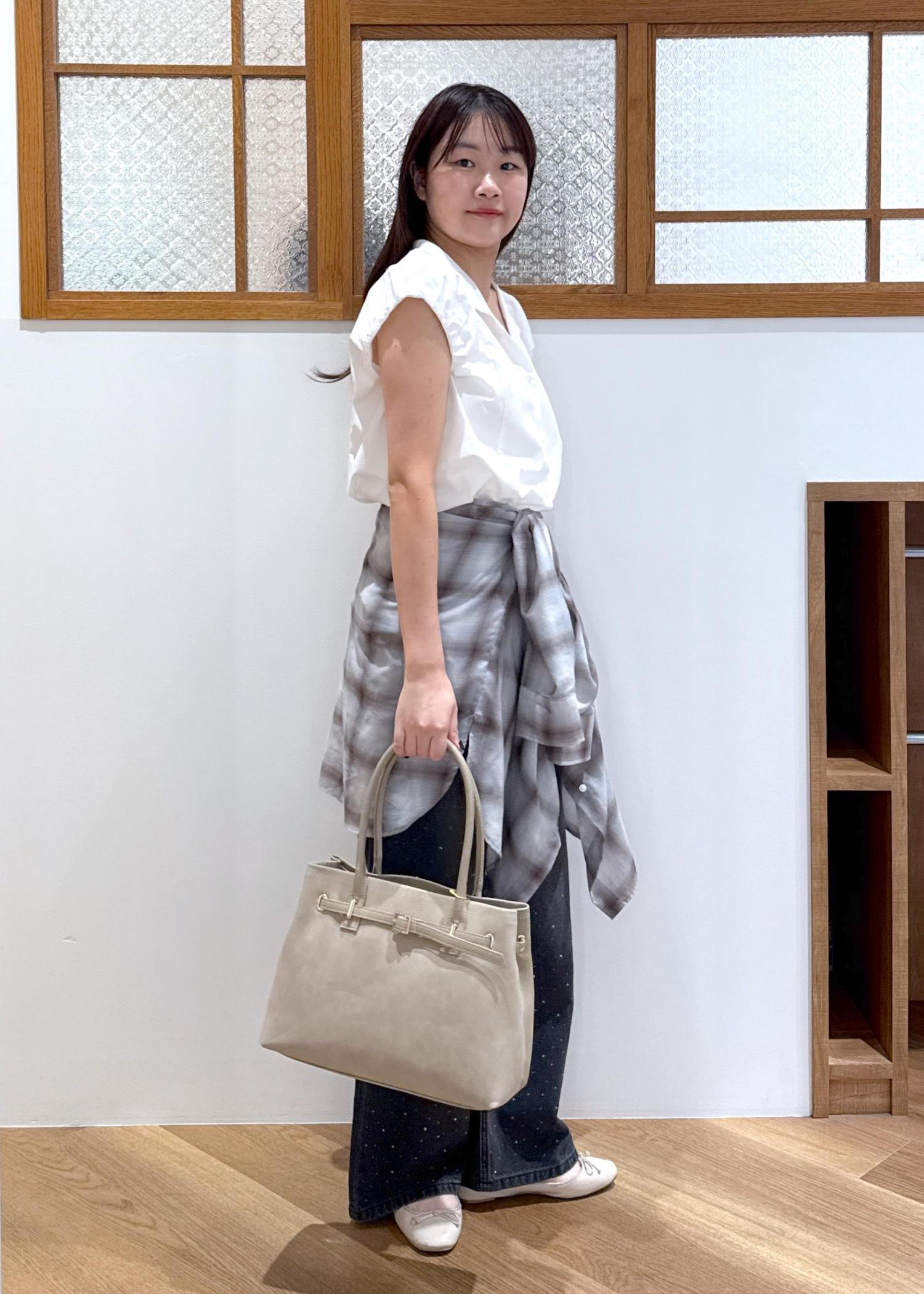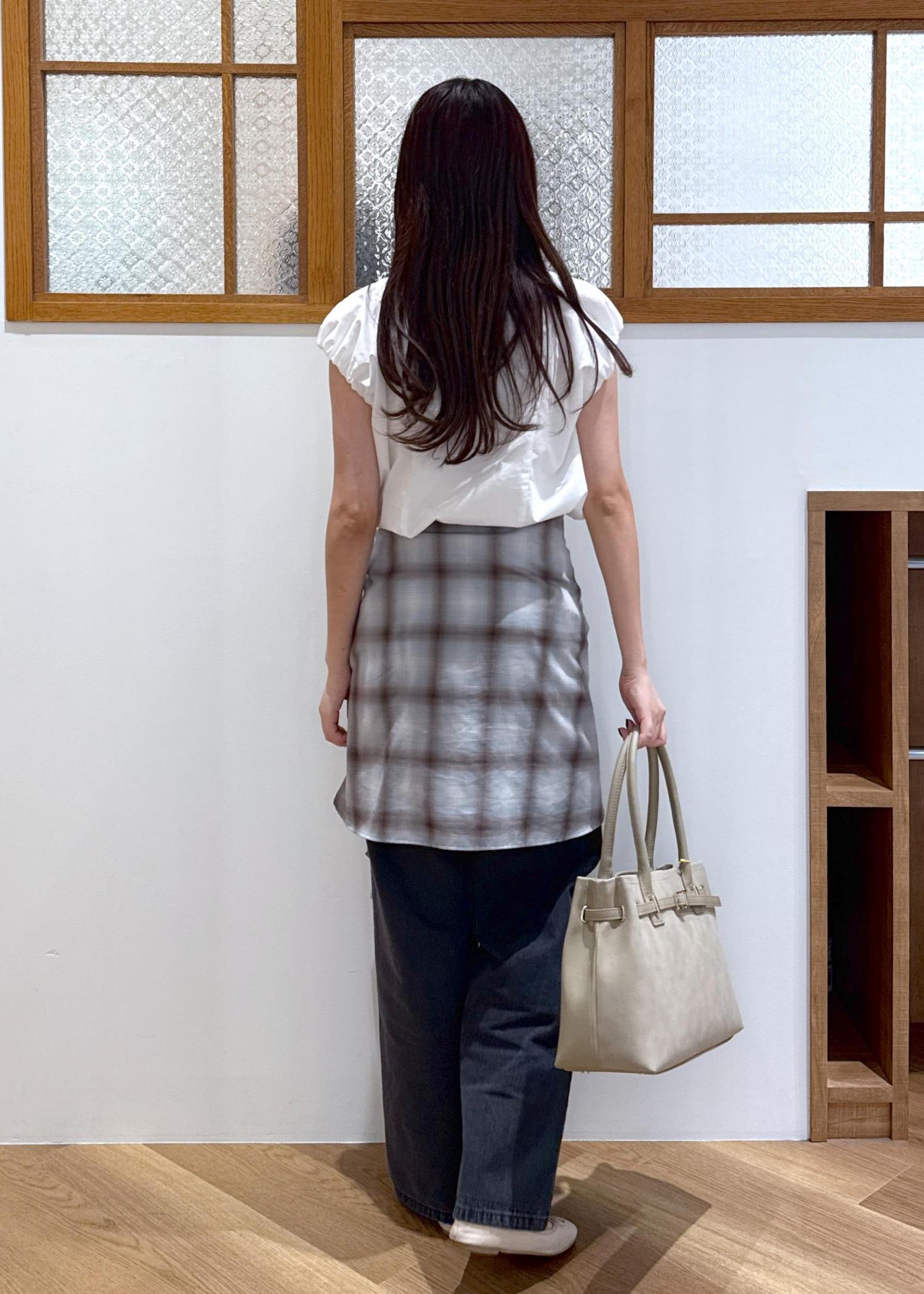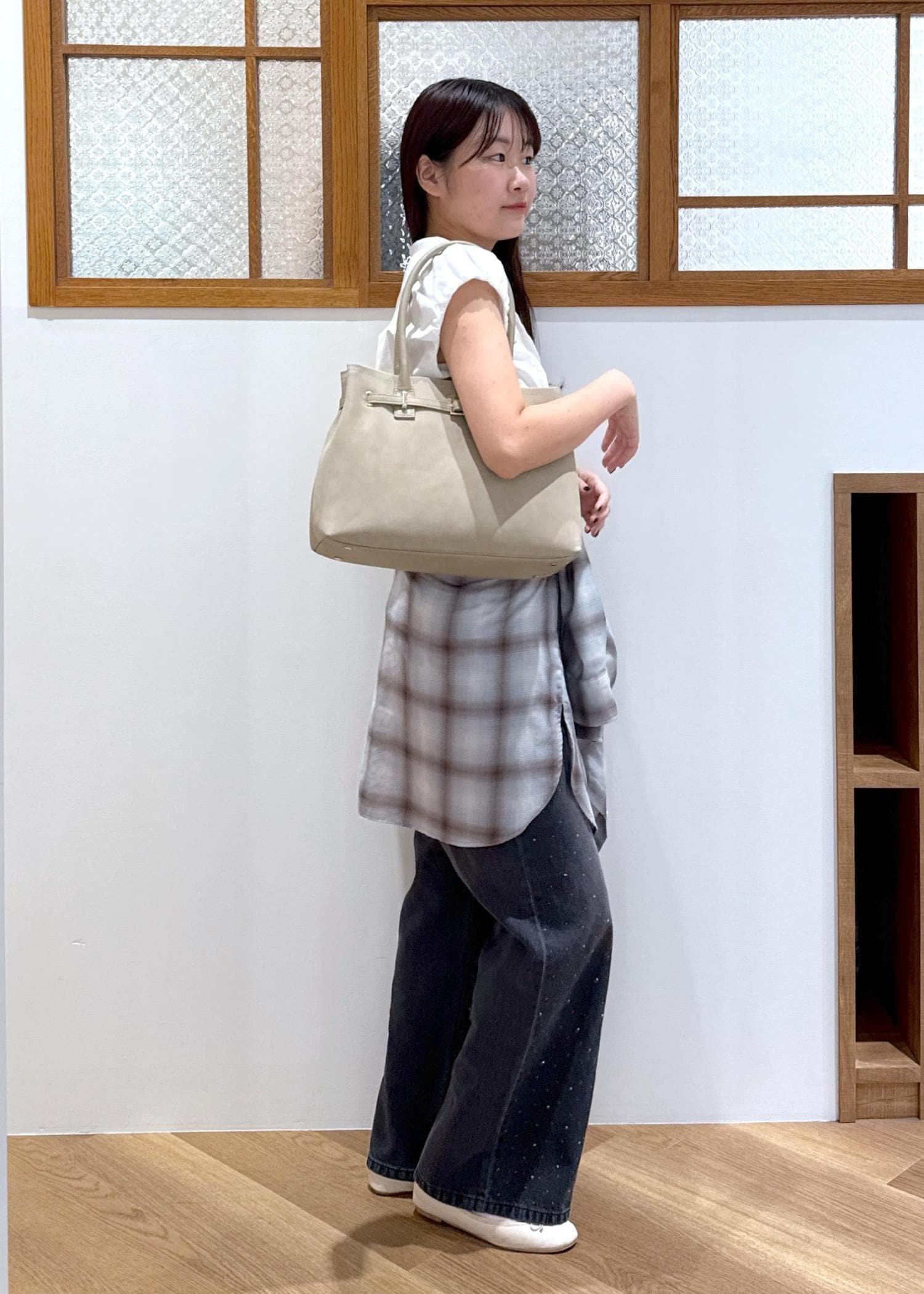 スエード調のバッグとチェック柄のシャツを取り入れた秋を意識したコーディネートです。