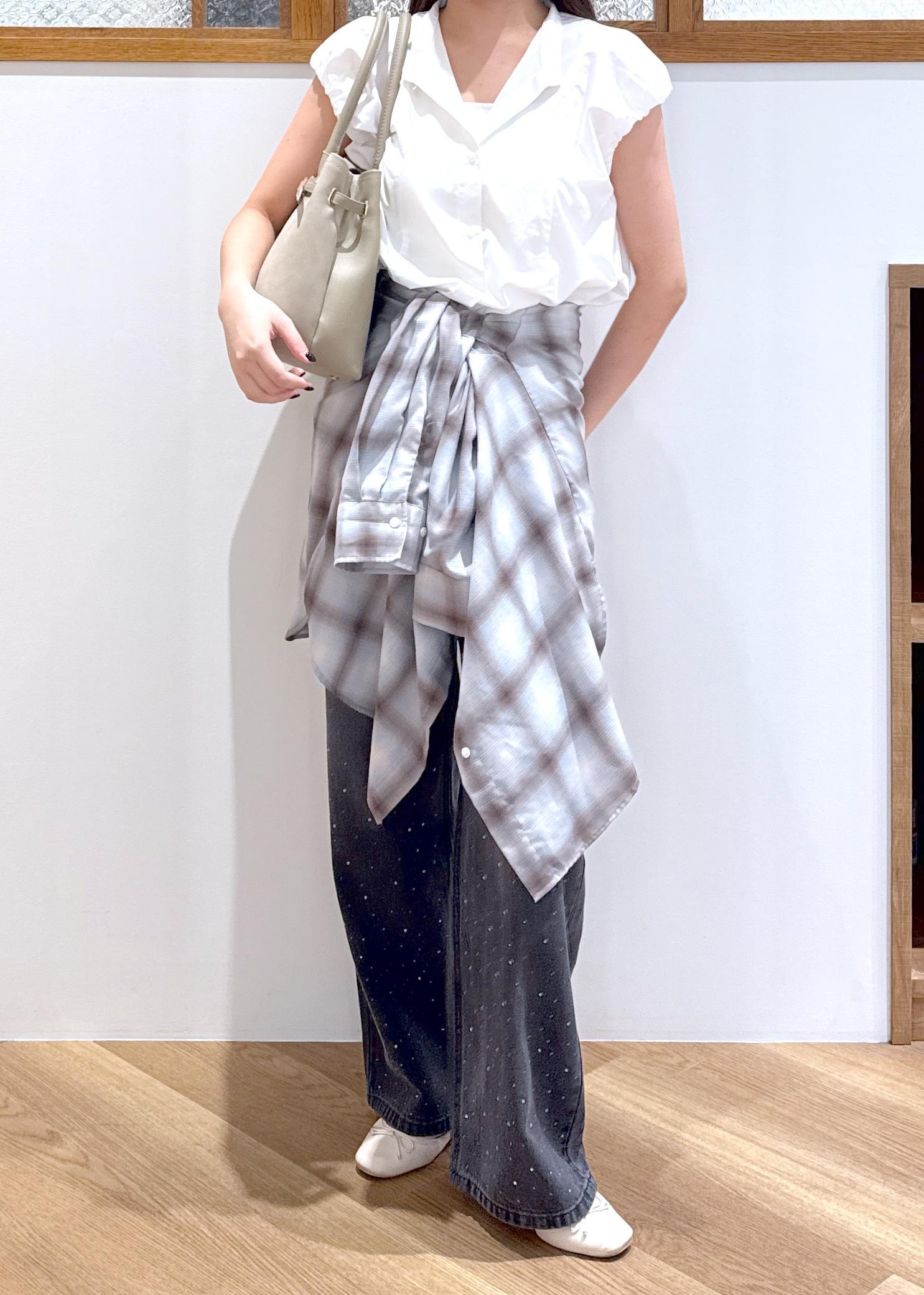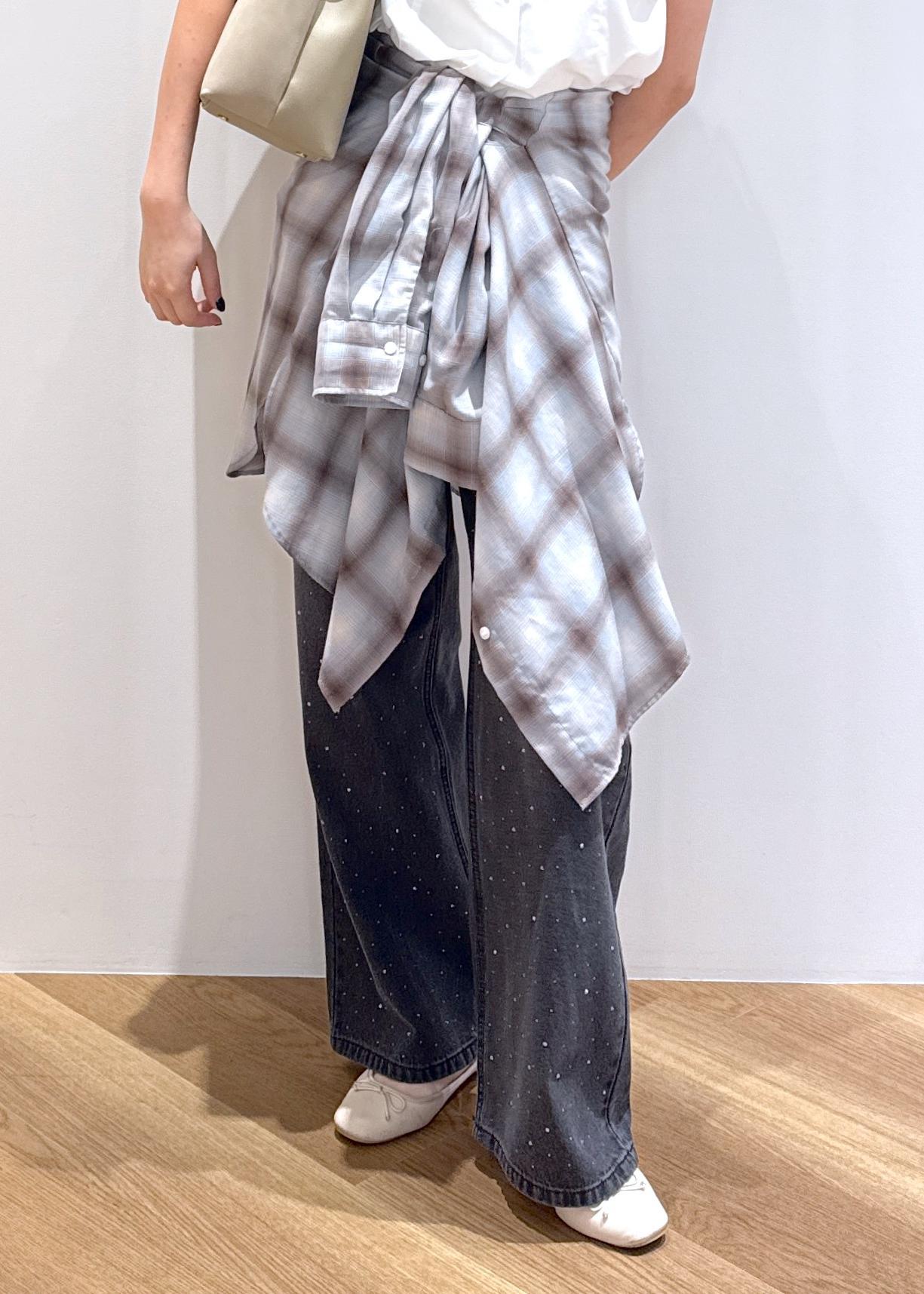 パンツはトレンド感のあるビジューデニムを取り入れているのがポイントです。