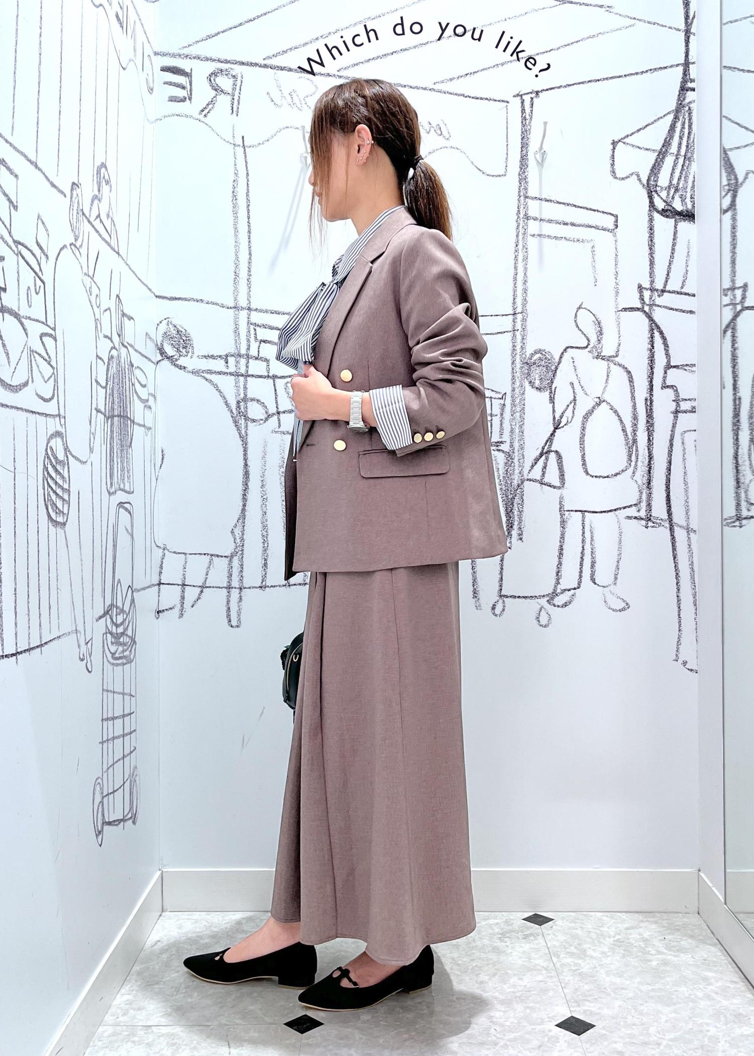 人気のブラウンのレディハンサムシリーズジャケットのスカートのセットアップコーデです。ストライプのリボンシャツをインナーに大人可愛いスタイリング。華奢見えするパンプスと合わせるとより大人の女性らしく。お仕事にもおすすめのコーデです。