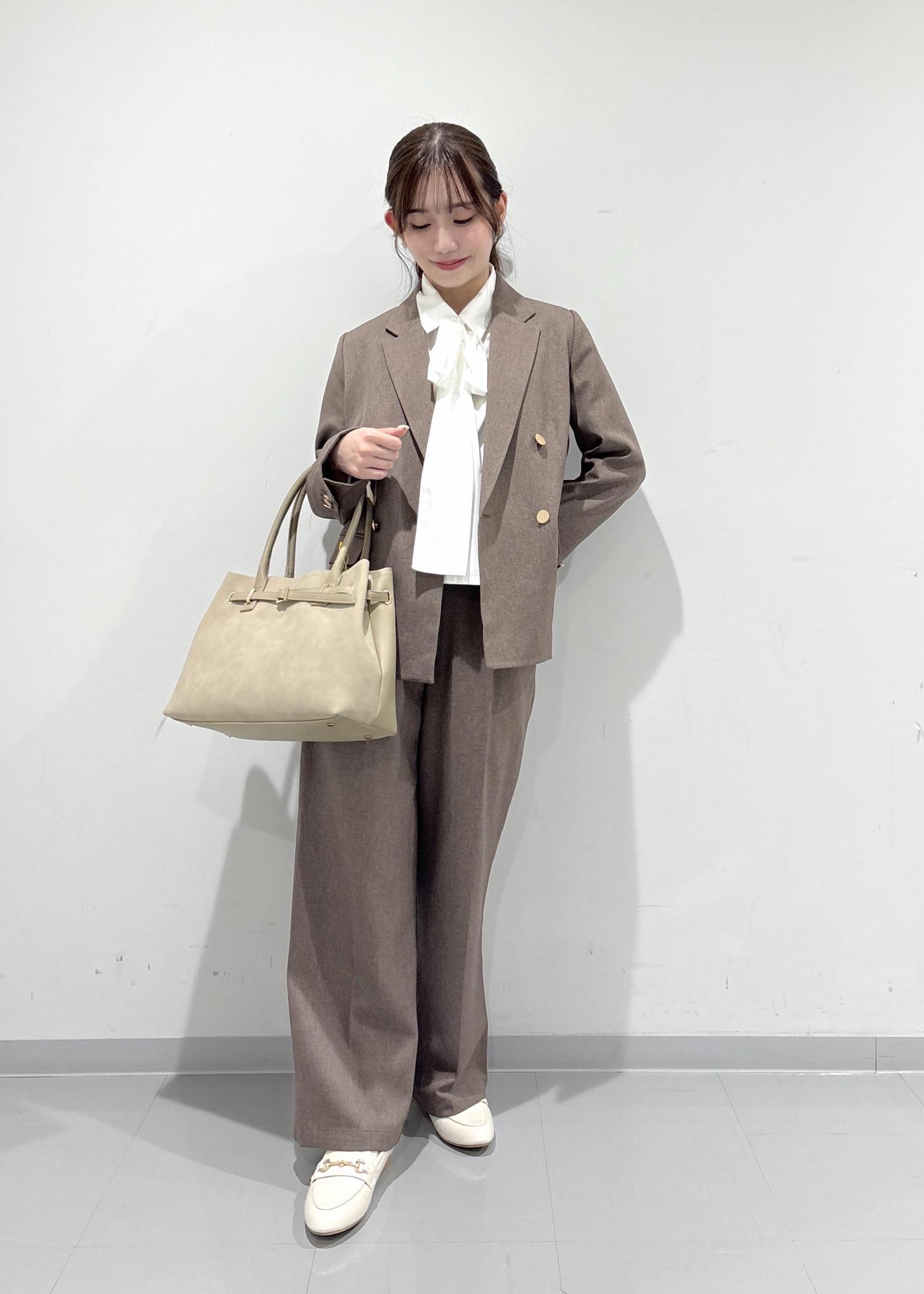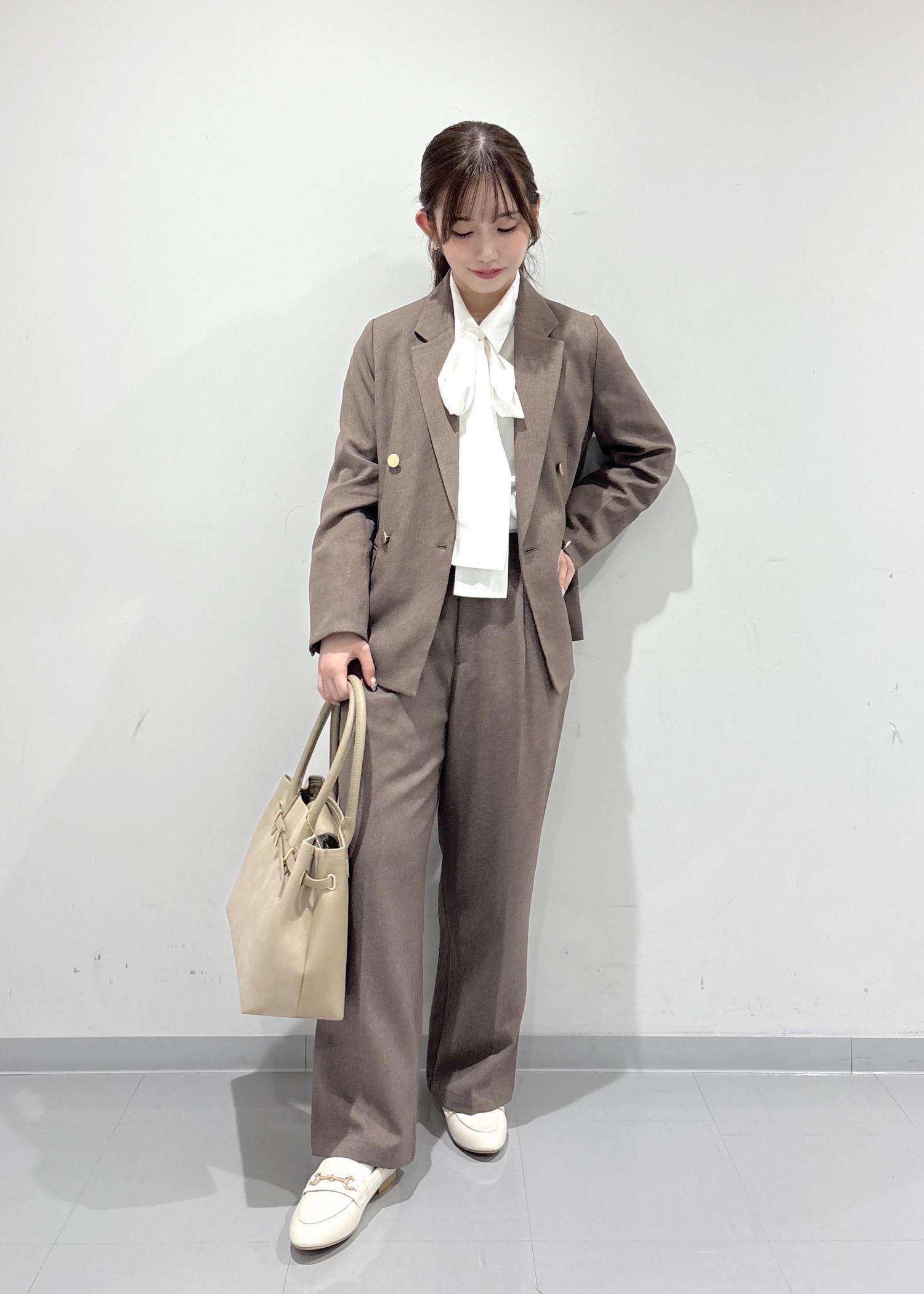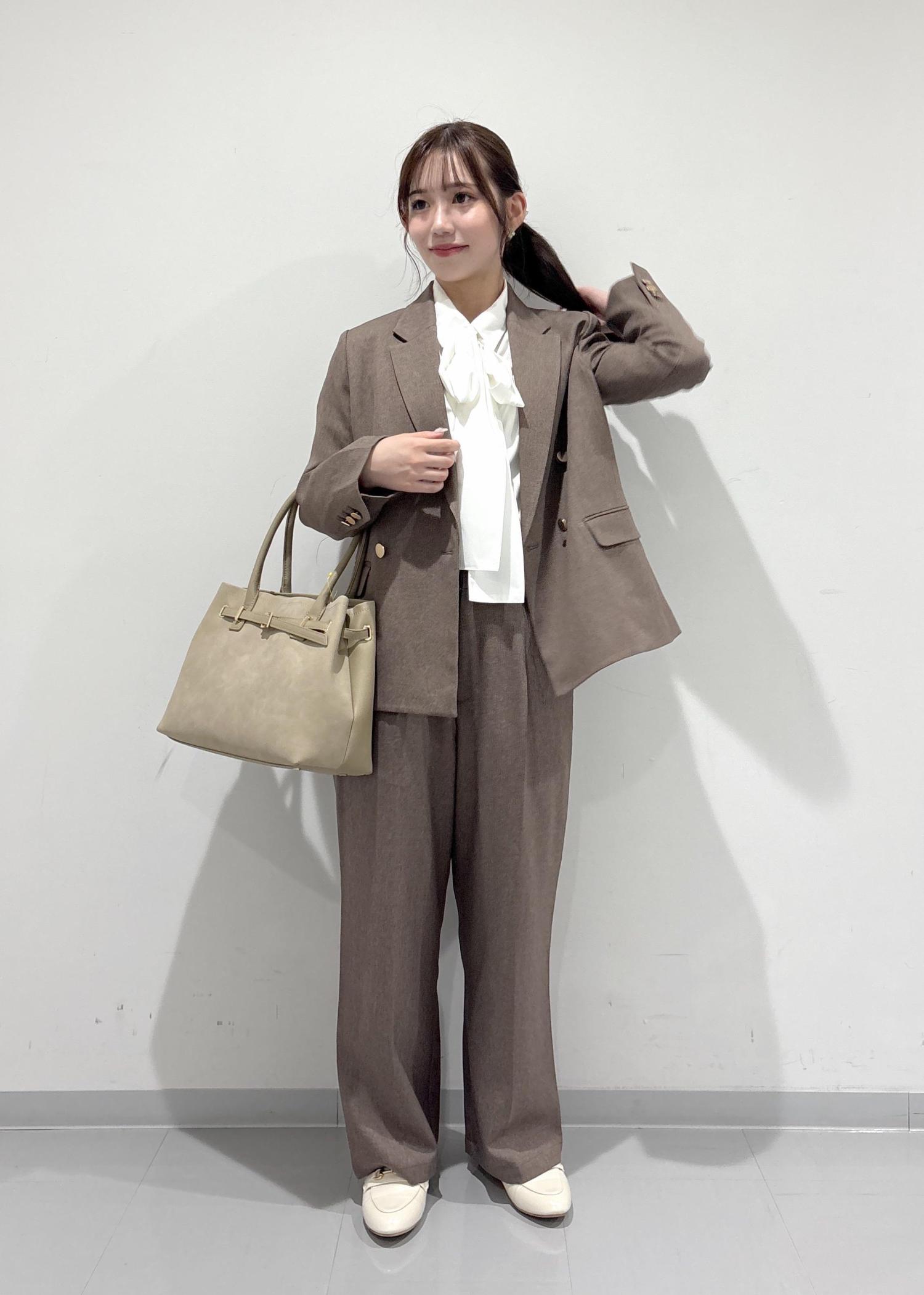 ブラウンのセットアップが秋感があってお洒落です!他とは被らない綺麗めコーデになっています!白のボウタイのシャツで少し可愛らしい印象を出して、ブラウンのバッグでセットアップとお揃いにしてみました!ボタンを閉めたらまたカッチリとしたカッコイイ印象になると思います!