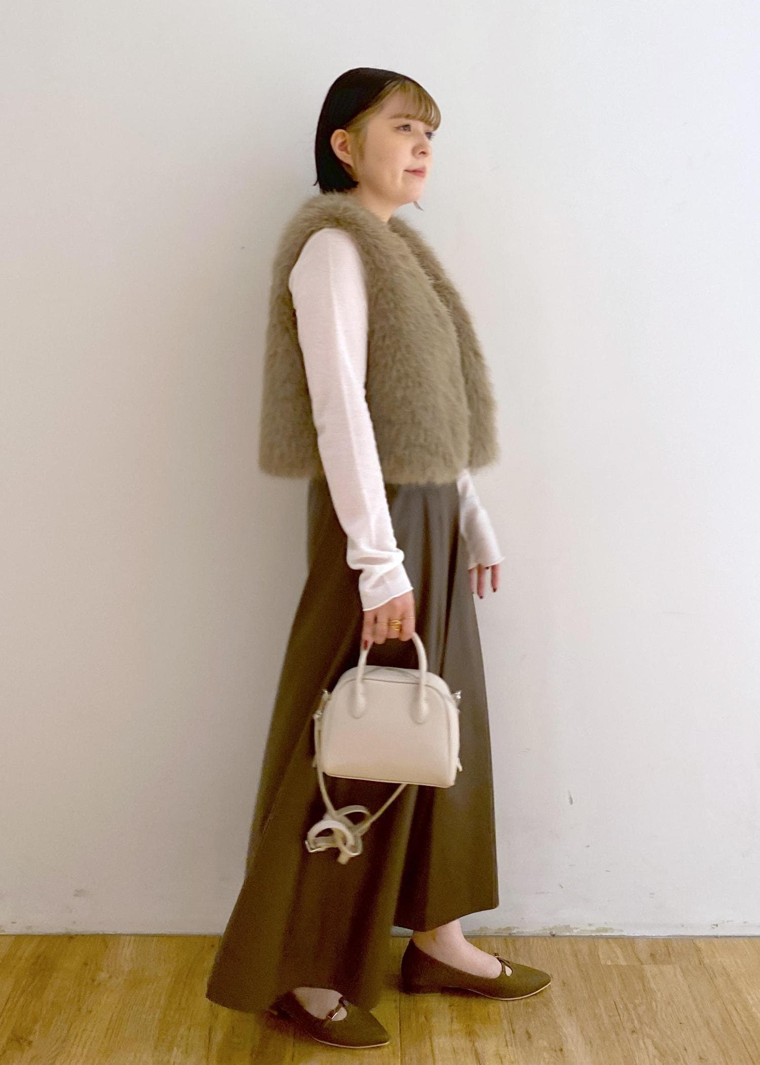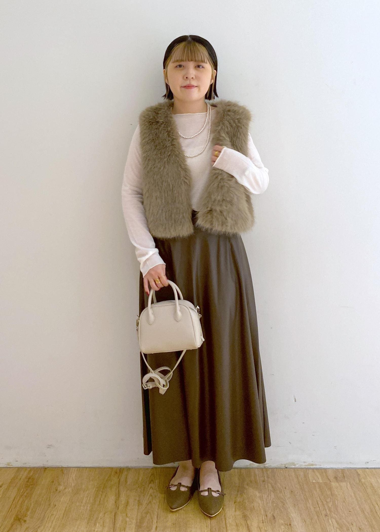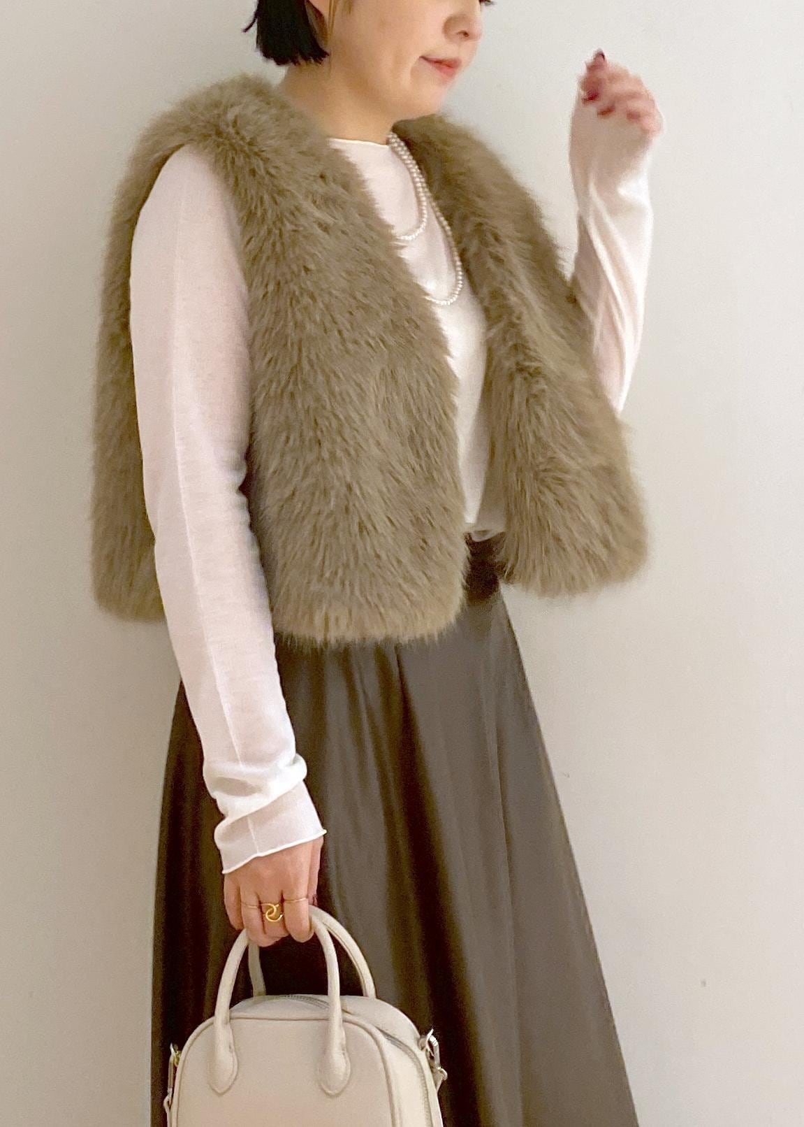 ROPÉ PICNICファーベストダークブラウン / F¥6,996レビュー156cmでヒップは見える丈感です。裏地付きなので秋から冬まで長く着用できそう◎ボリューム感が多少あるのでインナーは薄手が良さそう◎