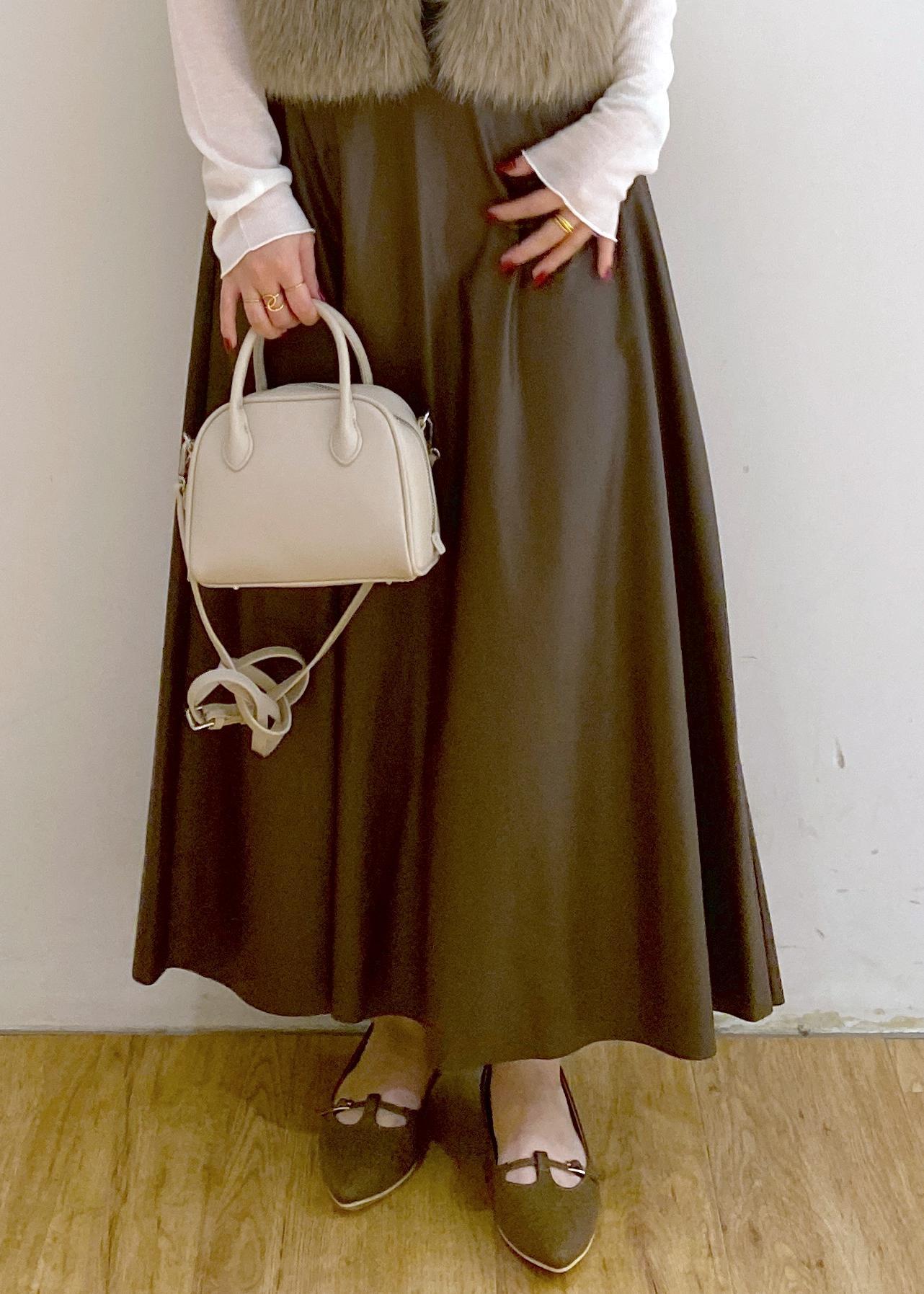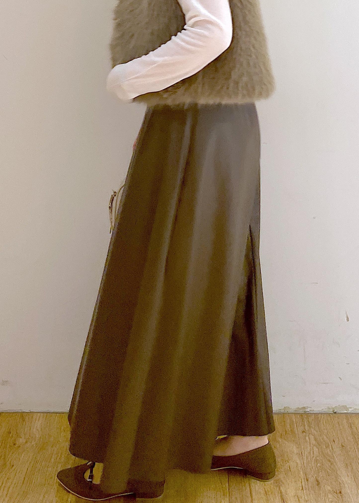ROPÉ PICNICシンセティックレザーフレアロングスカートダークブラウン / M¥4,994レビュー156cmでMサイズ着用すると足首にかかる長さ。ウエストはジャストサイズで落ちる感じもなかったです。裏地はないですが起毛っぽい素材になっているので透け感はないです◎