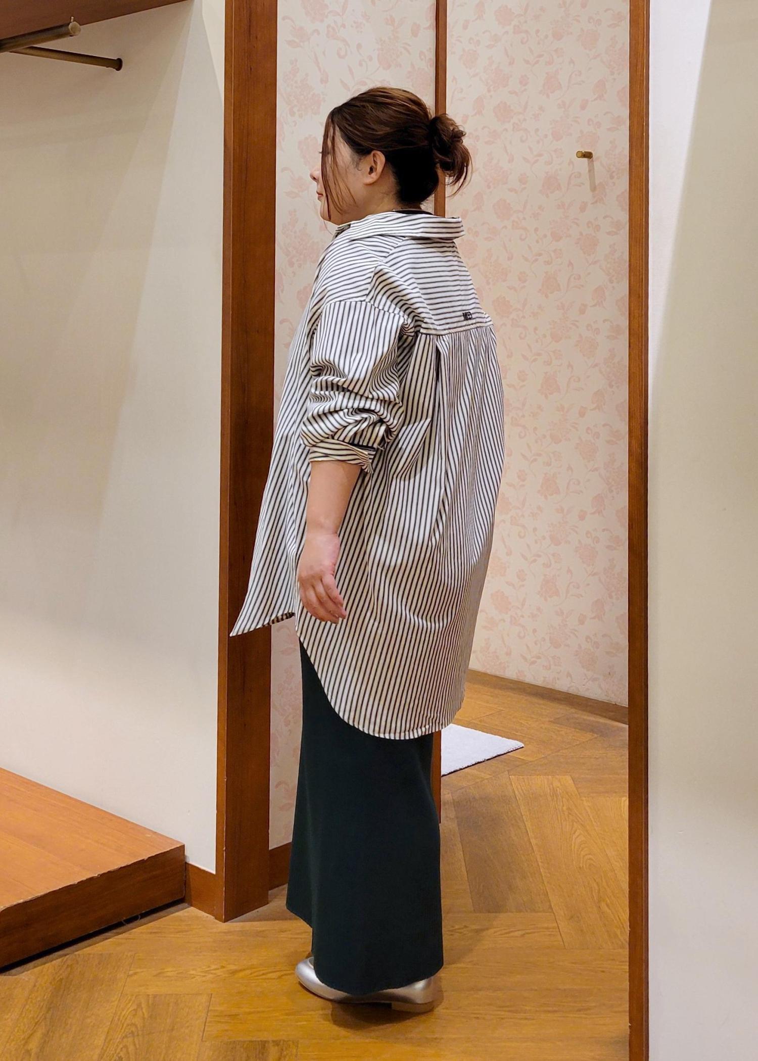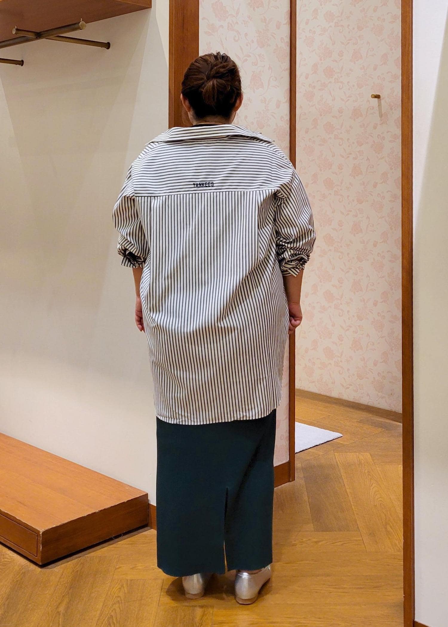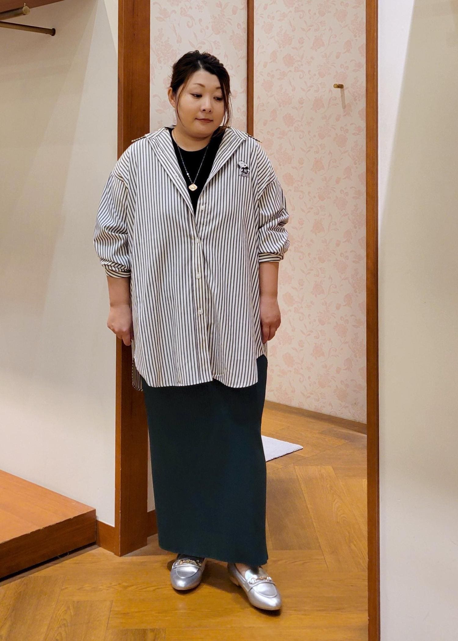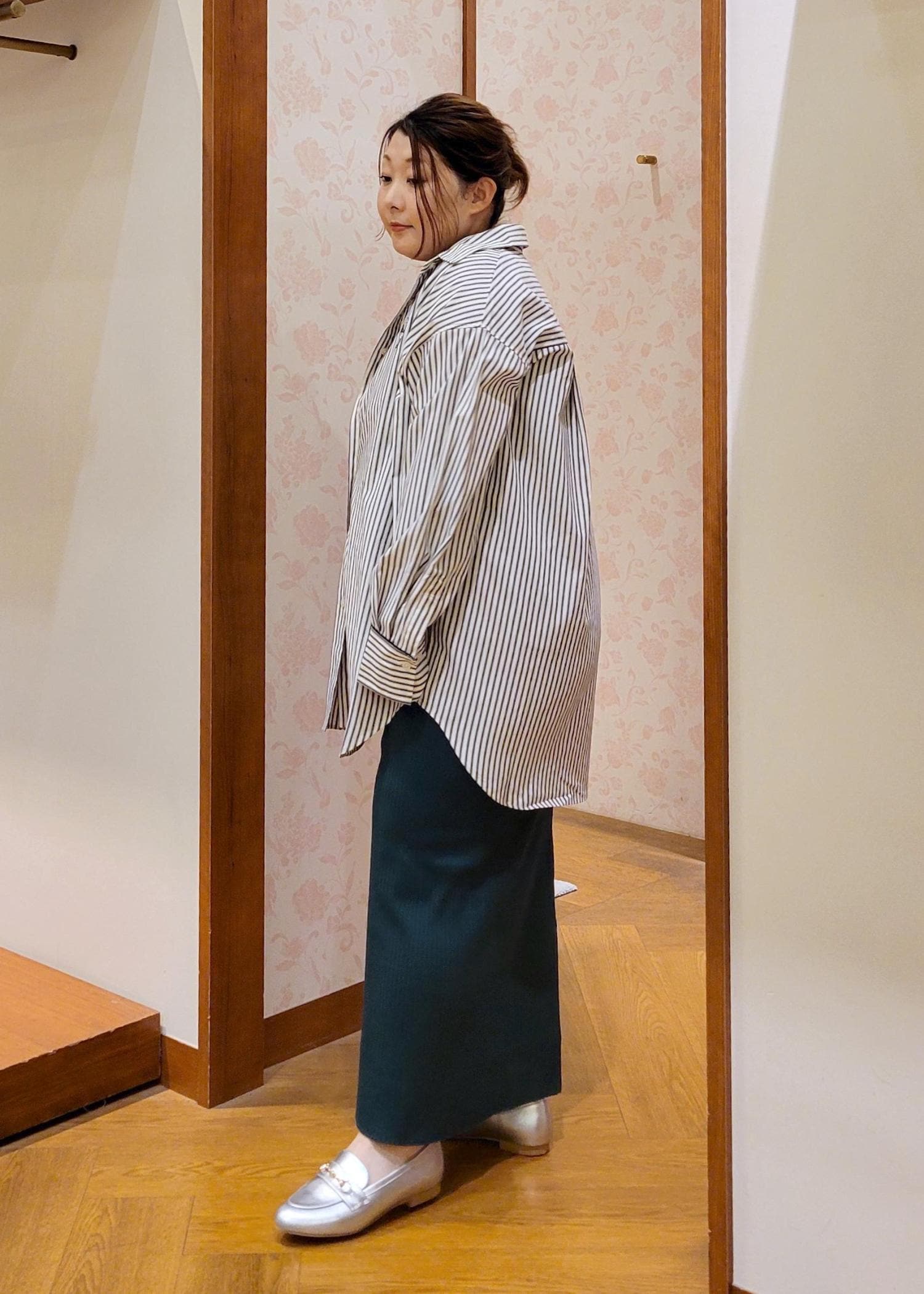 オーバーサイズシャツをタイトスカートで合わせたカジュアルスタイルです。
