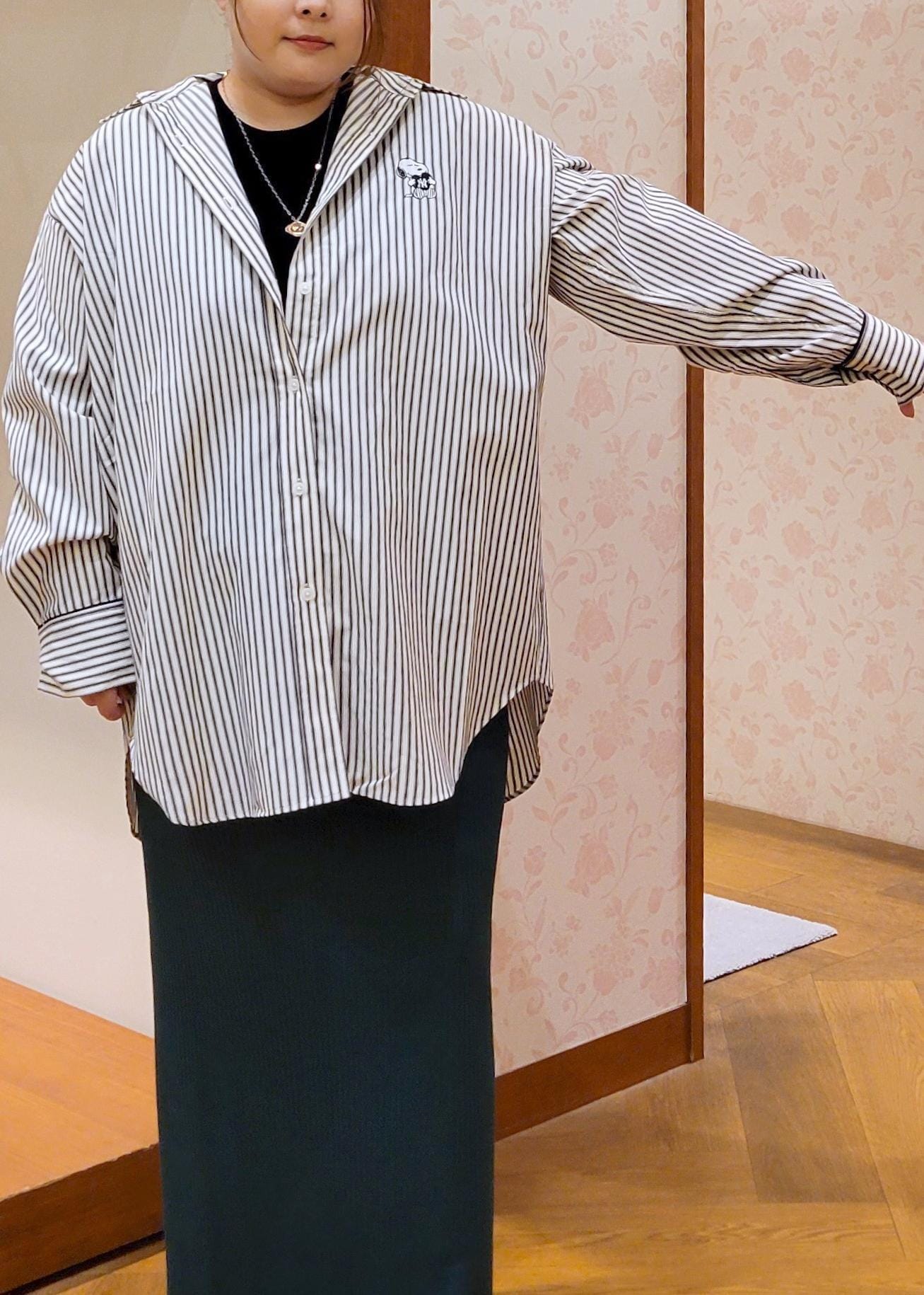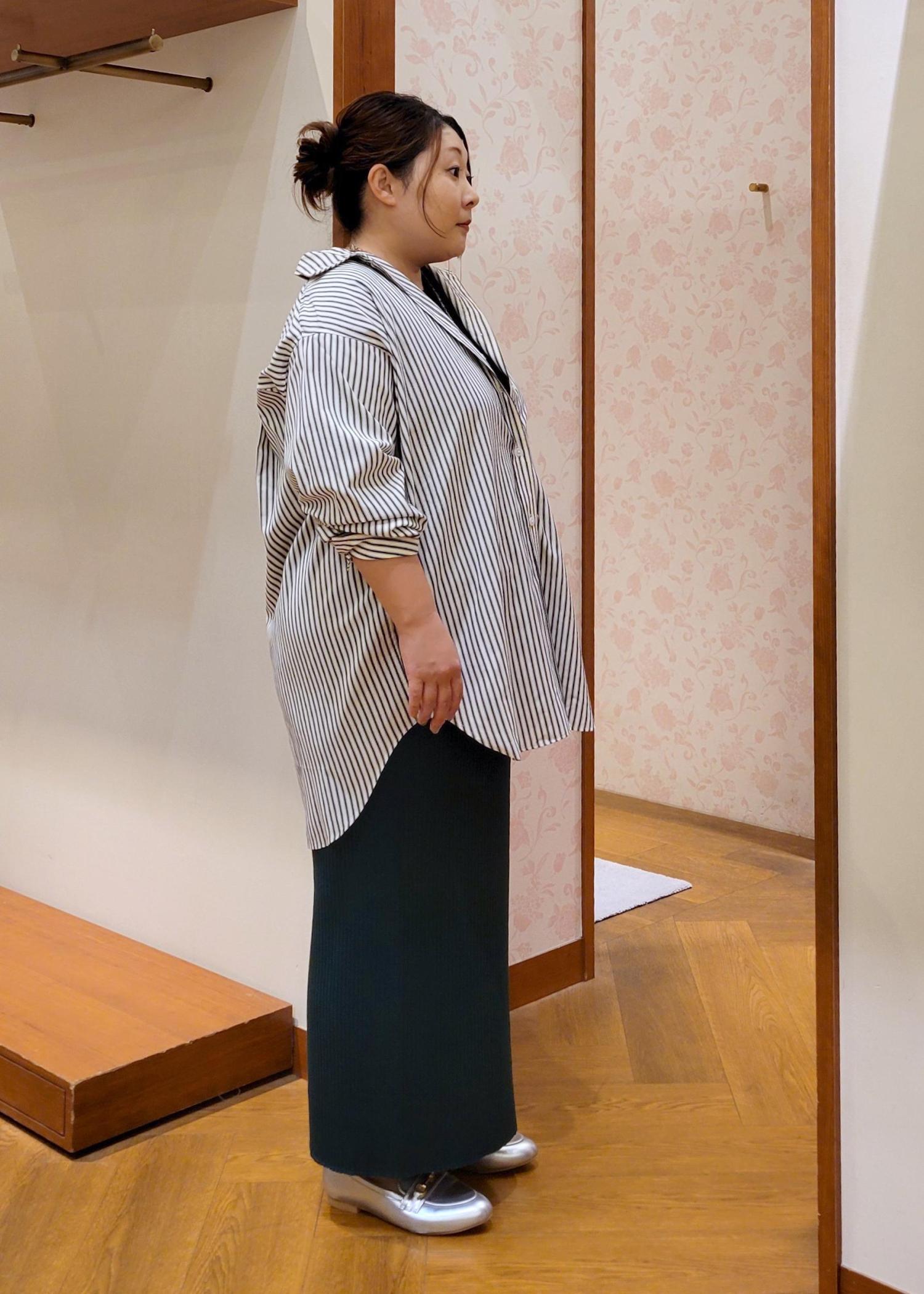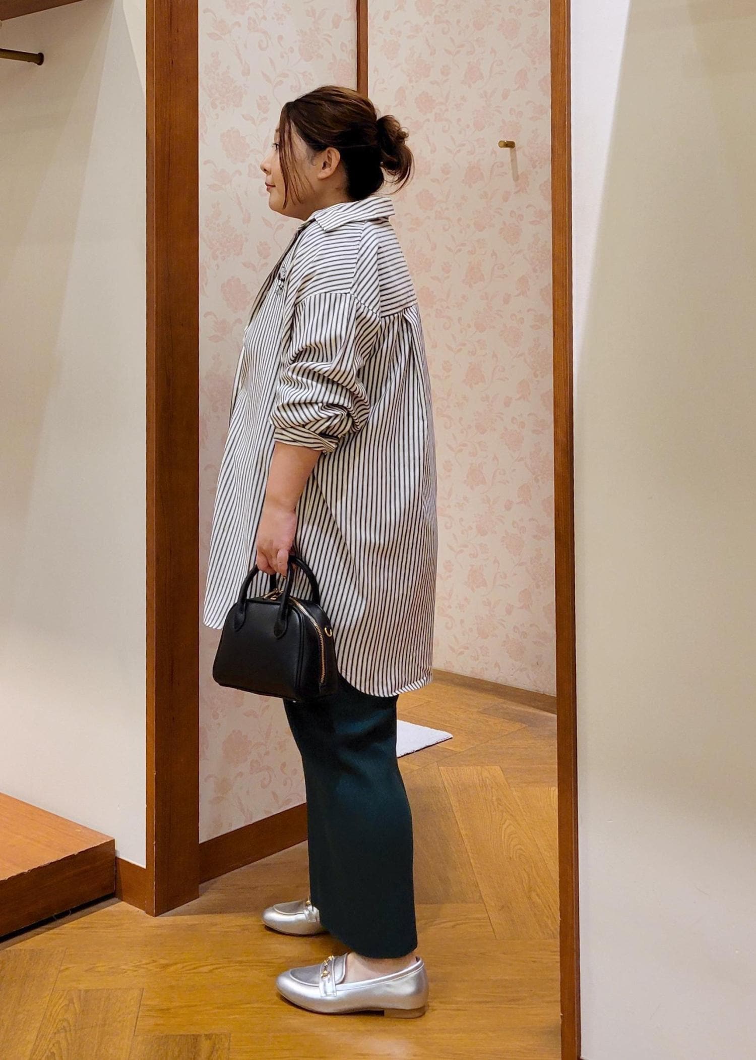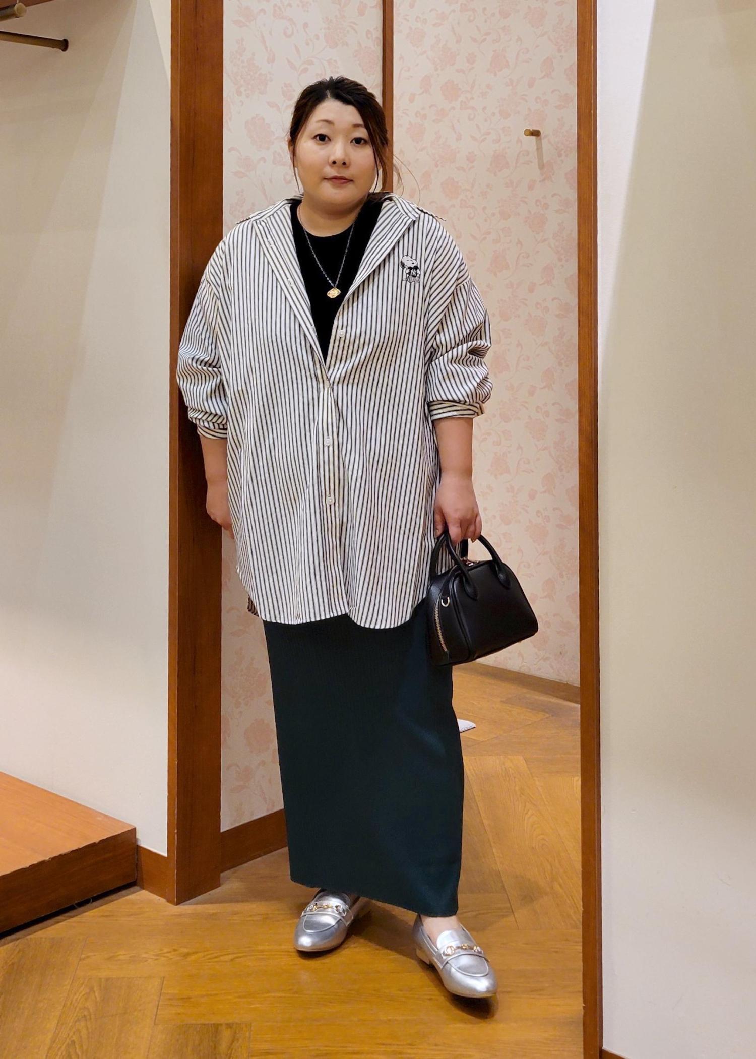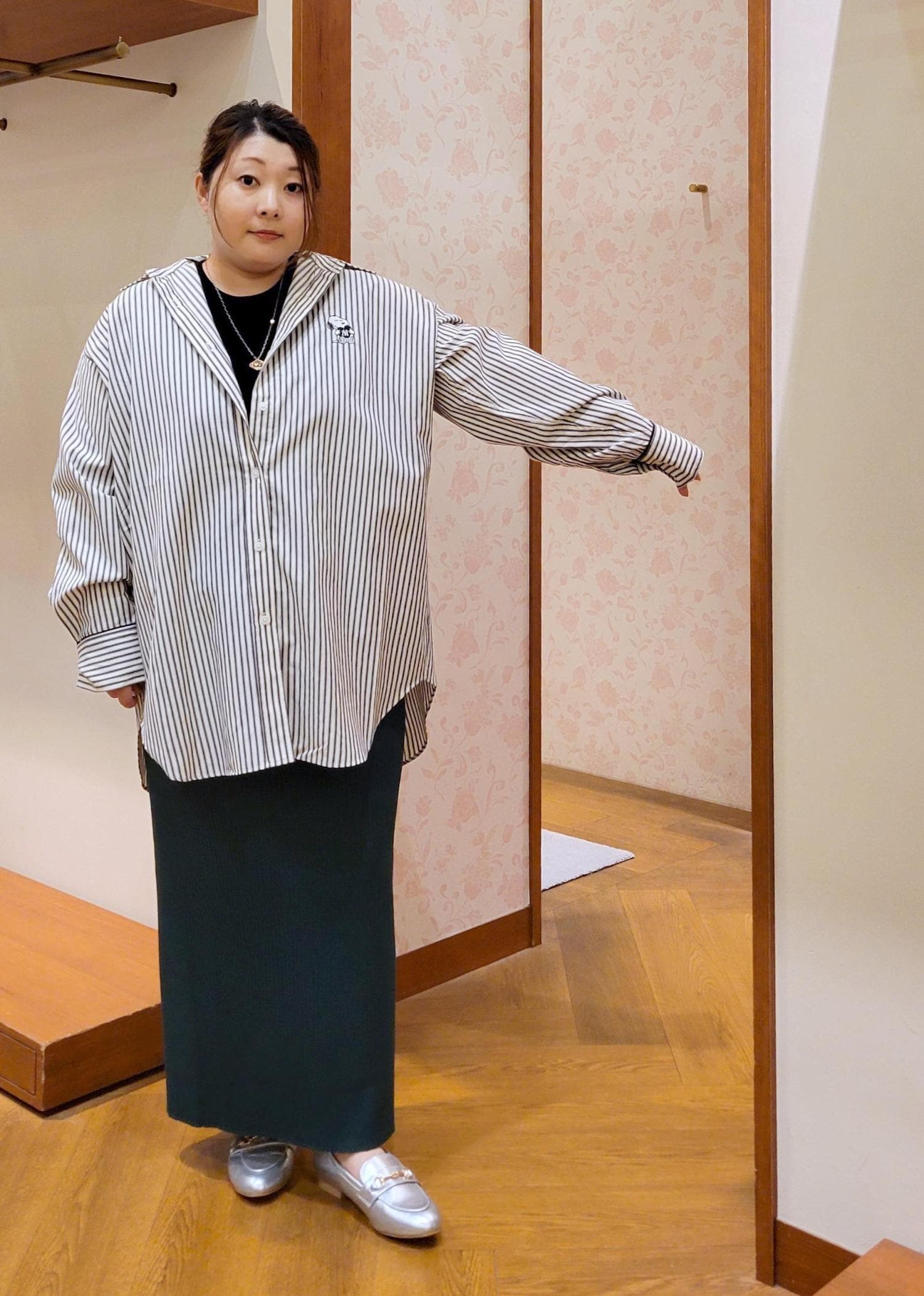 オーバーサイズシャツをタイトスカートで合わせたカジュアルスタイルです。