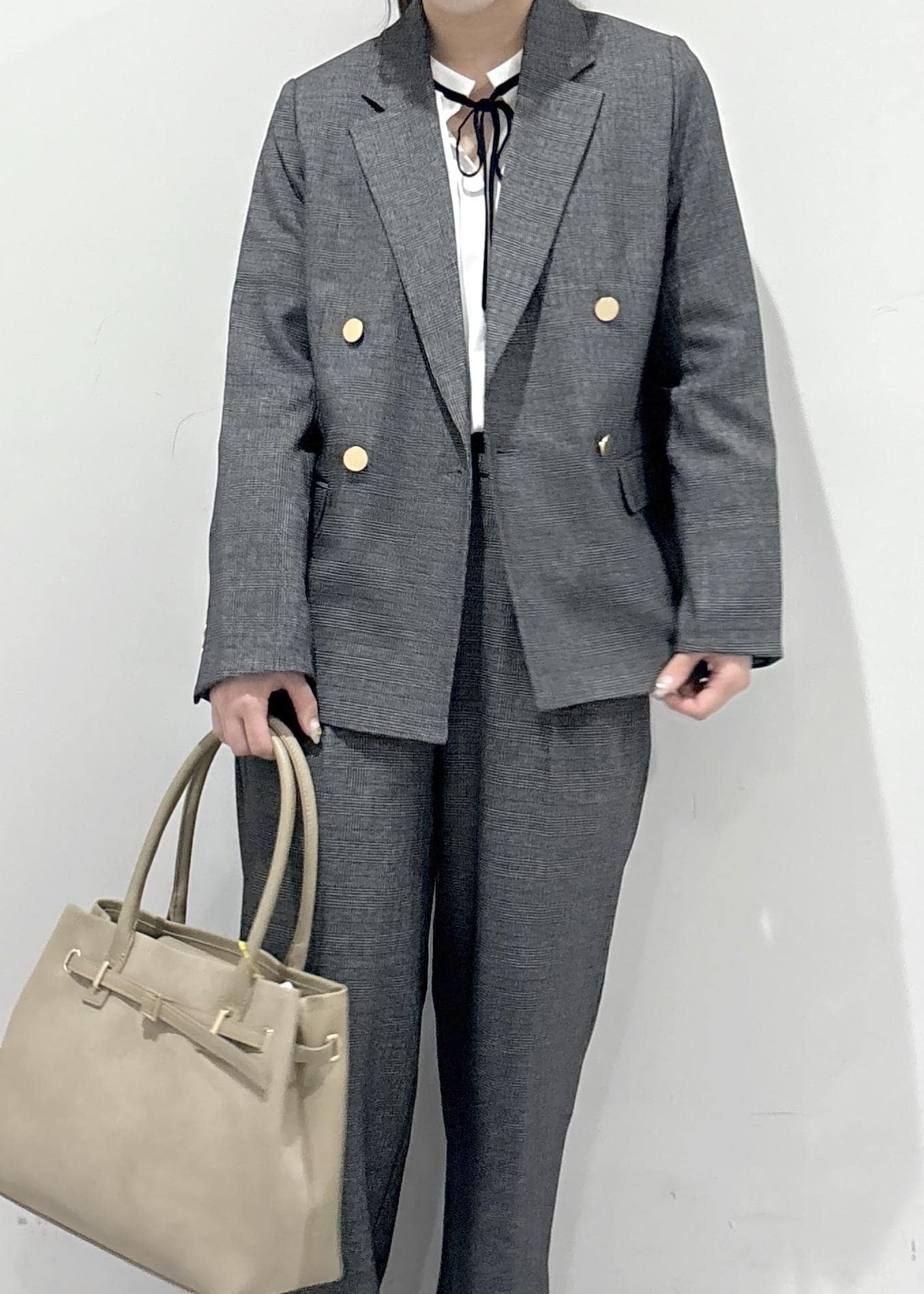グレーに細かいチェック柄がお洒落で落ち着いて見える所がポイントです!セットアップで着ると綺麗でカジュアル感も増します!中のブラウスのリボンが海外感も出てめちゃくちゃ可愛いのもポイントです!