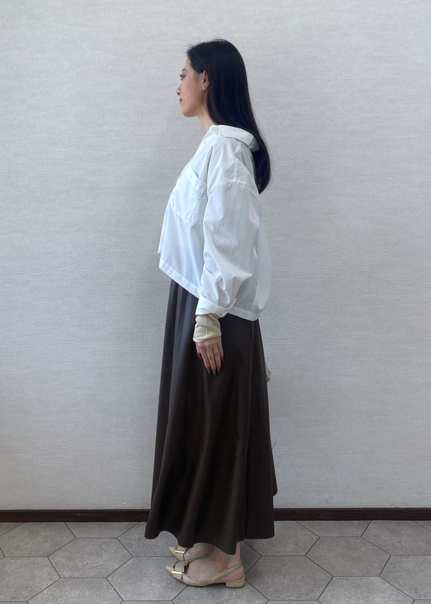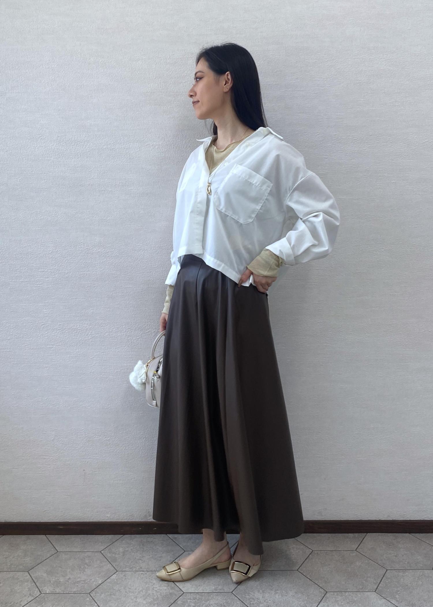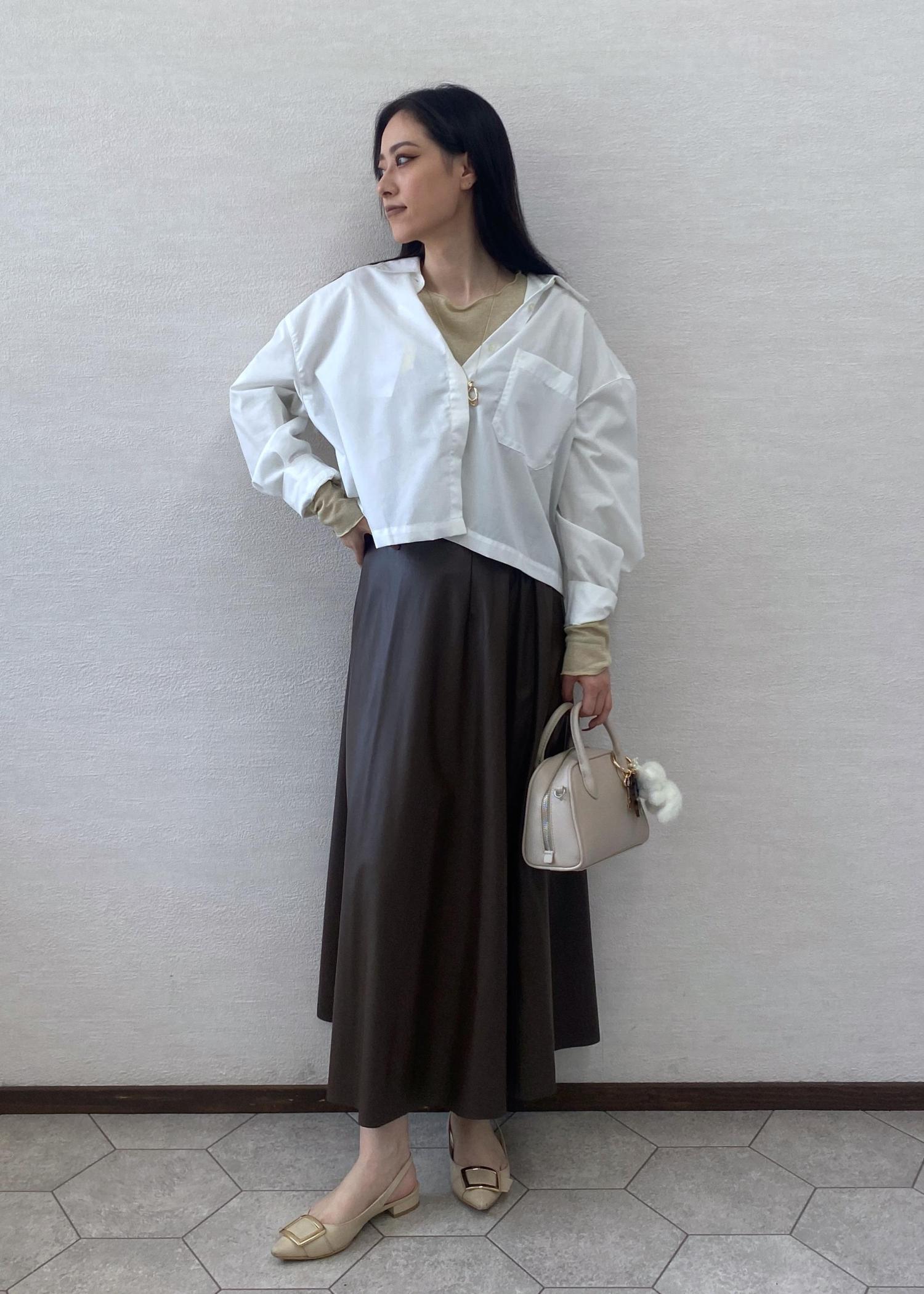 きちんと感のあるベーシッククロップドシャツをボタンを途中まで開けて抜け感をだしお出かけスタイルに。秋の雰囲気がでるレザースカートを合わせキレイめコーディネートにしました。