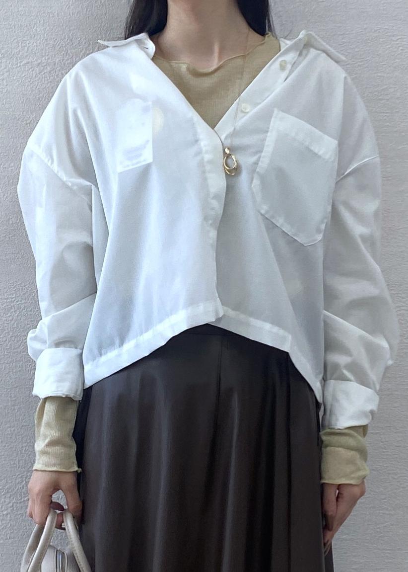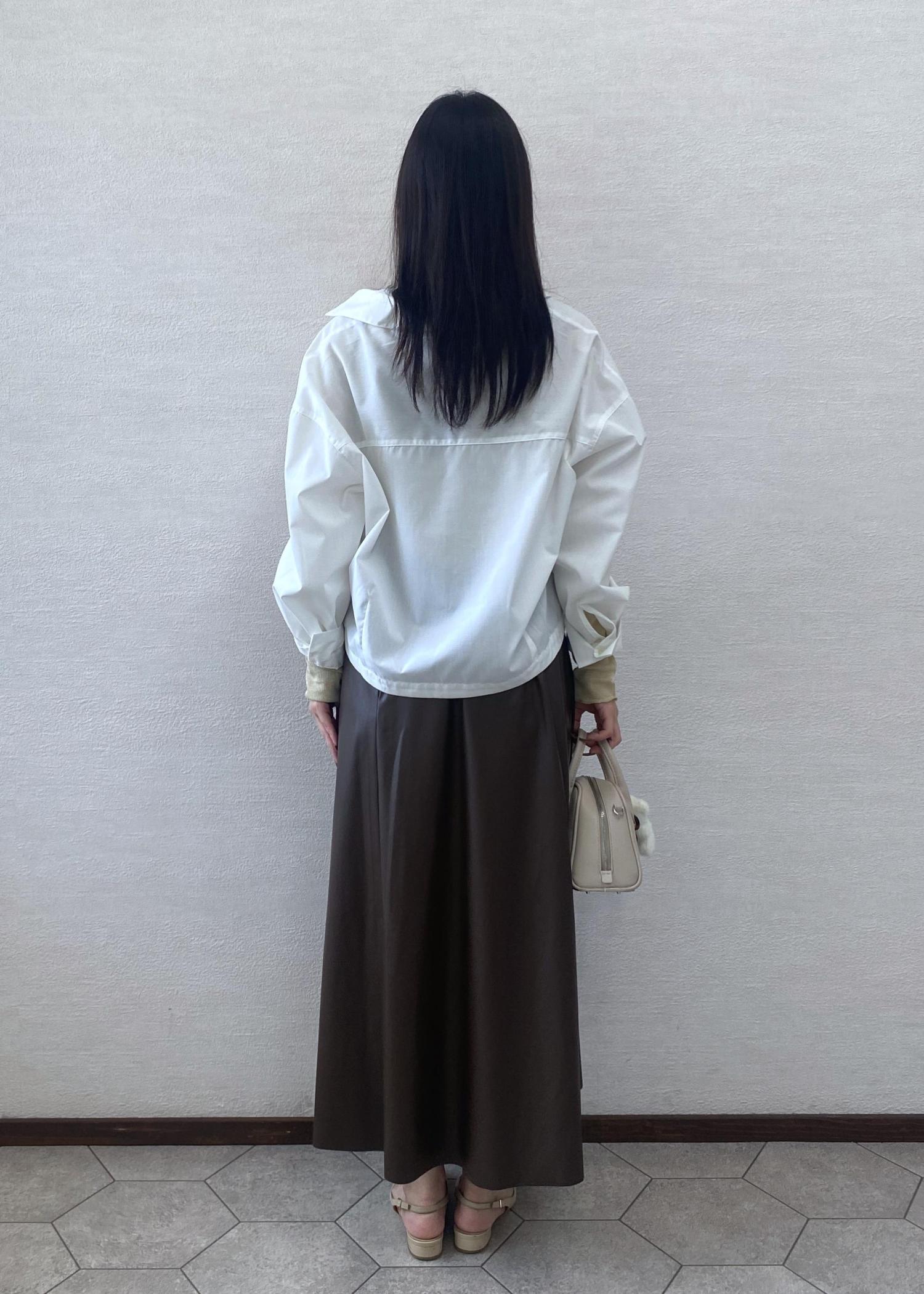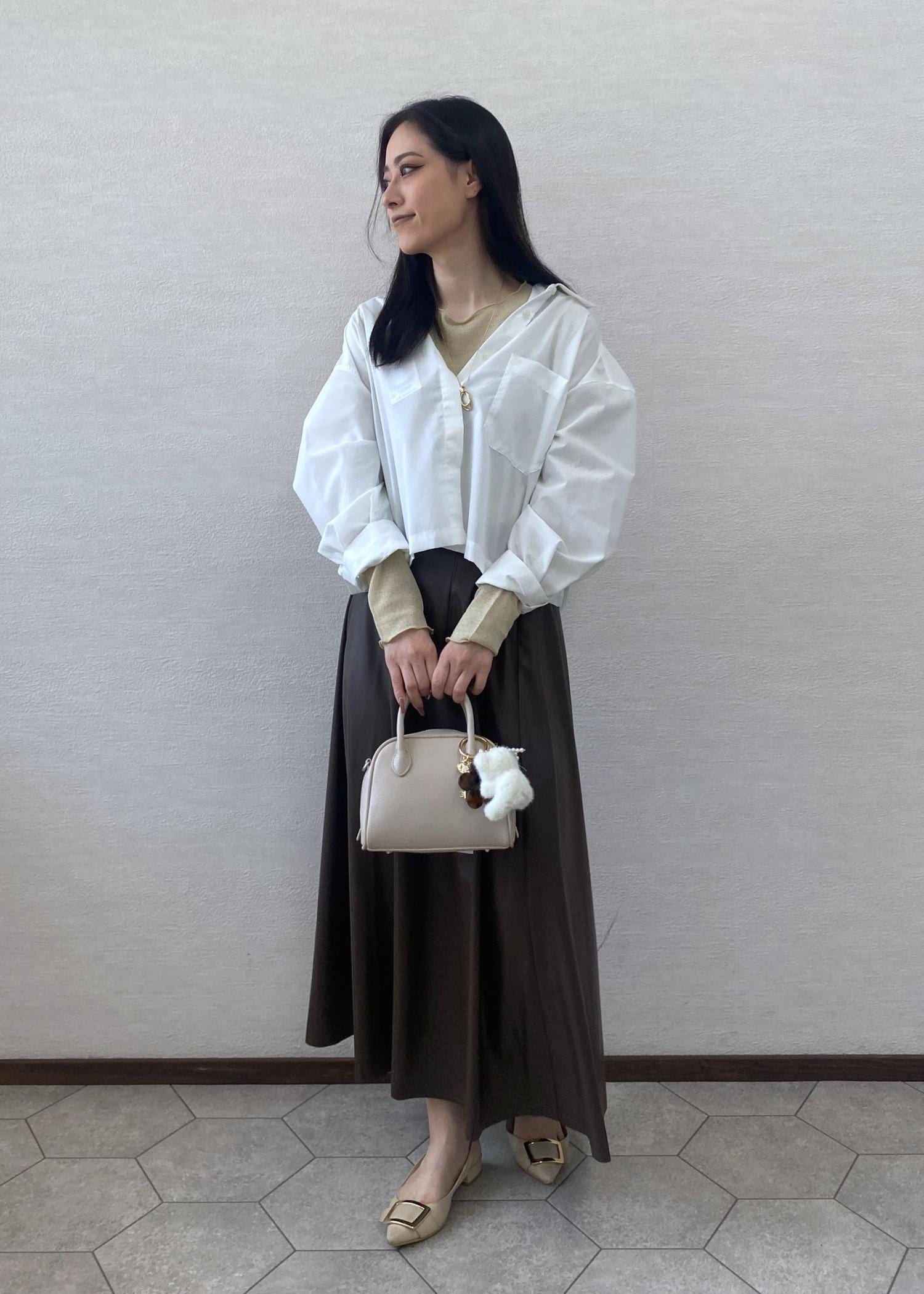きちんと感のあるベーシッククロップドシャツをボタンを途中まで開けて抜け感をだしお出かけスタイルに。秋の雰囲気がでるレザースカートを合わせキレイめコーディネートにしました。