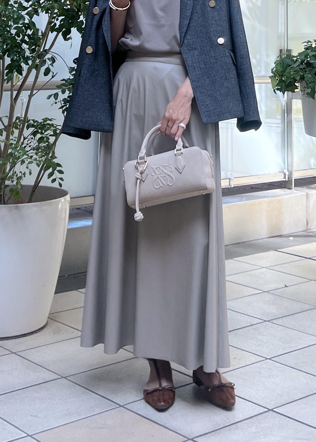 ベージュのワントーンコーデに羽織りをプラスするだけで、秋のお出かけスカートスタイルの完成です◎。