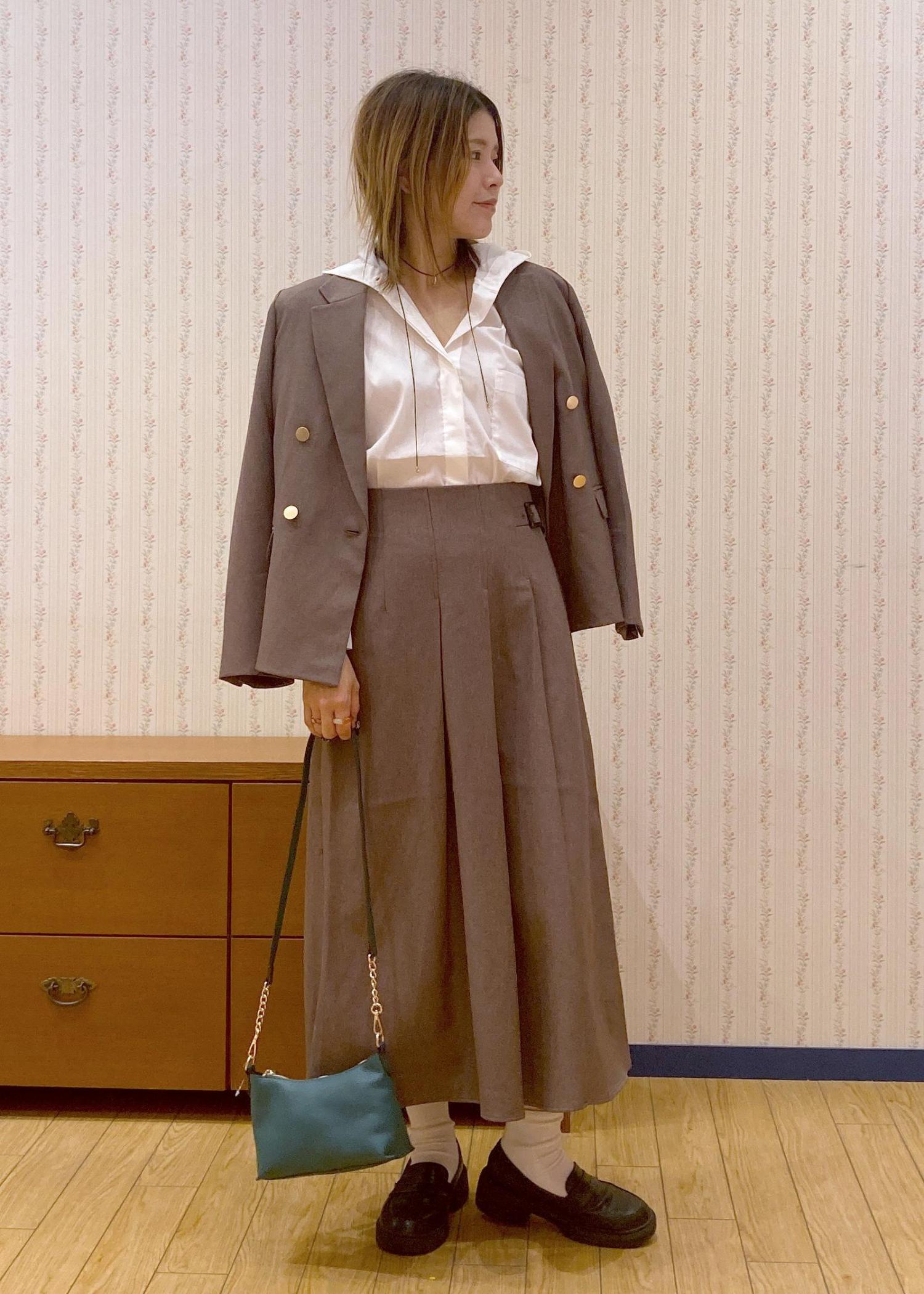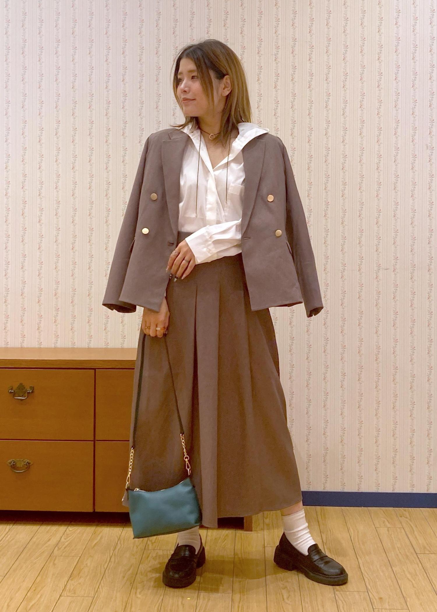 全体をベージュ系でまとめたので、バッグでグリーンの差し色をプラスしたのがポイントです!