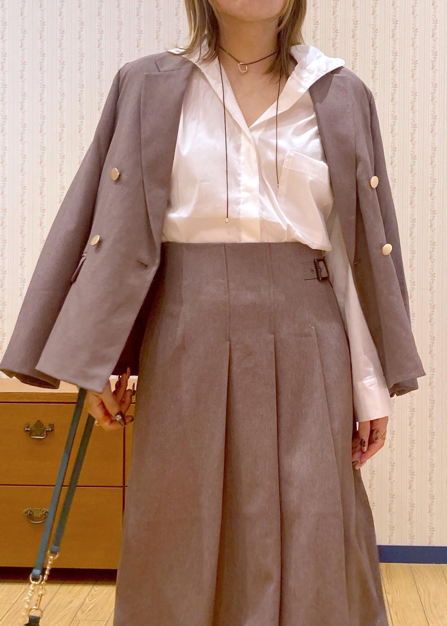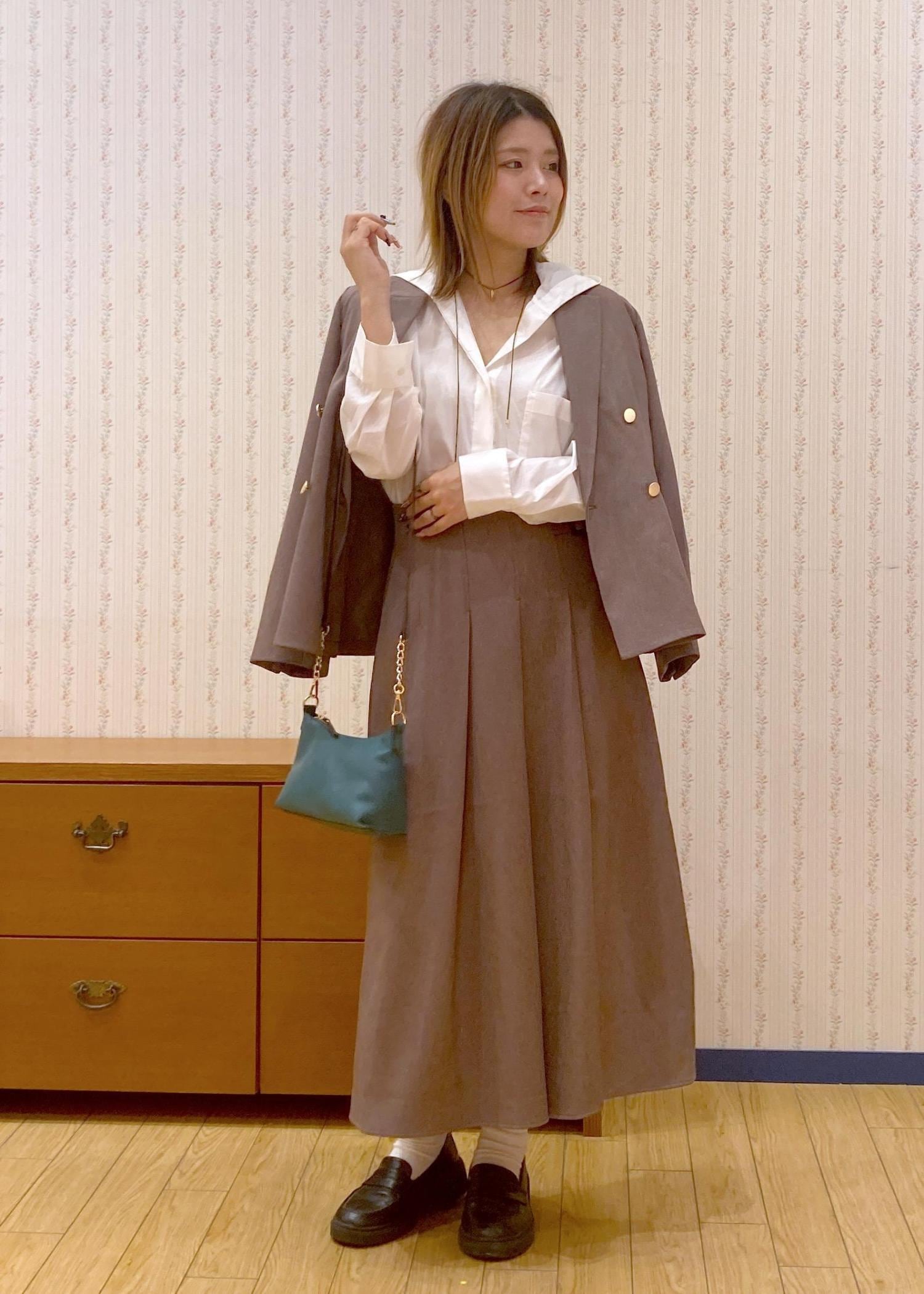 スカートとのセットアップのインナーにフーディーシャツをプラスしたカジュアル要素もあるキレイめコーディネートです。