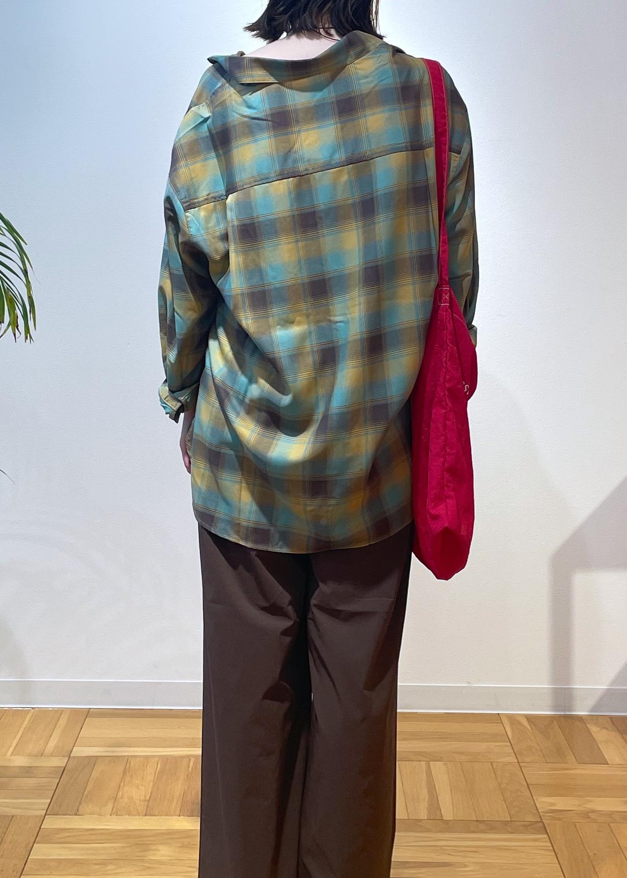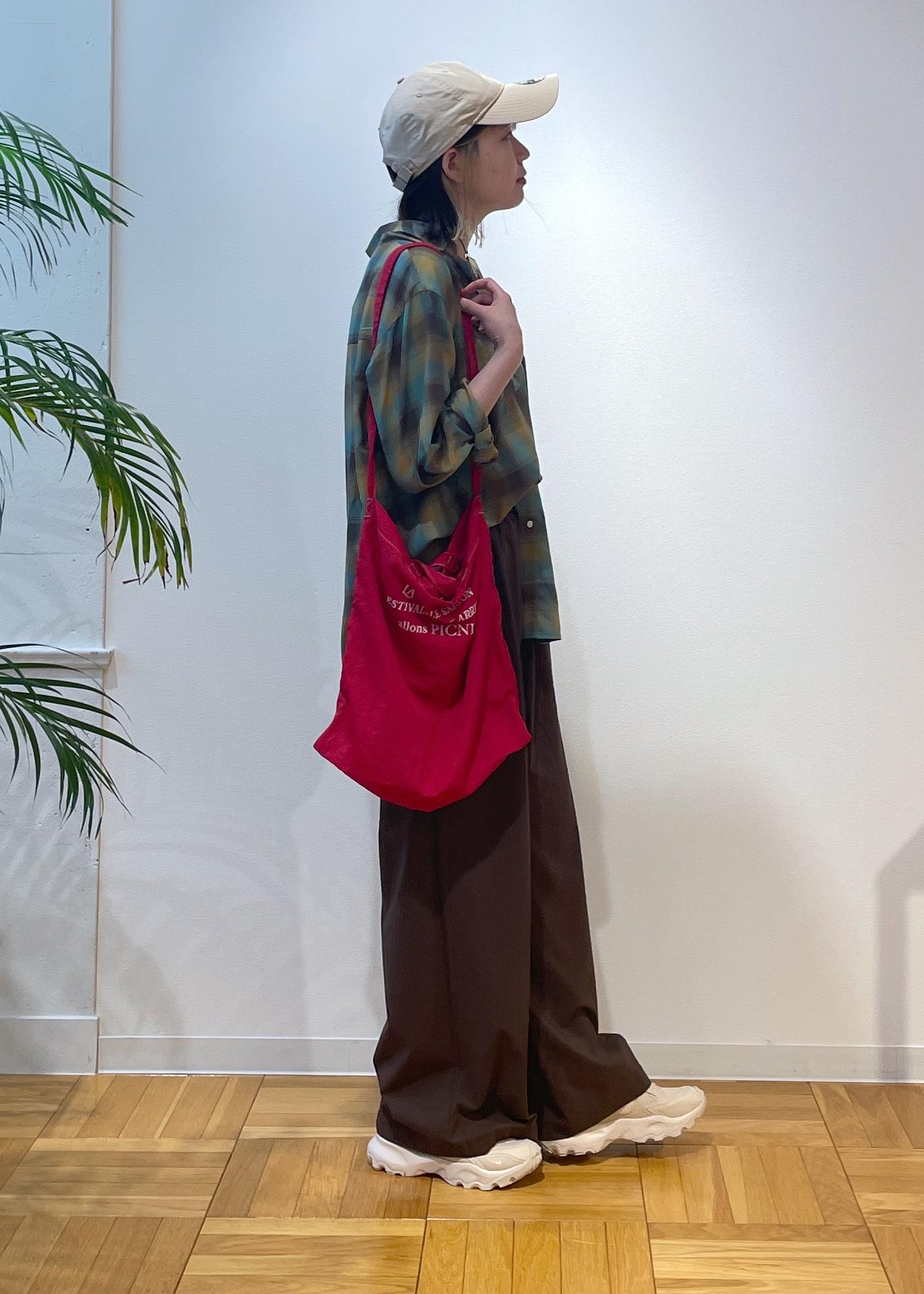 チェック柄が鮮やかなので、ボトムスはカラー系統の近いブラウンとバッグに赤色を合わせてカラー連動♩