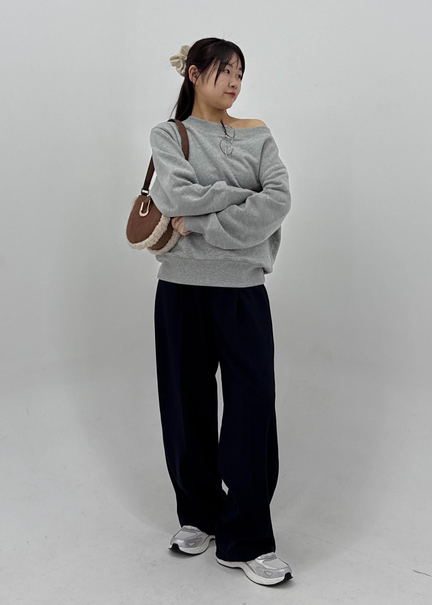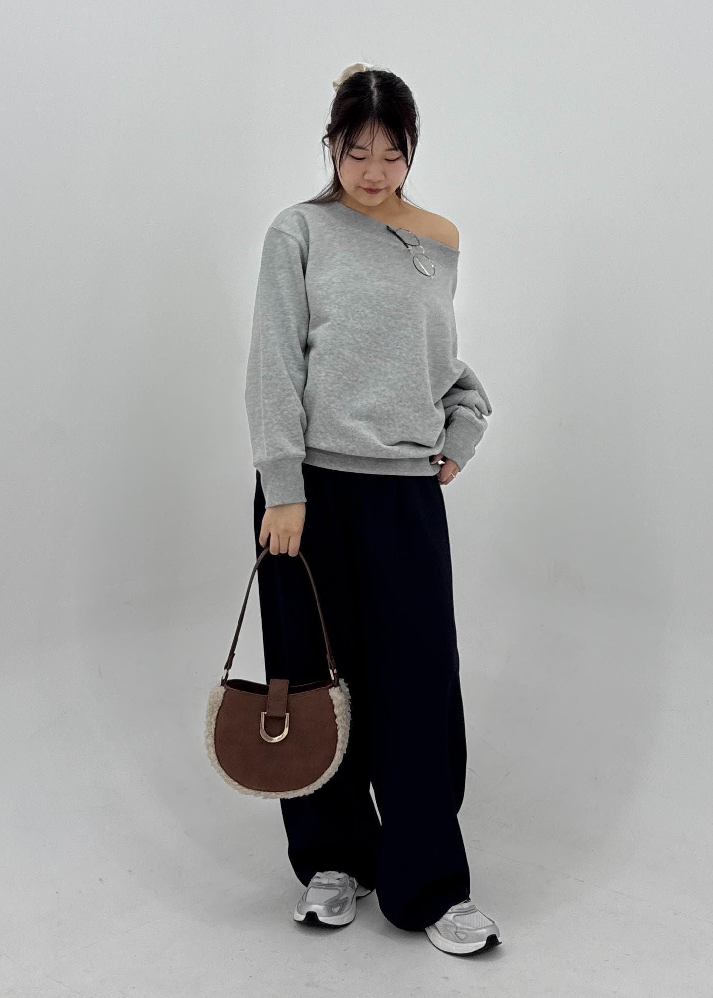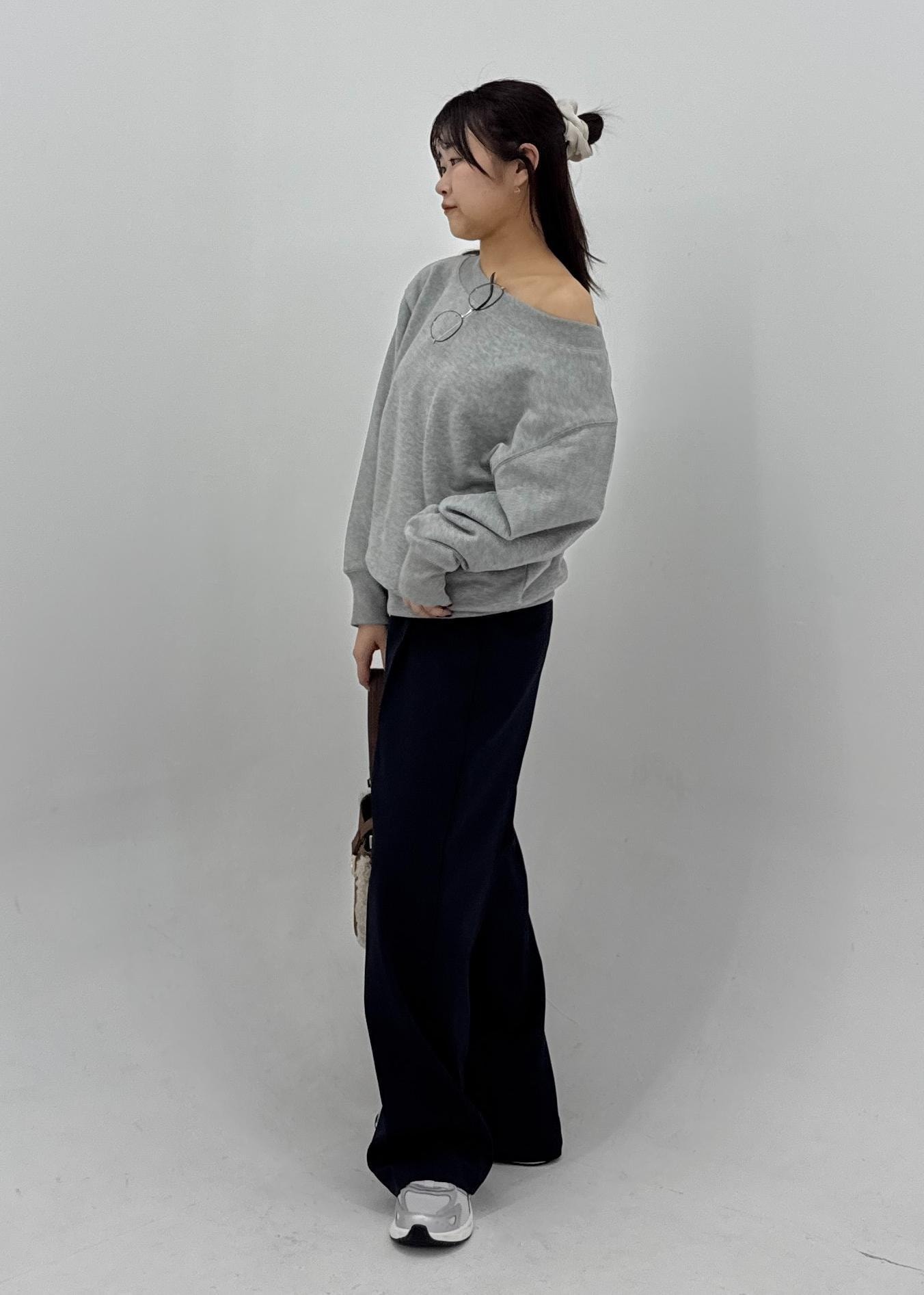 ワンショルとしても使えるスウェットを選び、女性らしさもプラス。