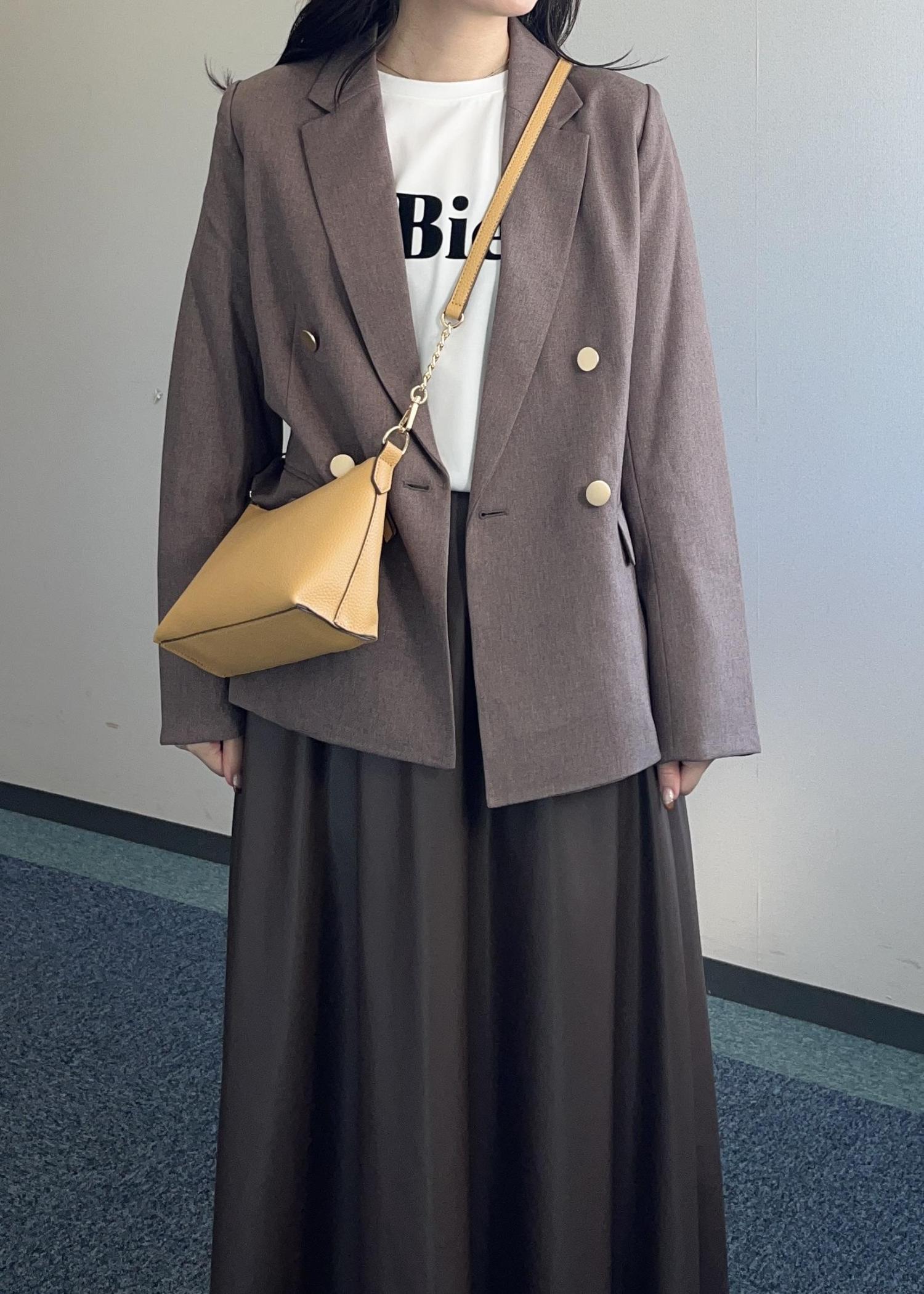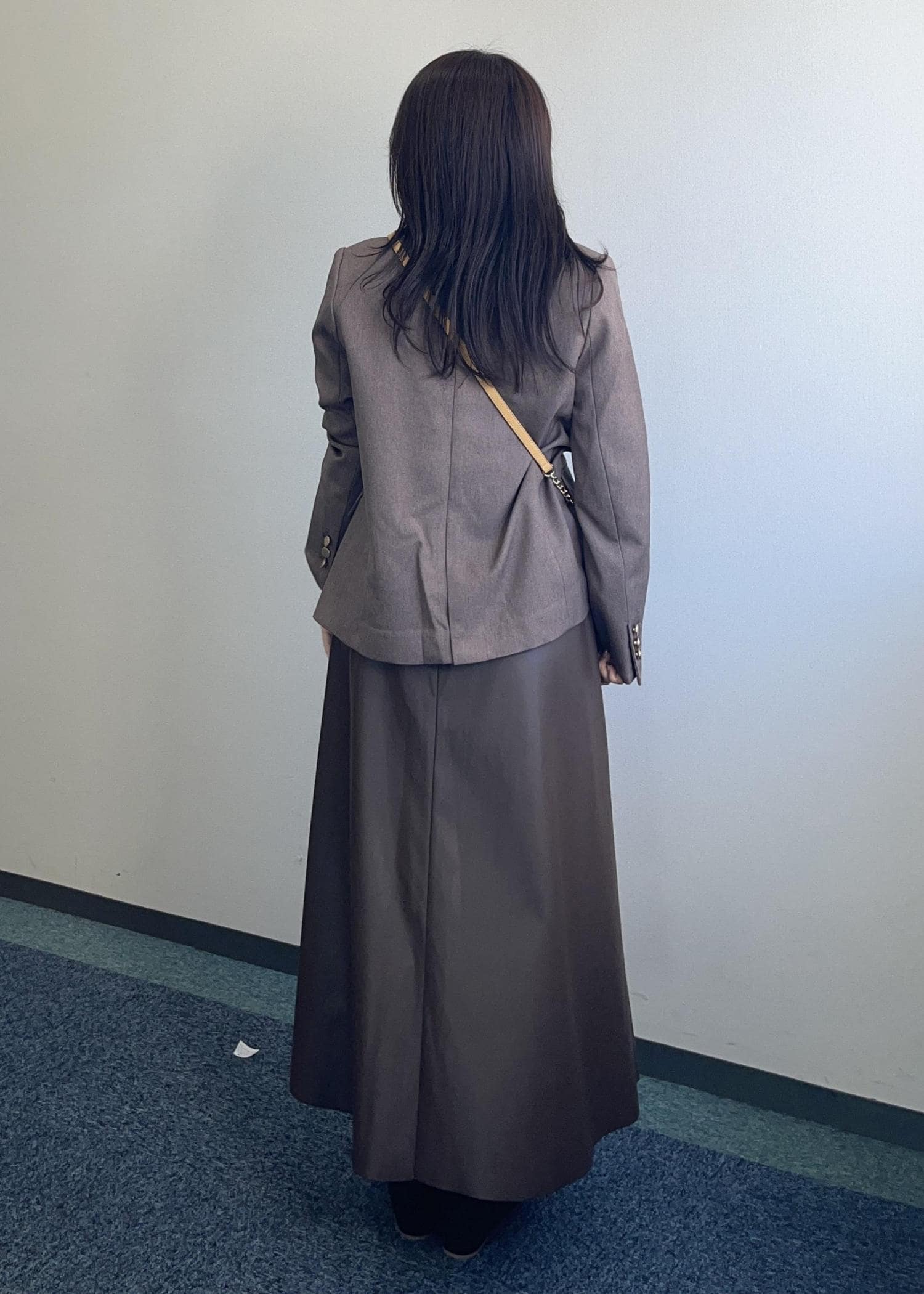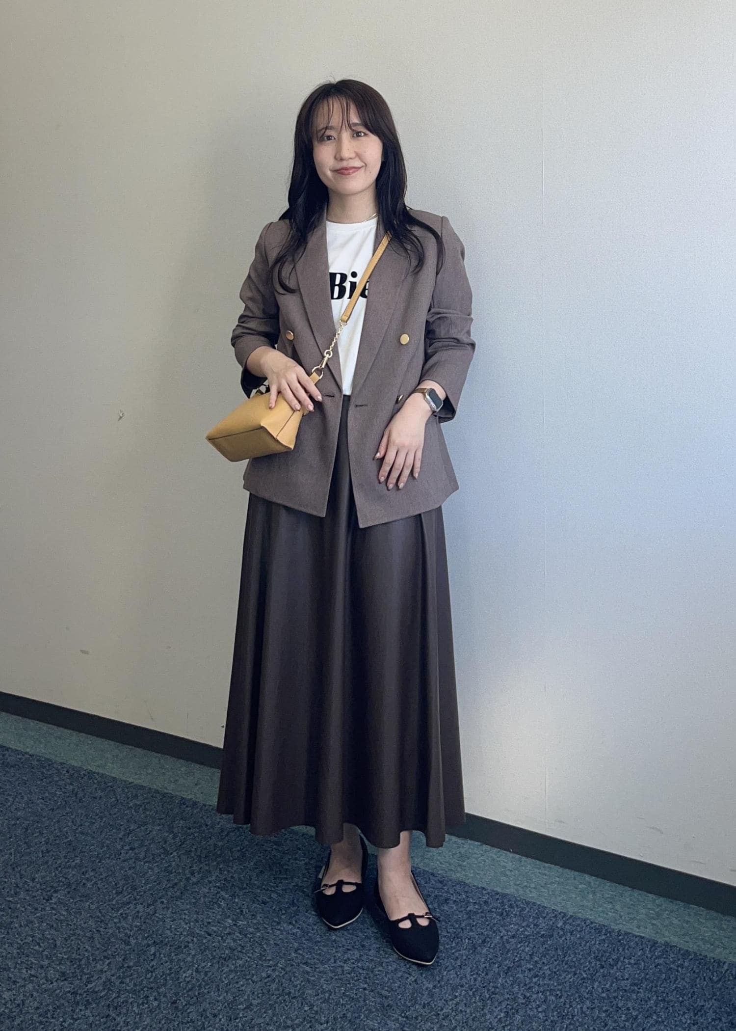 金ボタンジャケットにレザースカートを合わせた綺麗めコーデ。ブラウン系でカラーをまとめバッグのイエローで差し色を入れました。