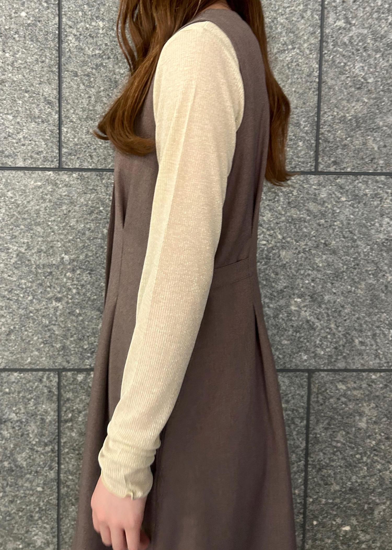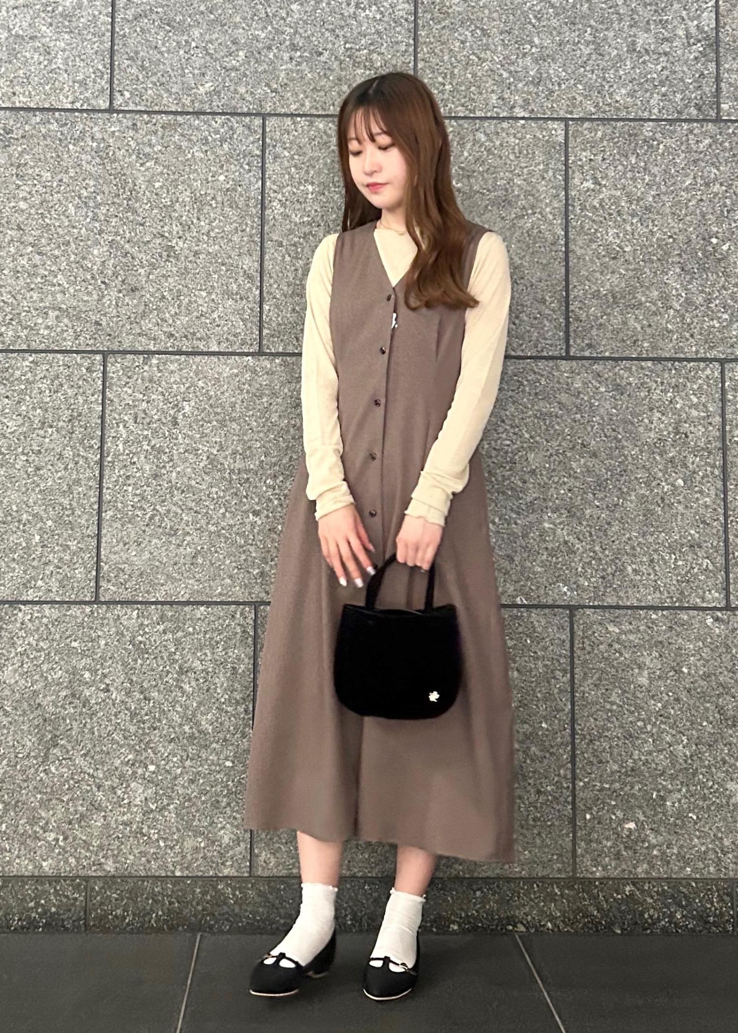 秋らしい暖かみのあるブラウンカラーのワンピースにラメ感のあるシアーのインナーを合わせて、大人らしさのあるコーデに仕上げました!