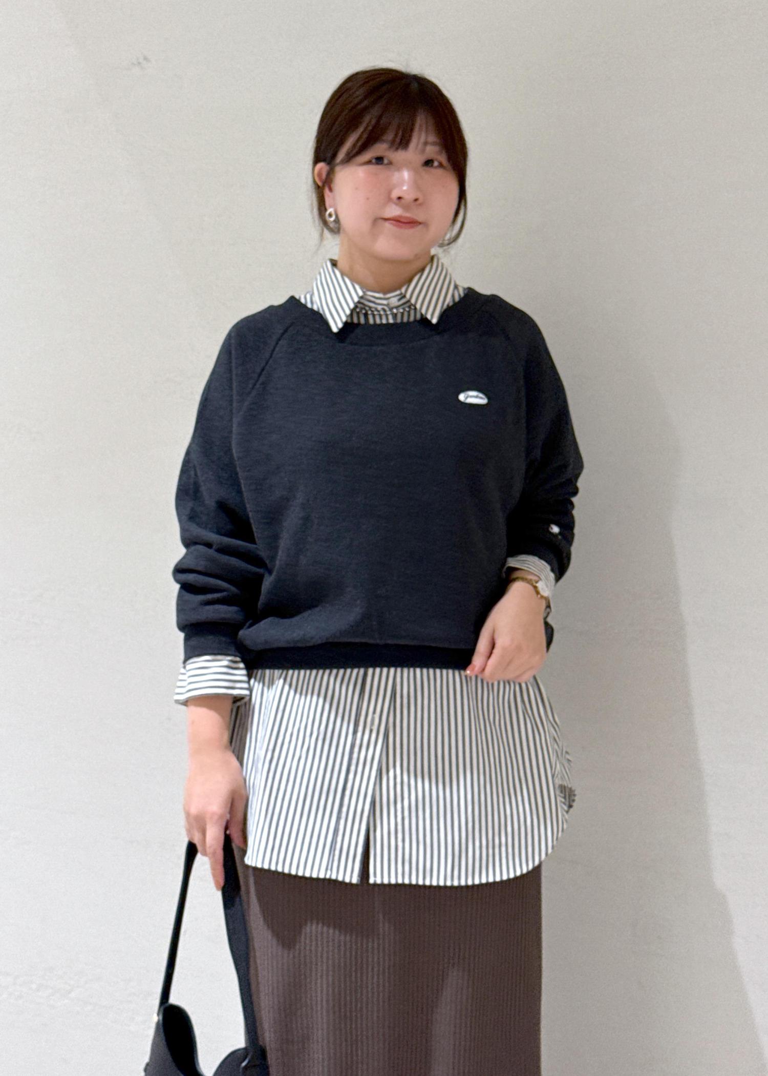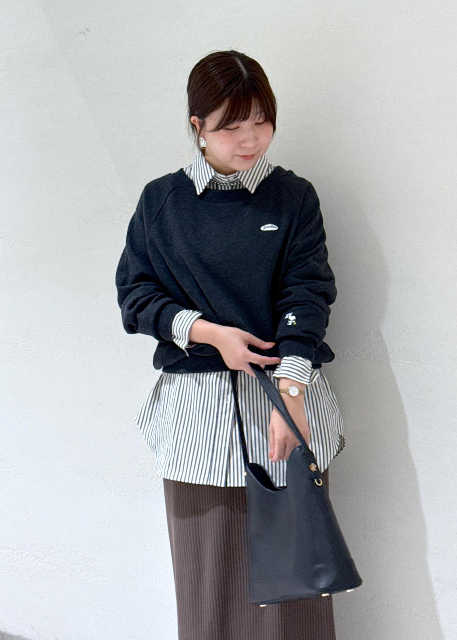 スウェットのインナーにロングシャツをレイヤードしたスタイル。