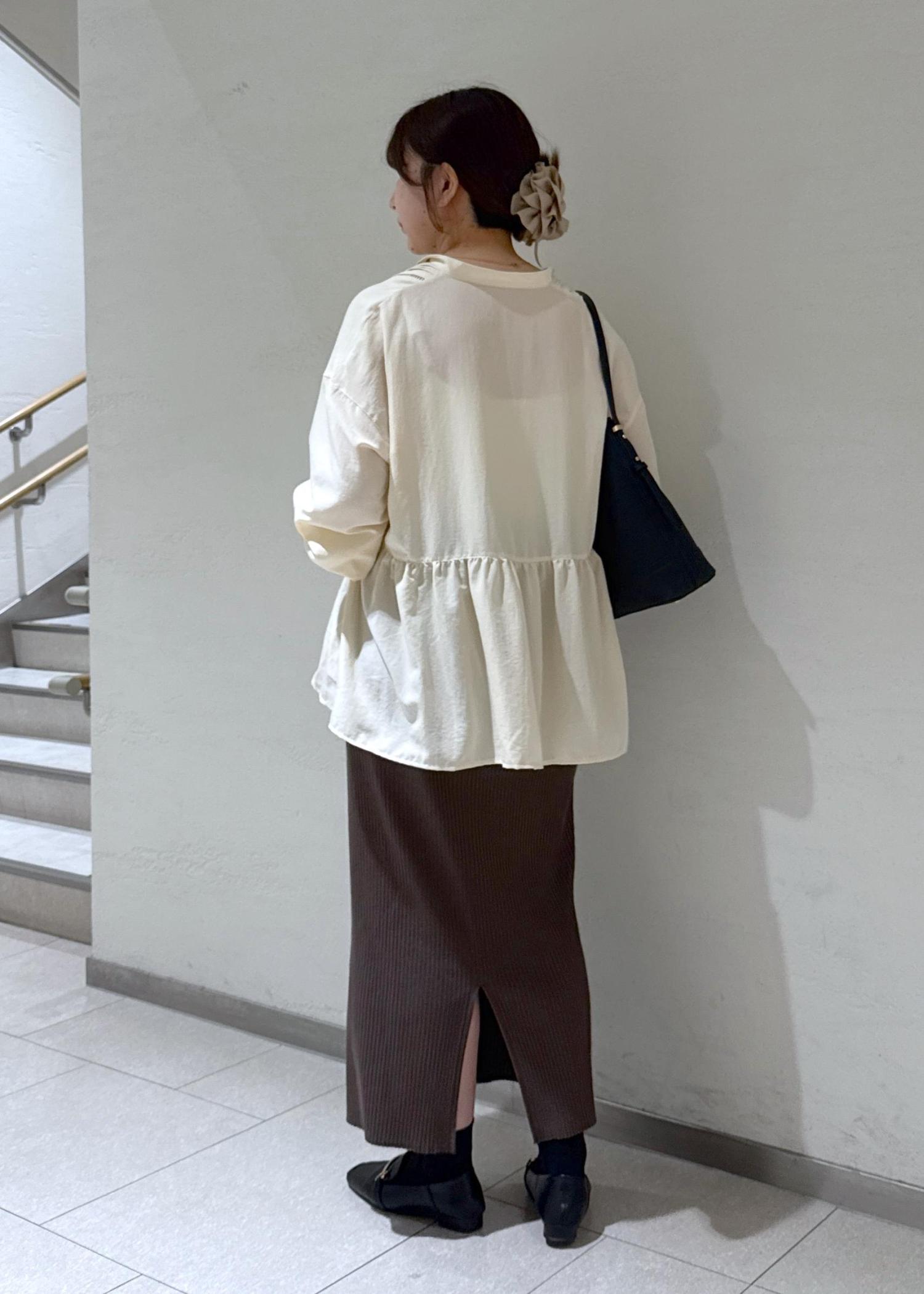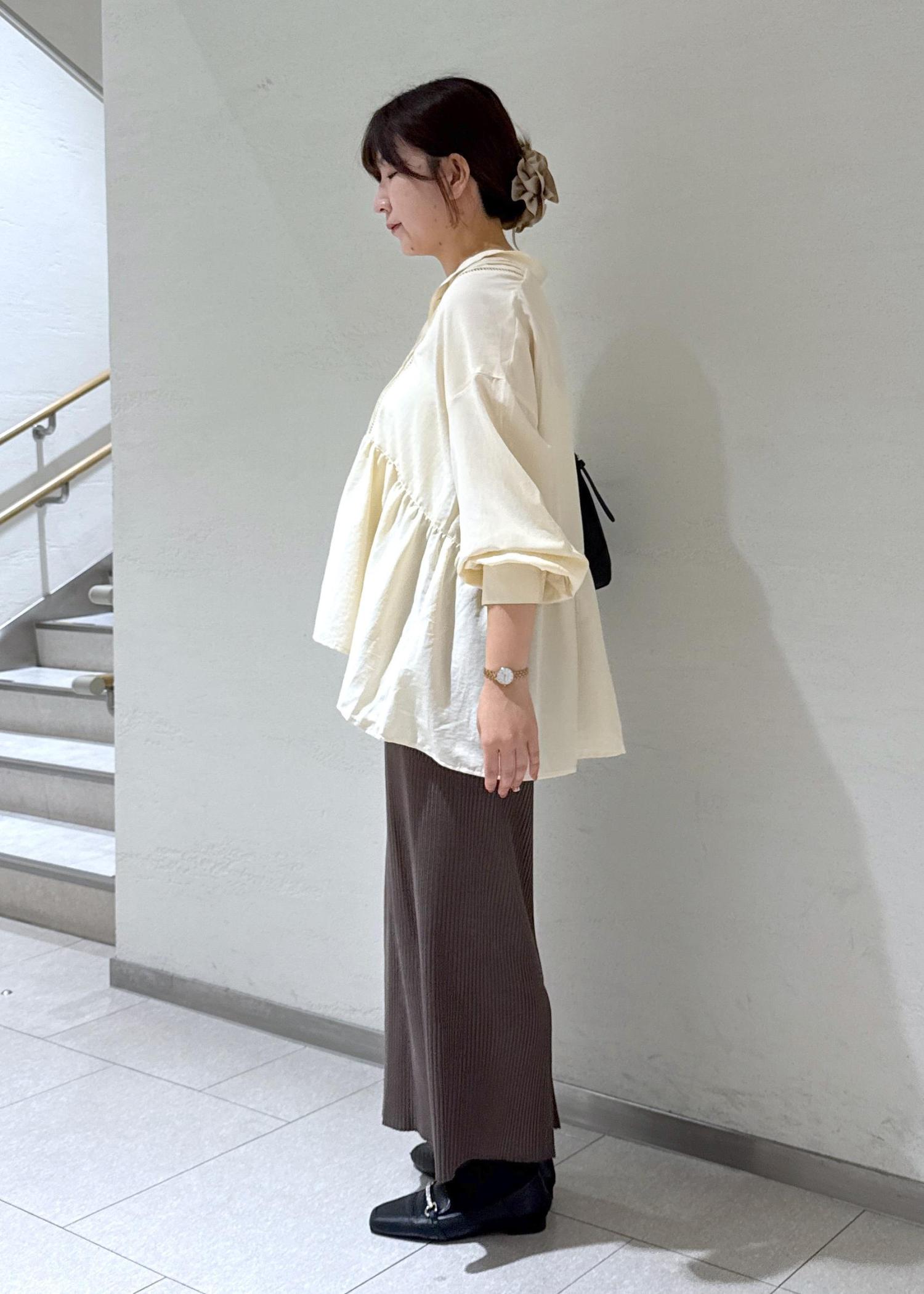 腰周りをカバーできるので、ボトムはスッキリ目で合わせるとバランスよく体型カバーできます。 -