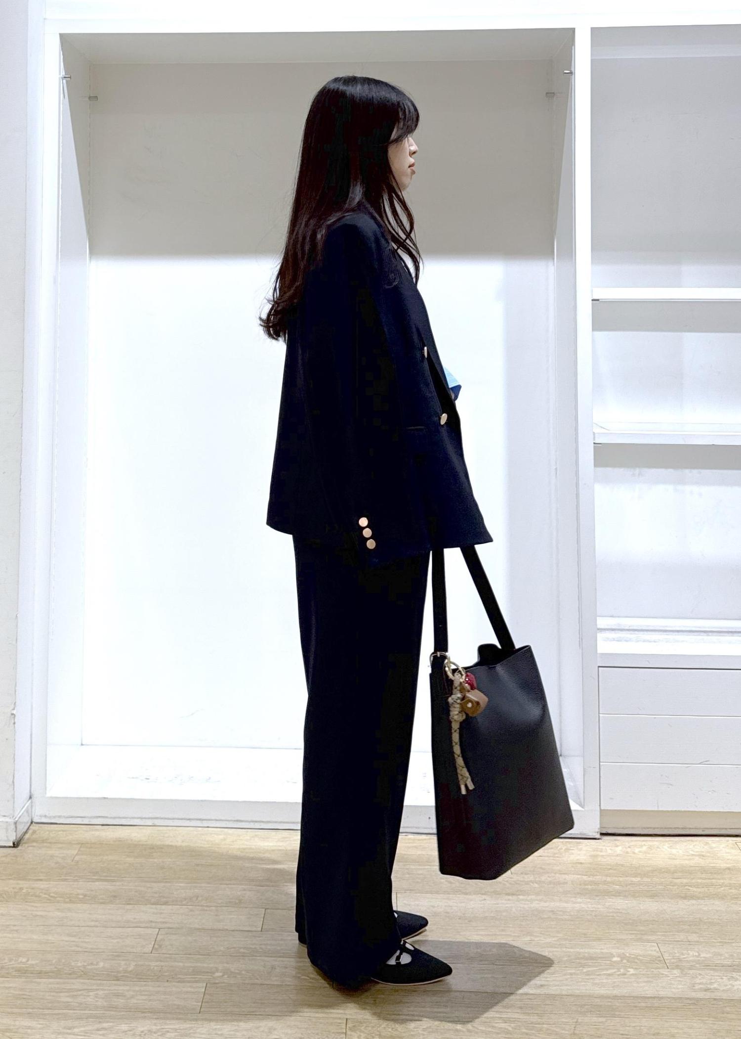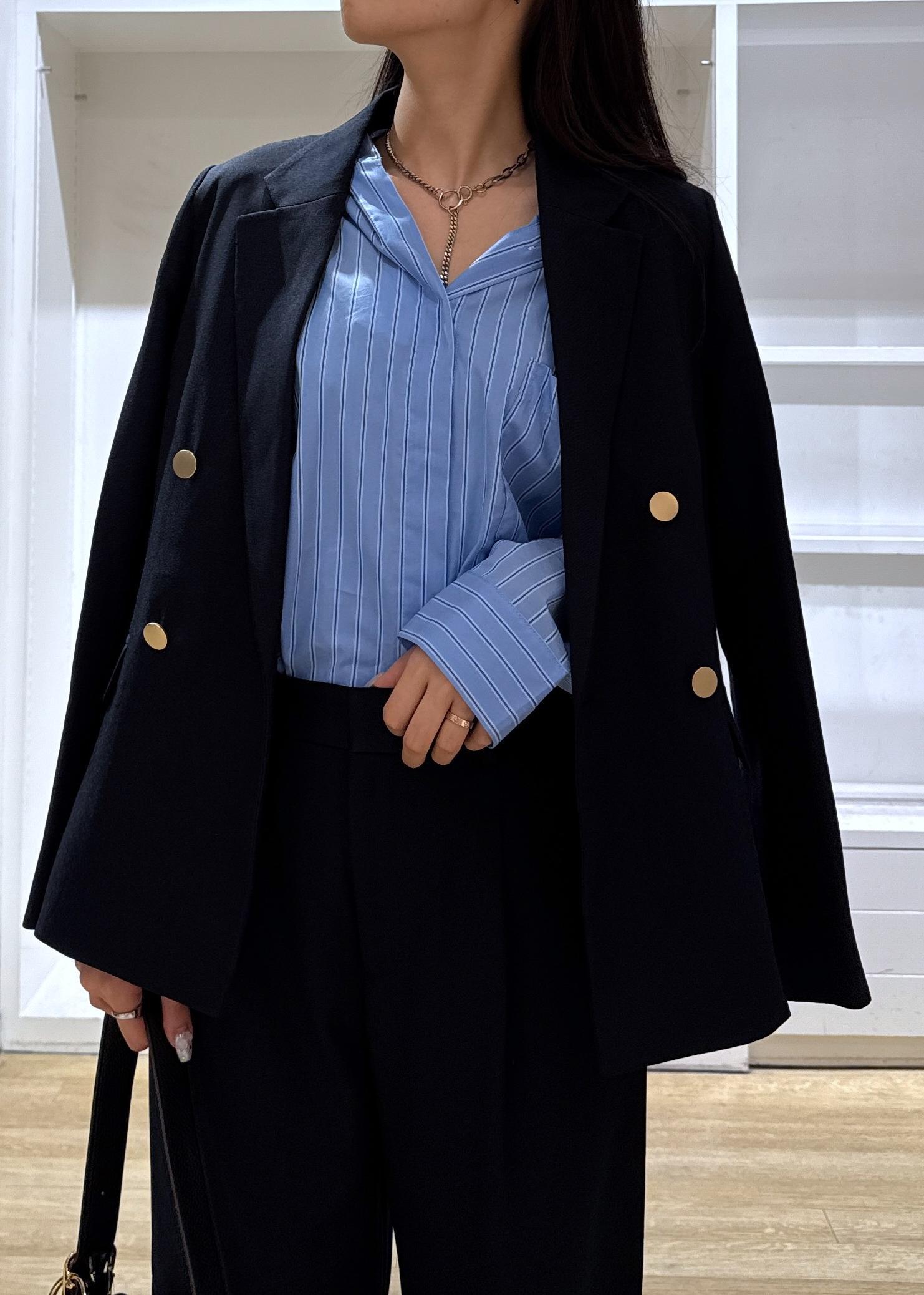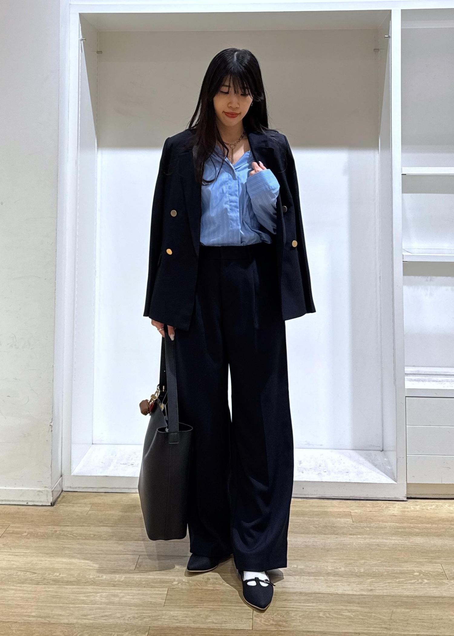 パンツとジャケットのセットアップを使ったコーデを組んでみました!アクセントにブルーのシャツを持ってくる事で、明るいオシャレ見えするのでおすすめです♪