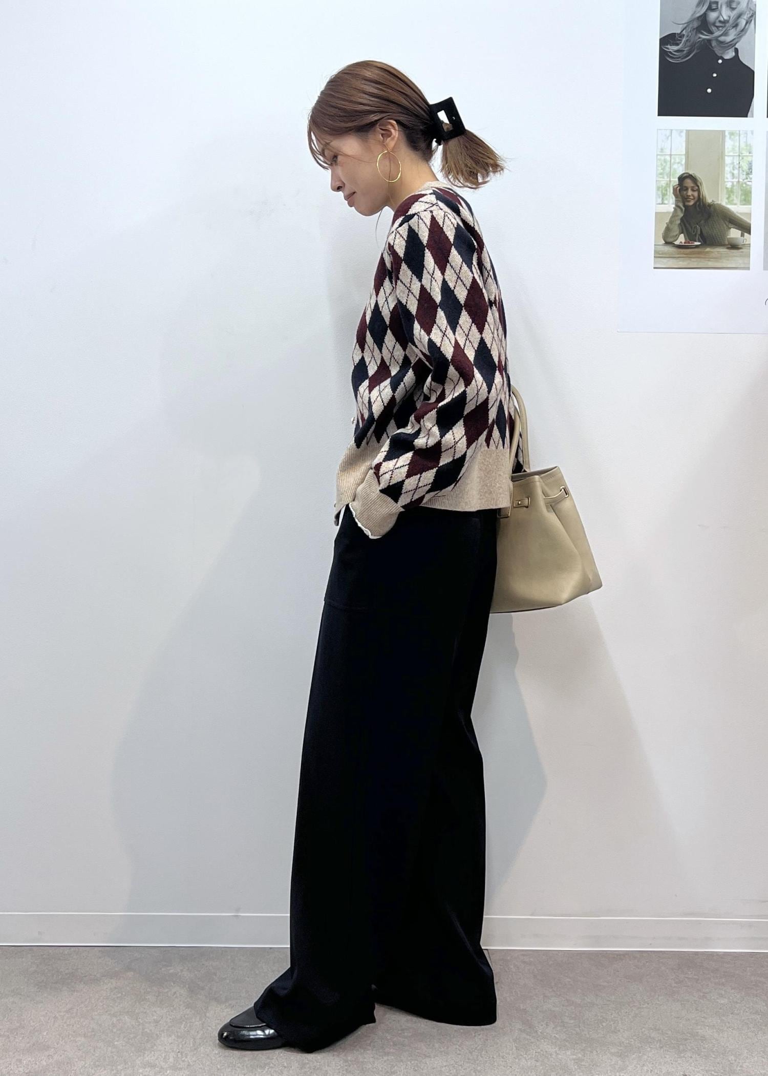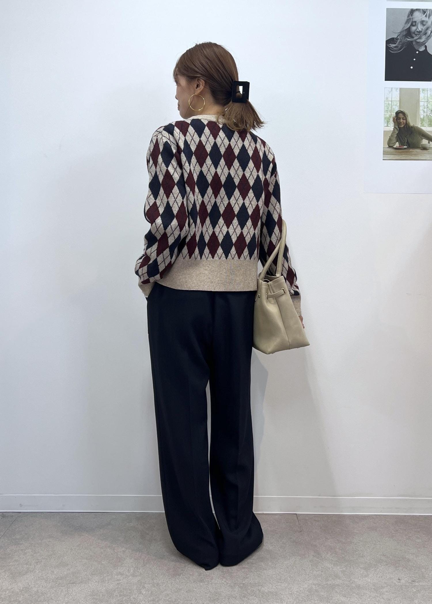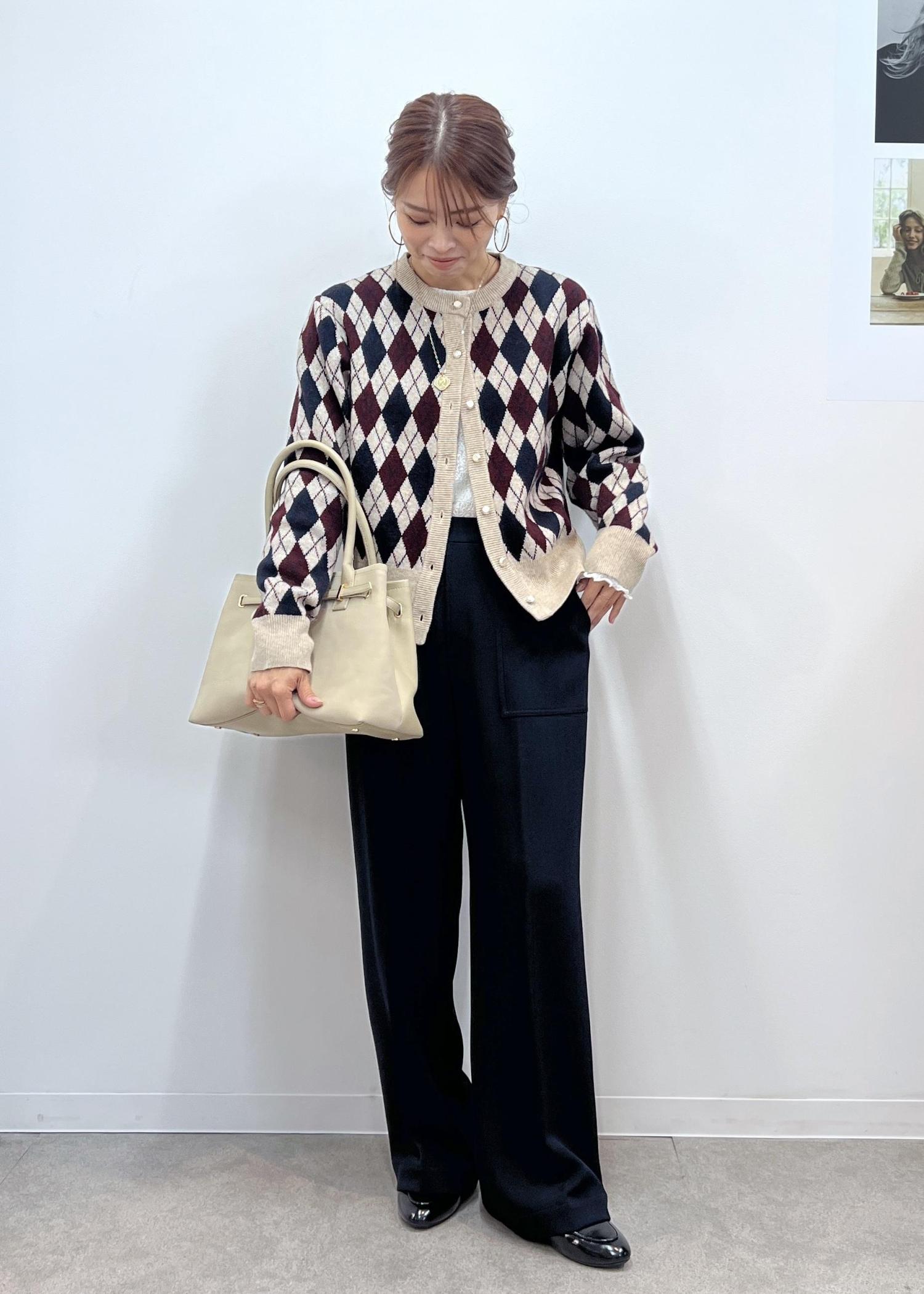 カーディガンは下のボタンを開けて少し抜け感をプラスするのもポイント◎。