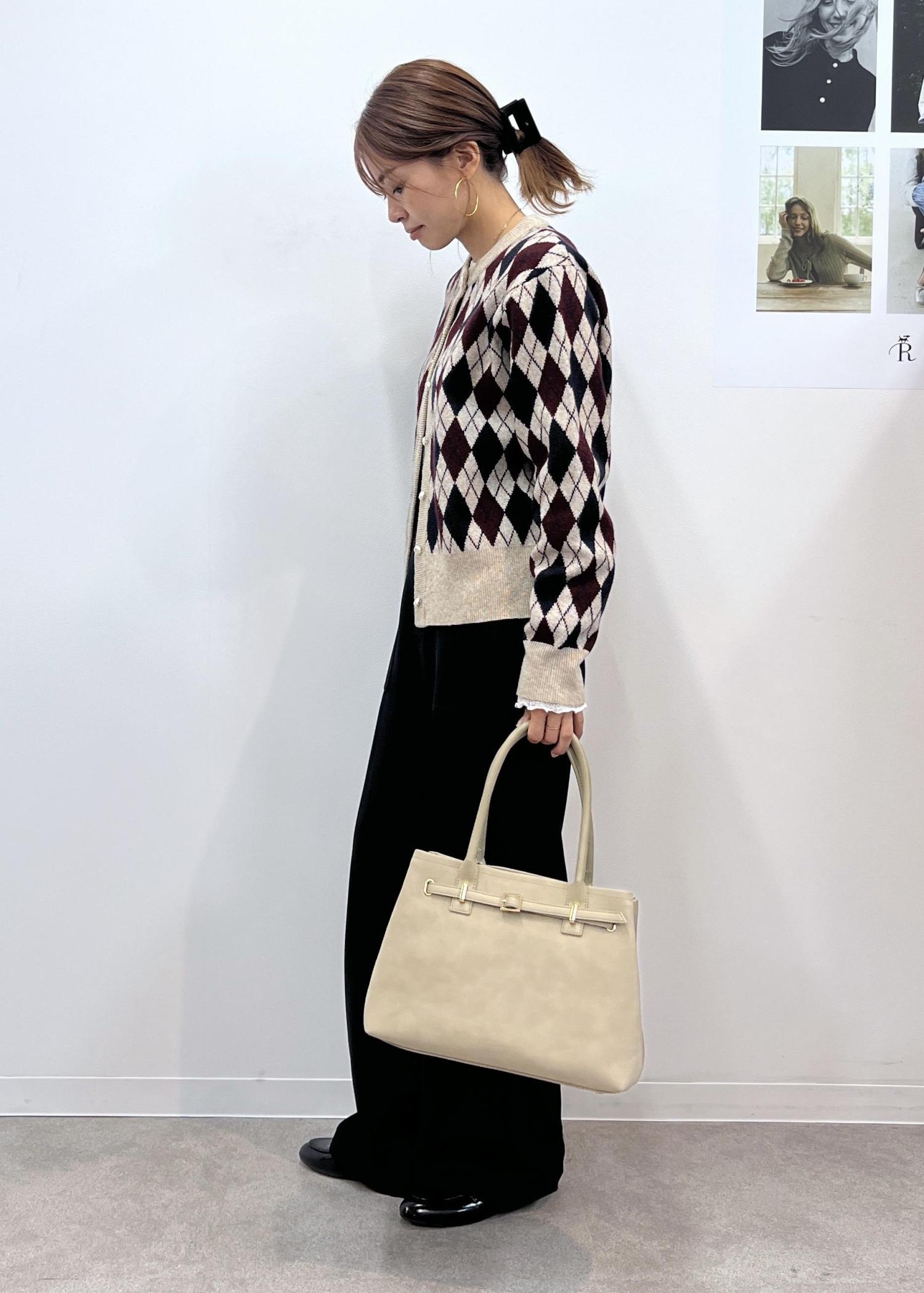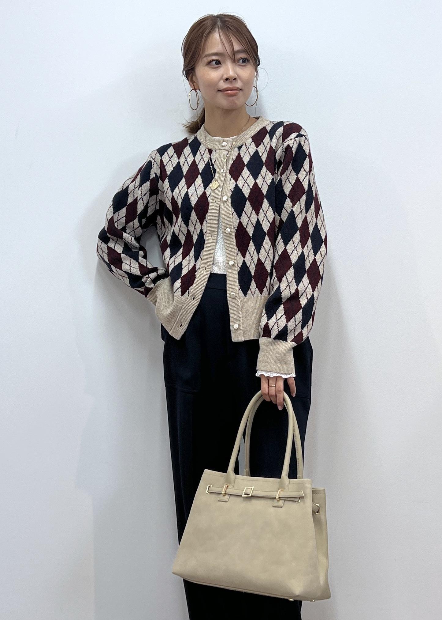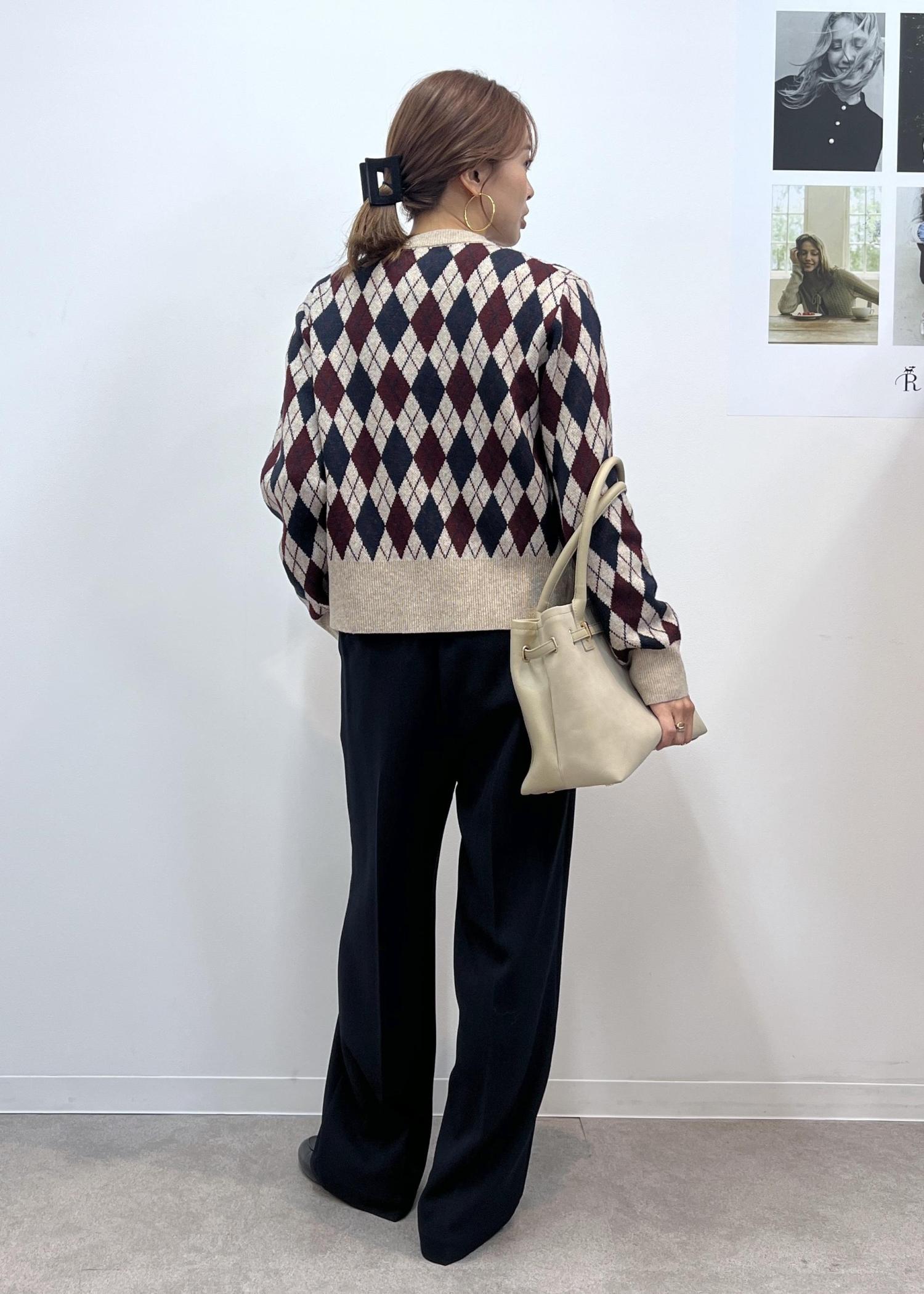 カーディガンは下のボタンを開けて少し抜け感をプラスするのもポイント◎。